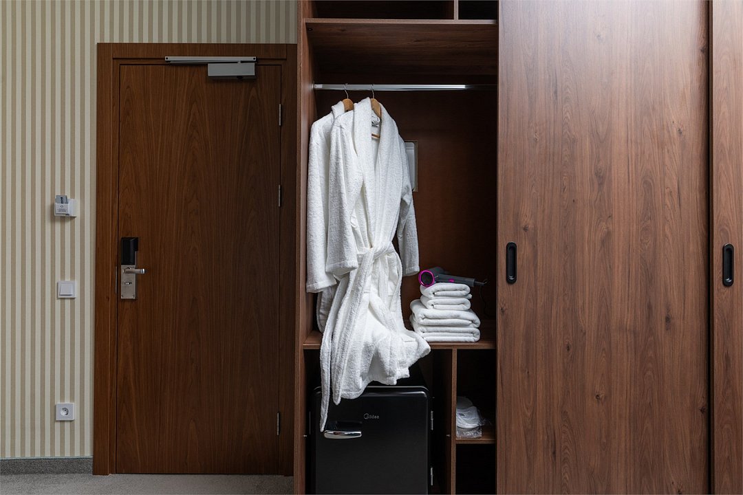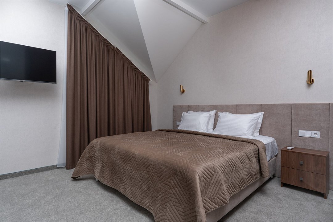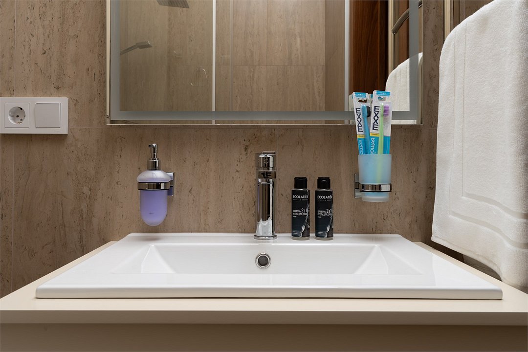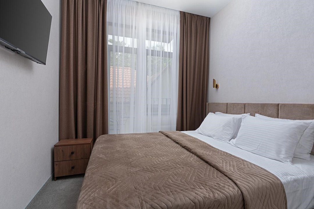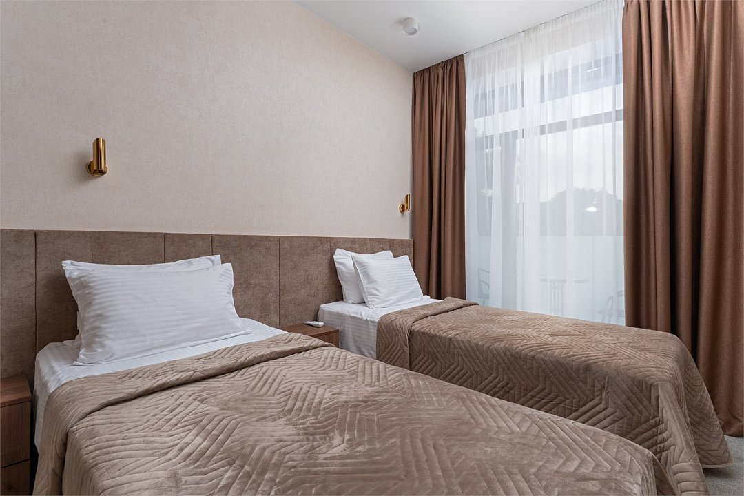 Двухместный однокомнатный номер с балконом, расположен на 1 этаже. В номере: двуспальная кровать, односпальный диван, телевизор, мини-бар (без наполнения), сплит-система, сейф, шкаф для одежды, wi-fi. В ванной: душевая кабина, зеркало с подсветкой, набор полотенец, косметические и гигиенические принадлежности, халат, фен, тапочки.Услуги и удобства