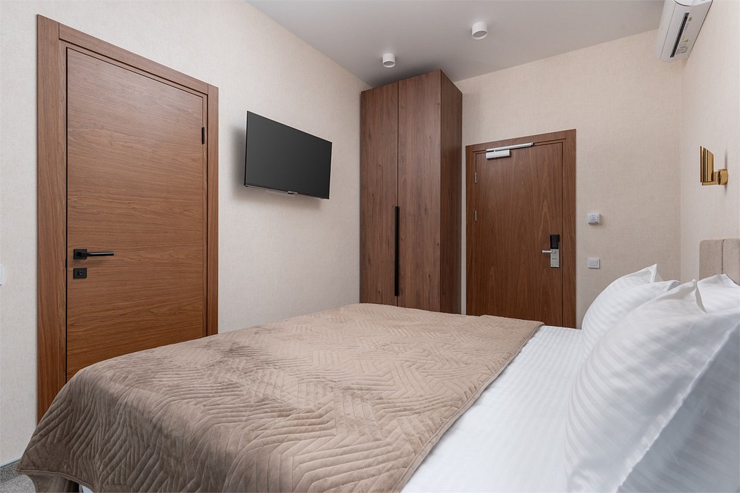 Двухместный однокомнатный номер с балконом, расположен с 1 по 4 этаж. В номере: двуспальная кровать, телевизор, мини-бар (без наполнения), сплит-система, сейф, шкаф для одежды, wi-fi. В ванной: душевая кабина, зеркало с подсветкой, набор полотенец, косметические и гигиенические принадлежности, халат, фен, тапочки.Услуги и удобства