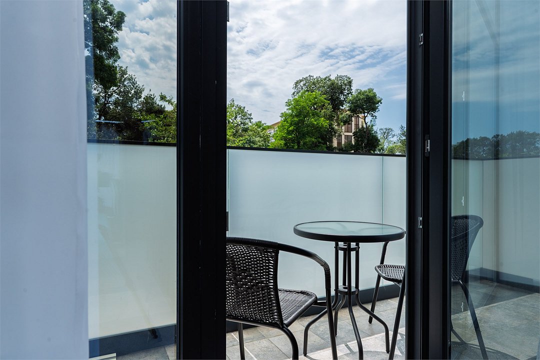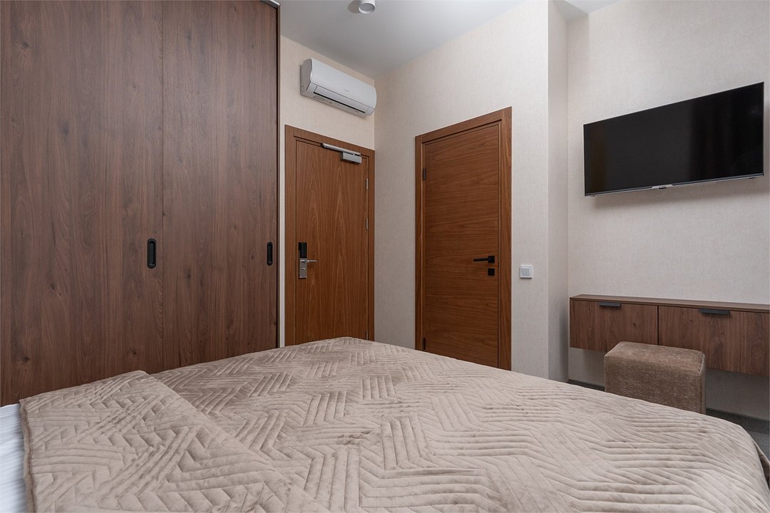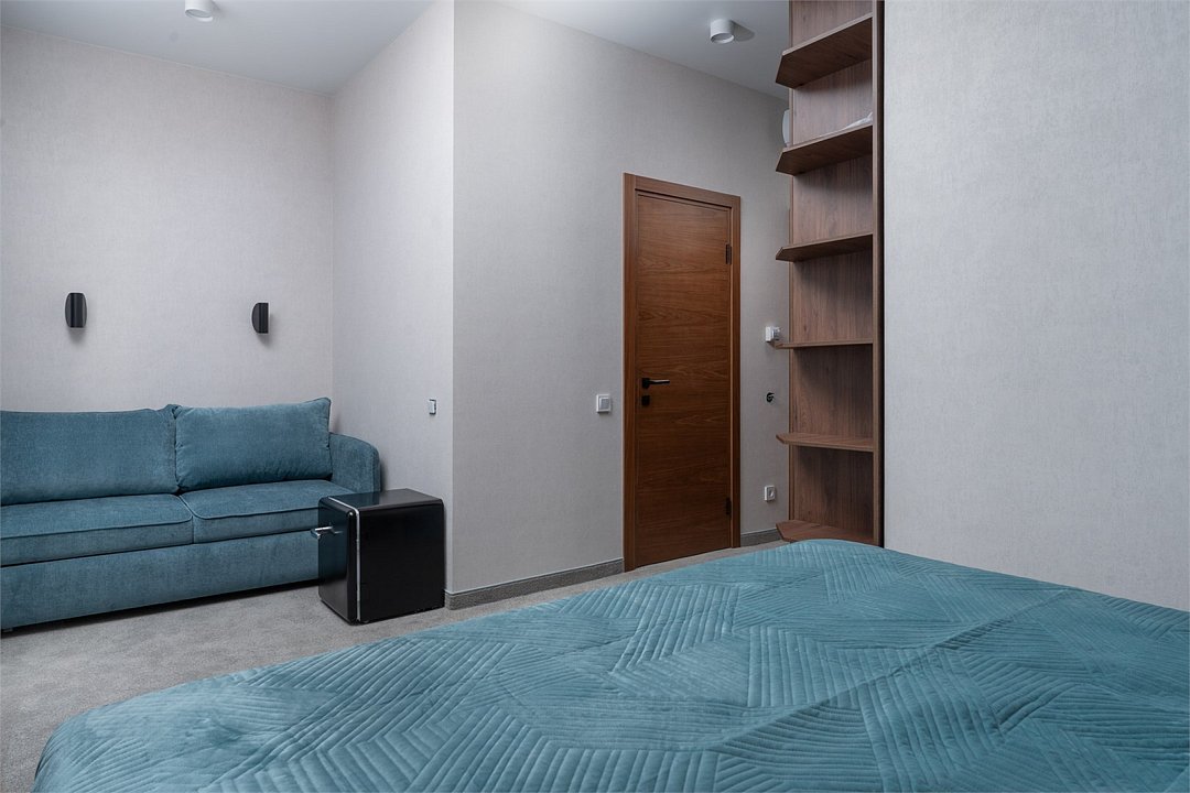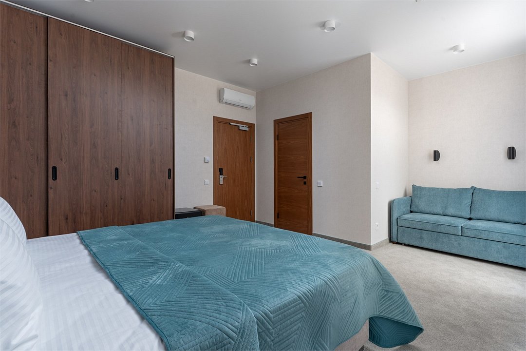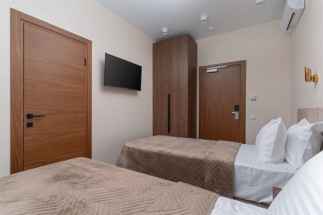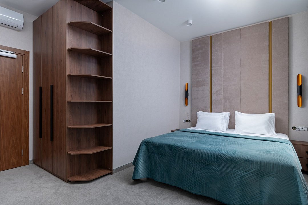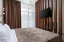 Двухместный однокомнатный номер с балконом, расположен с 1 по 4 этаж. В номере: двуспальная кровать, двуспальный диван, телевизор, мини-бар (без наполнения), сплит-система, сейф, шкаф для одежды, wi-fi. В ванной: душевая кабина, зеркало с подсветкой, набор полотенец, косметические и гигиенические принадлежности, халат, фен, тапочки.Услуги и удобства