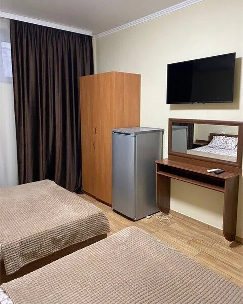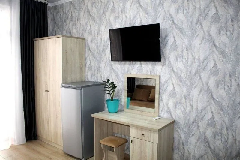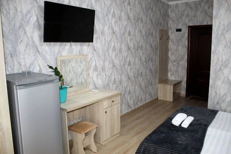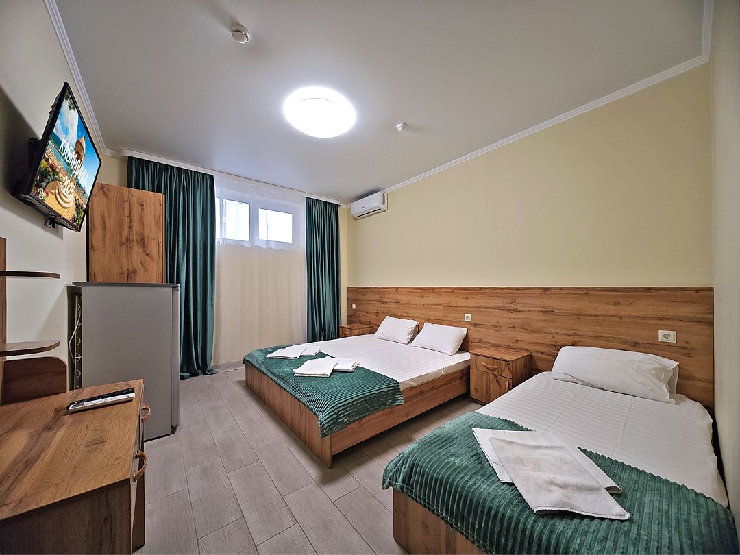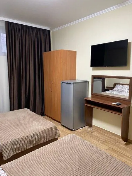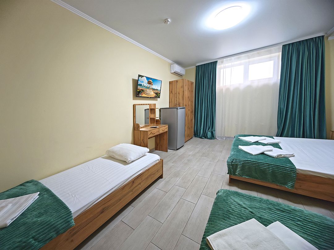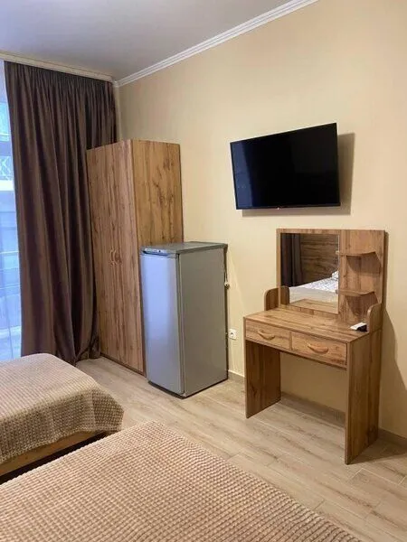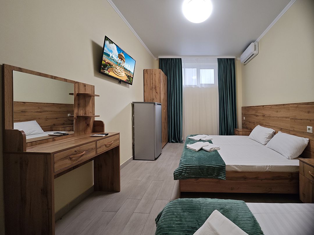 В номере новый ремонт, свой СУ с душевой, раковиной и унитазом, кондиционер, холодильник, телевизор, wifi, шкаф, тумбочки.