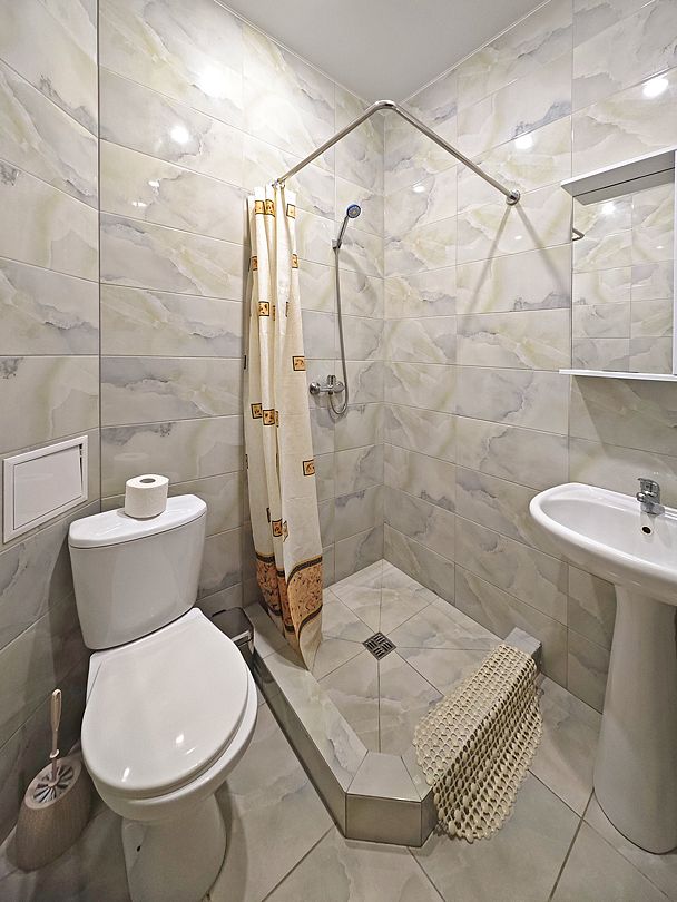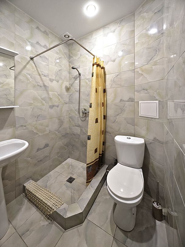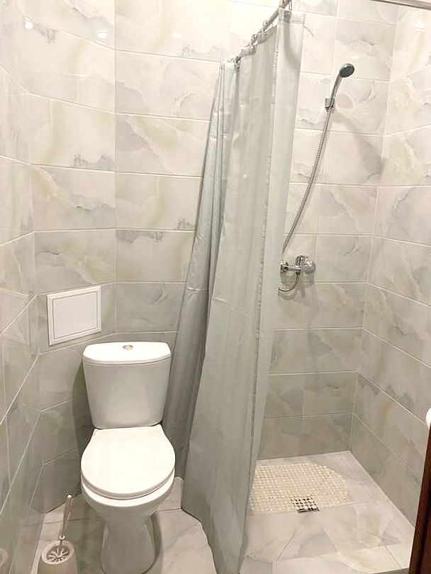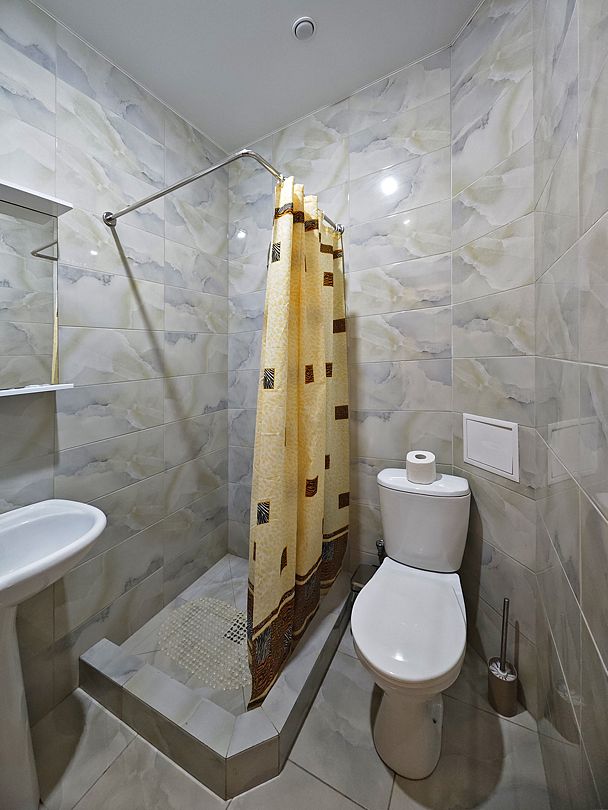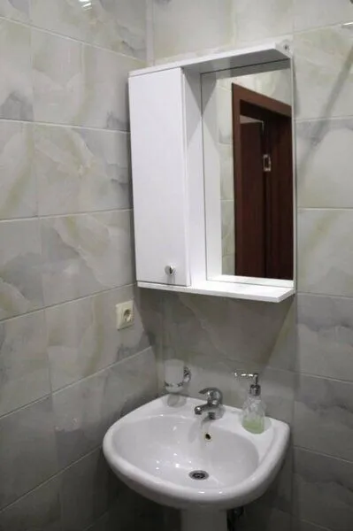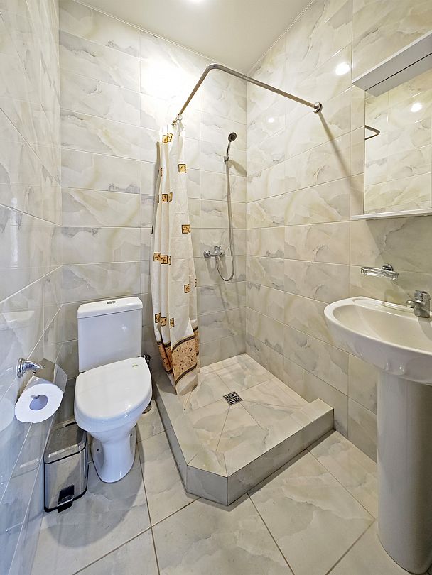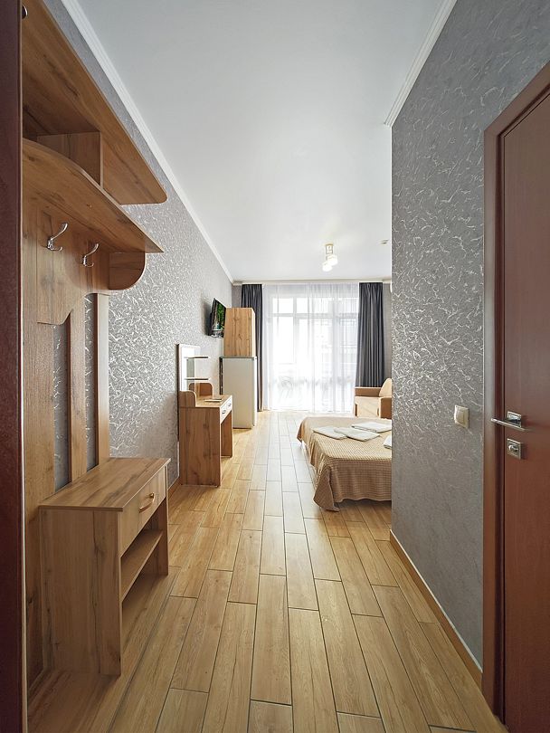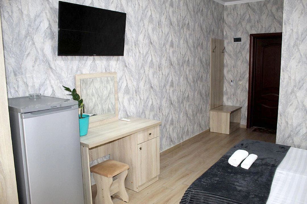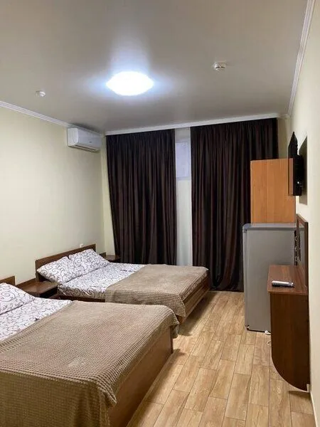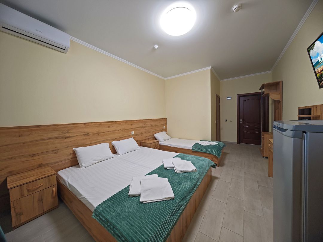 В номере новый ремонт, свой СУ с душевой, раковиной и унитазом, кондиционер, холодильник, телевизор, wifi, шкаф, тумбочки.