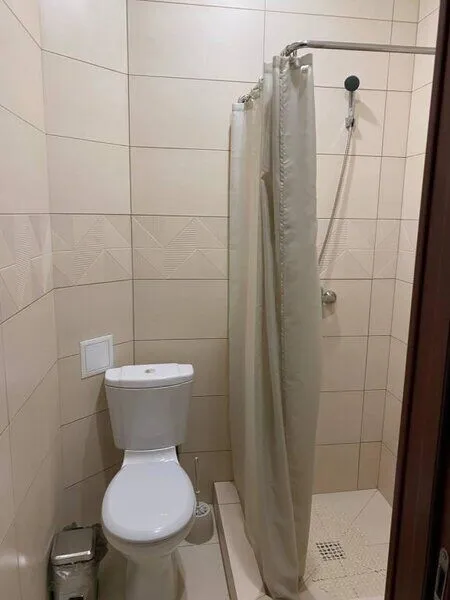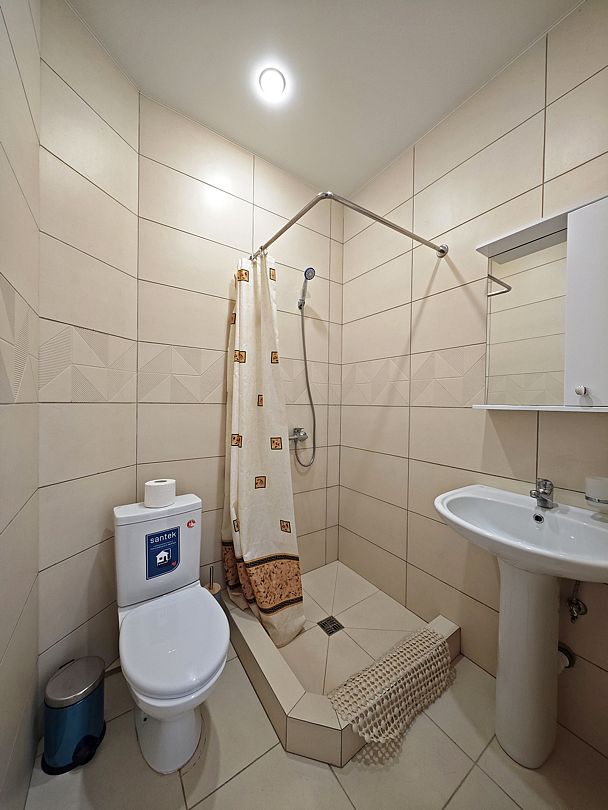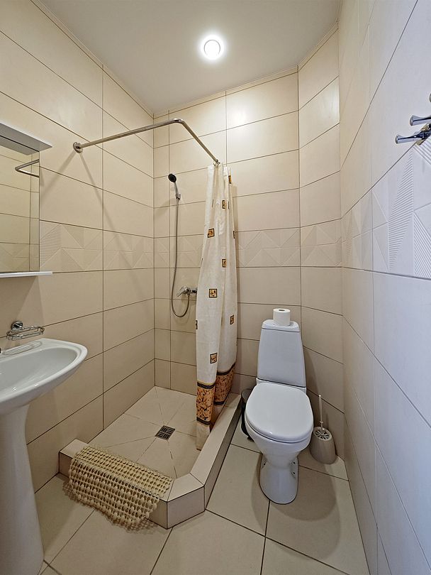 Свой СУ с душевой, раковиной и унитазом, кондиционер, холодильник, телевизор, wifi.