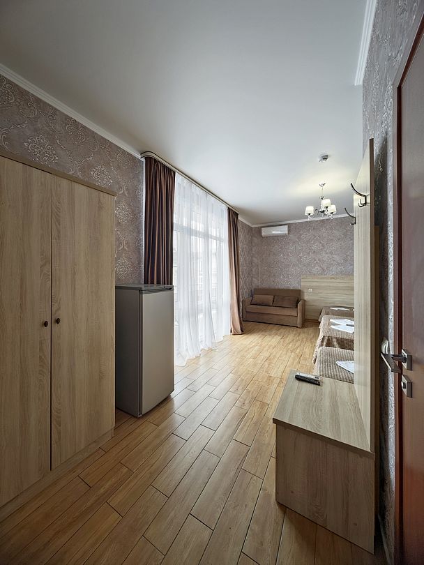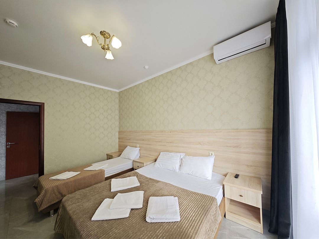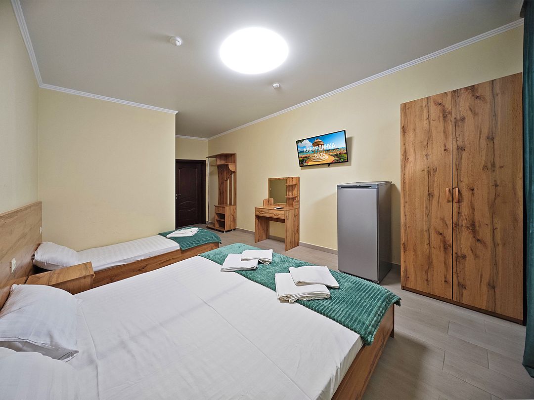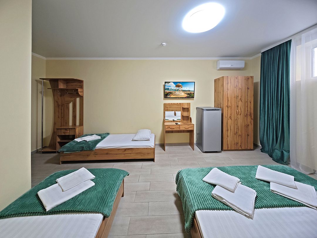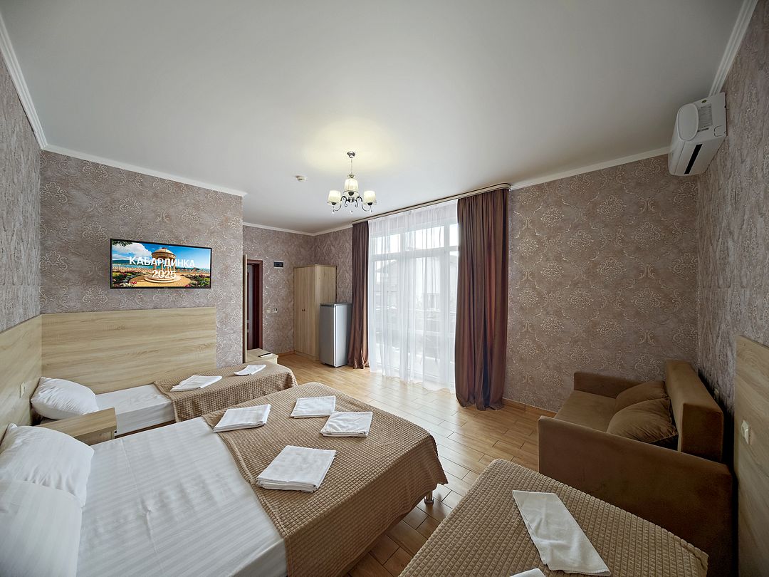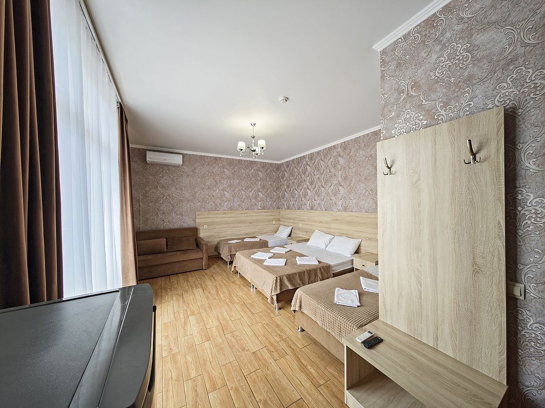 Просторный улучшенный номер с 2-мя основными и 2-мя дополнительными спальными местами на 1 этаже без балкона. Новый ремонт, новая мебель и техника.