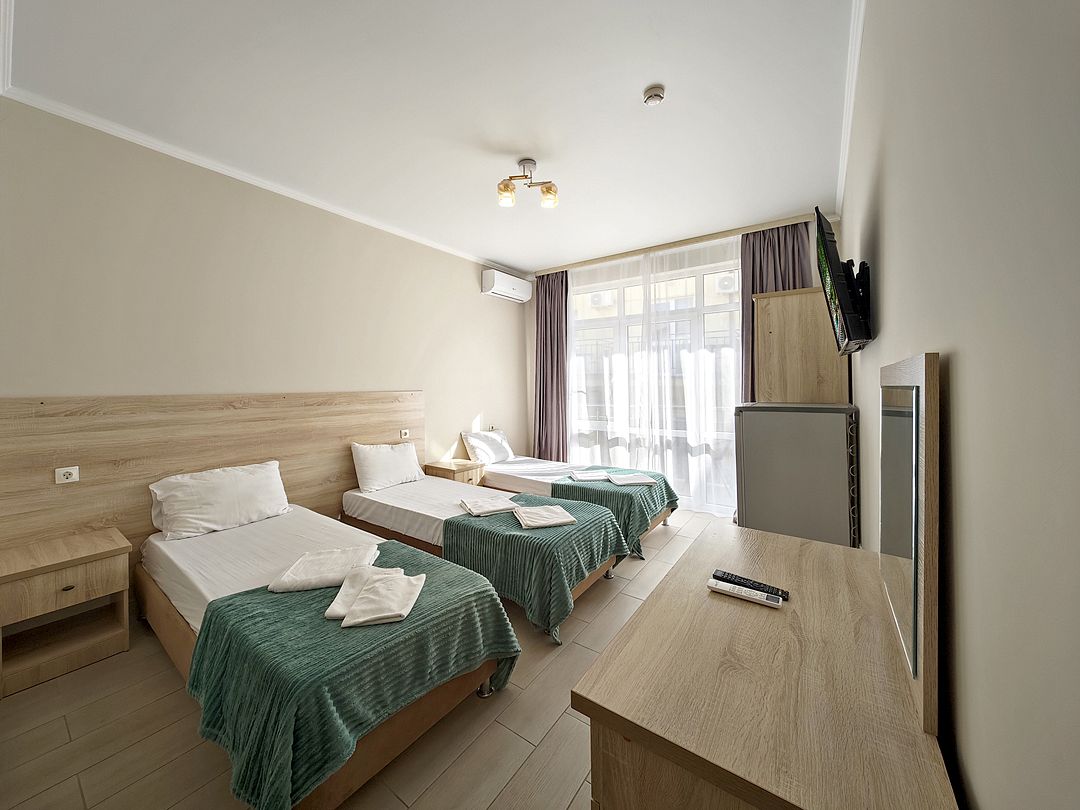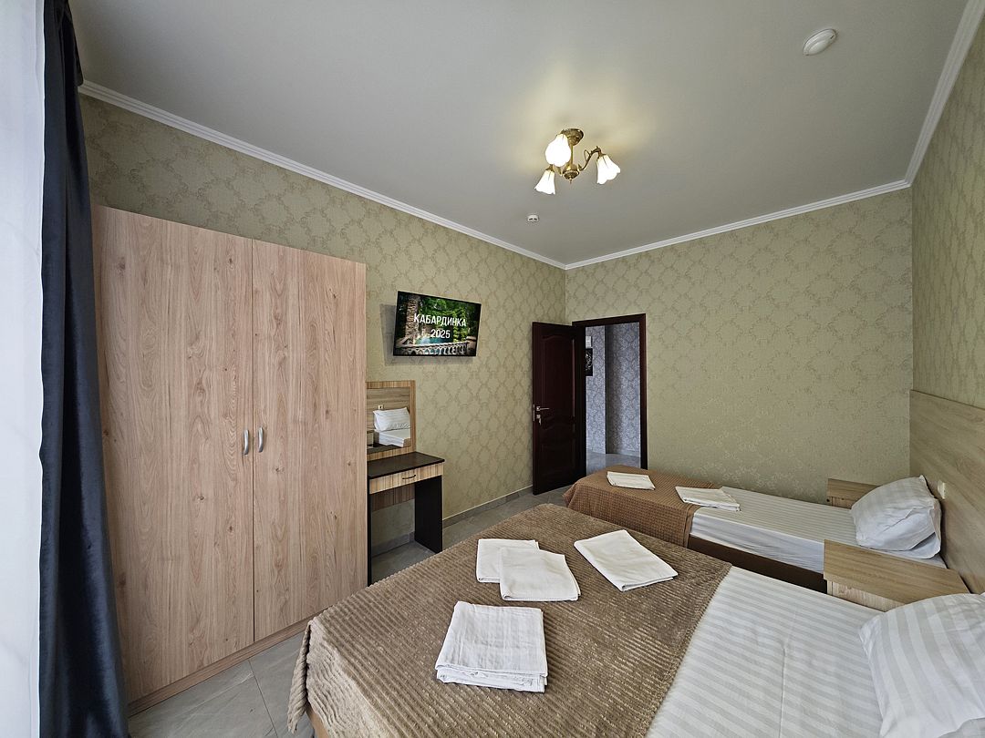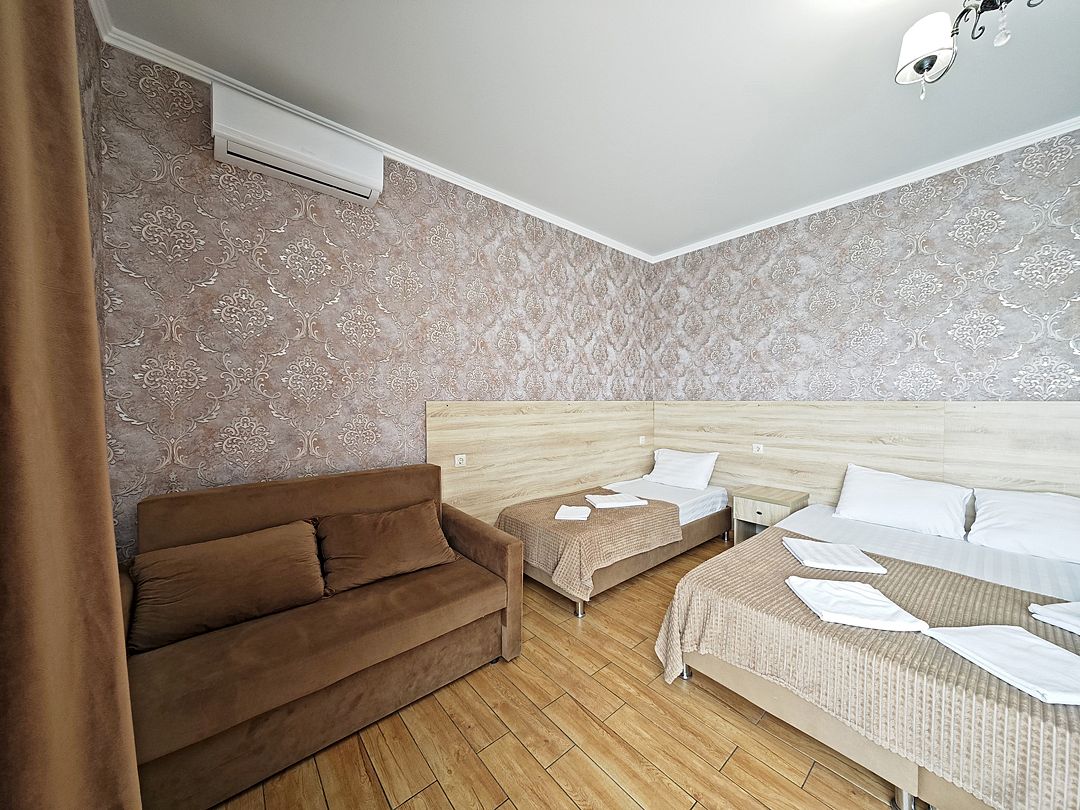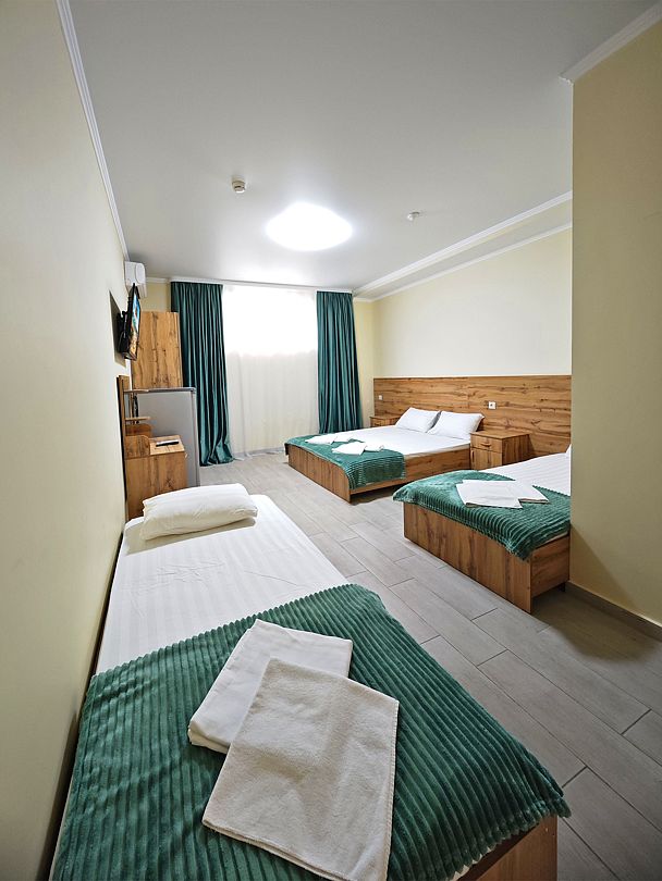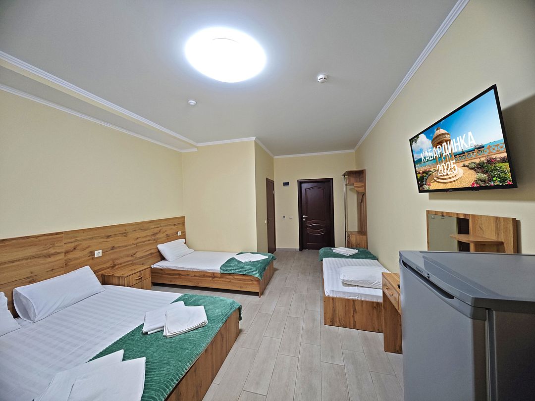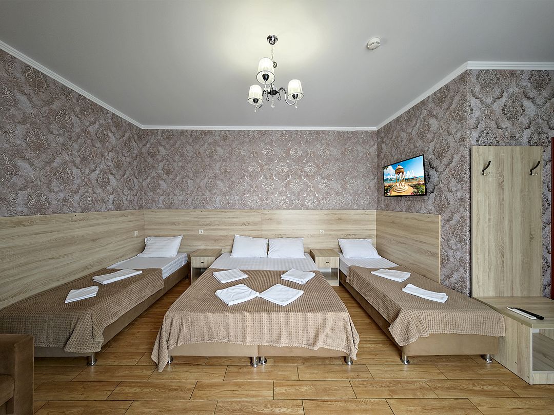 Просторный улучшенный номер с 2-мя основными и 2-мя дополнительными спальными местами на 1 этаже без балкона. Новый ремонт, новая мебель и техника.