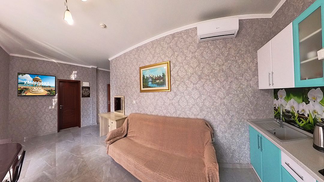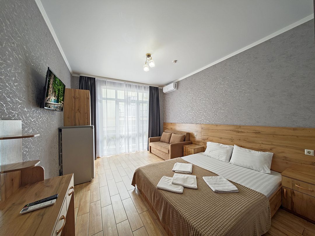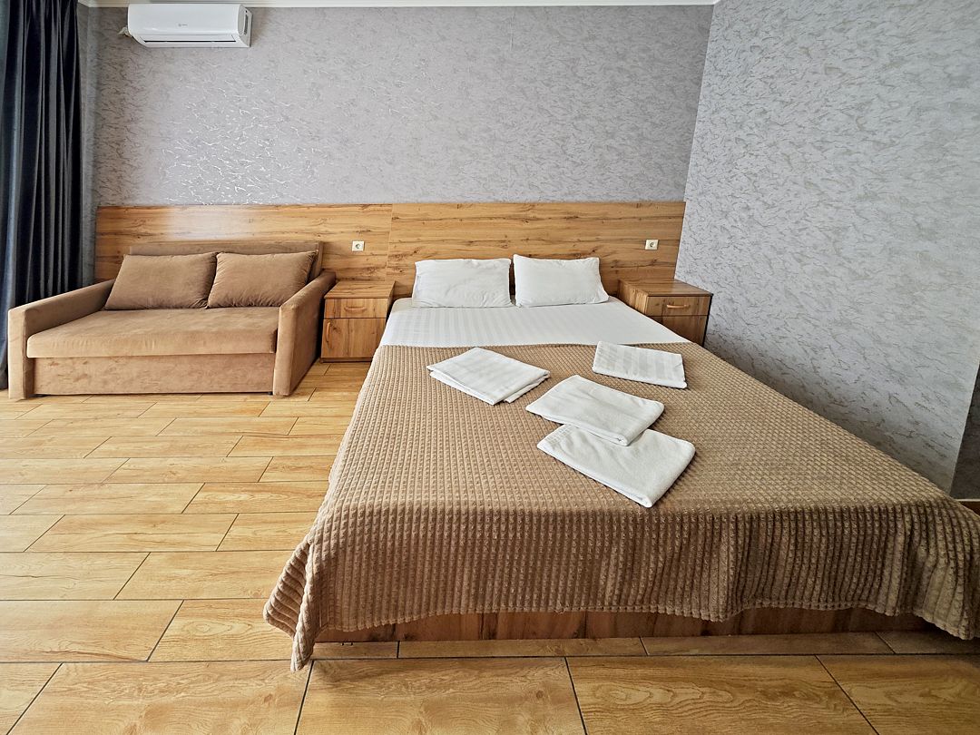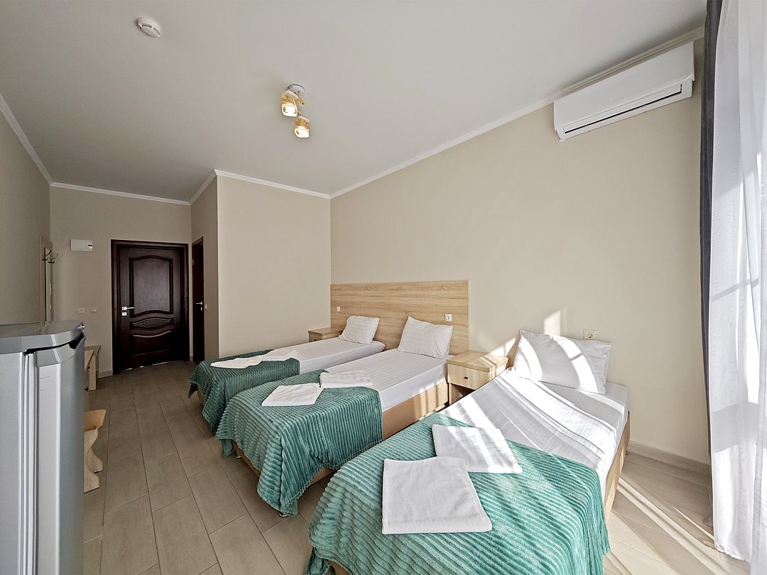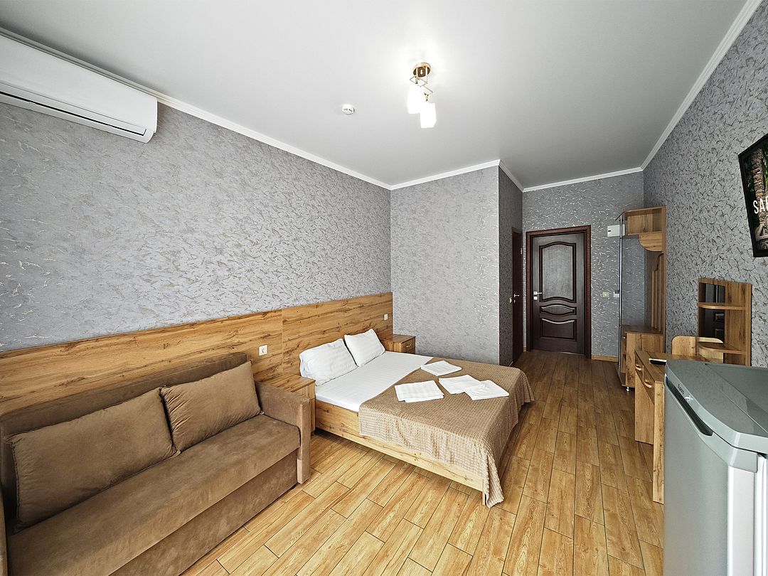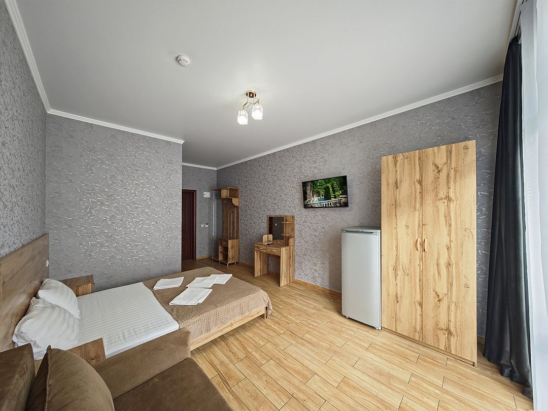 Просторный улучшенный номер с 2-мя основными и 2-мя дополнительными спальными местами на 1 этаже без балкона. Новый ремонт, новая мебель и техника.