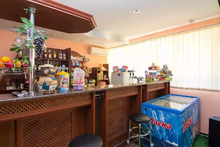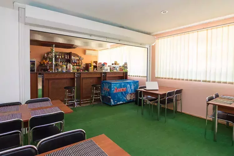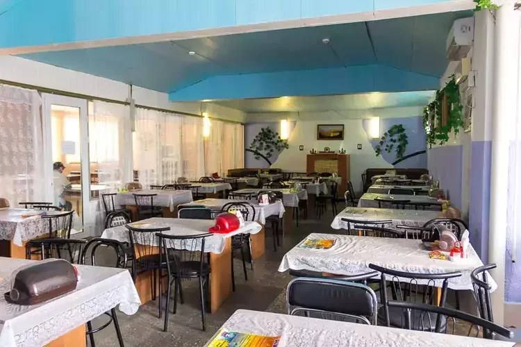 На территории турбазы работает просторная и светлая столовая, в меню которой разнообразные блюда русской, украинской, европейской, грузинской, татарской кухни. Кроме того, на пляже функционирует летнее кафе.