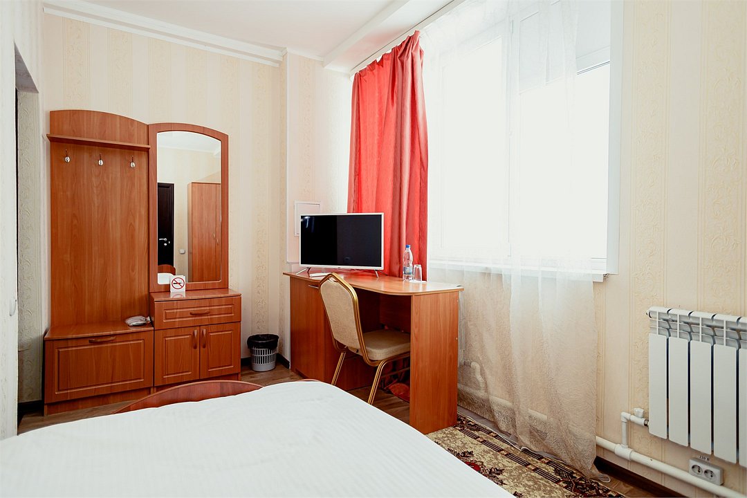 Компактный, уютный для тех, кто путешествует вдвоем. При минимальном бюджете в номере есть все необходимое для комфортного проживания. Номер для невзыскательных гостей. Располагается на 1 этаже здания, что позволяет быстро выходить из здания гостиницы, не используя лифт. Окна выходят на внутреннюю территорию.Услуги и удобства
