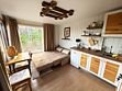 Уютный, с меблировкой и элементам декора из ретро-доски. Двухкомнатный домик обеспечивает дополнительный уют, благодаря тому, что пространство разделено на спальню и гостиную.