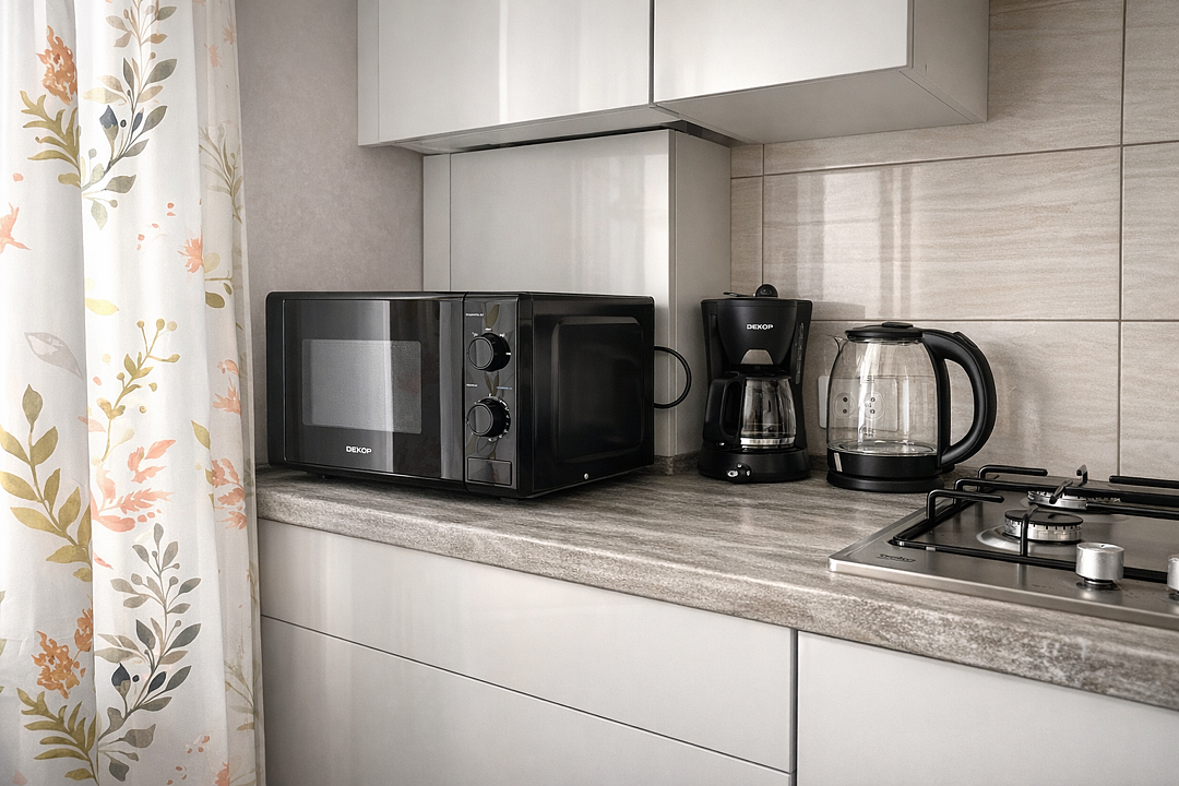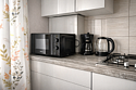 - На кухне холодильник, микроволновая печь, электрочайник, газовая плита с духовкой.