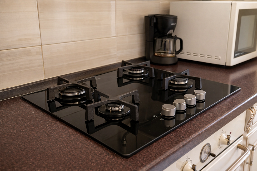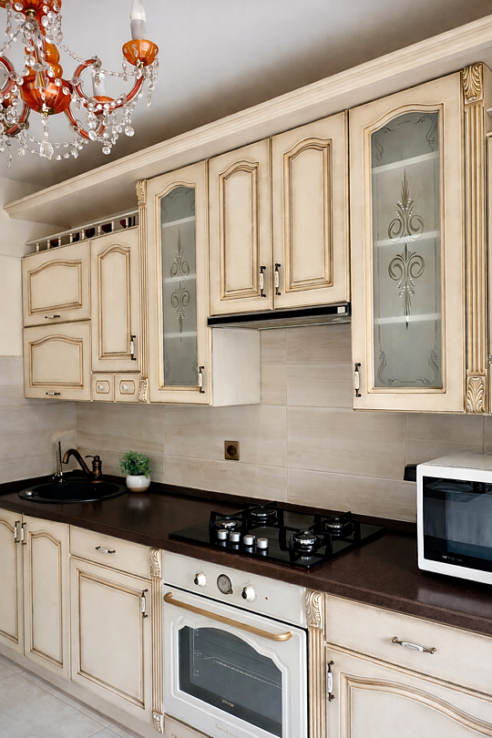 - На кухне холодильник, микроволновая печь, электрочайник, плита и духовка;