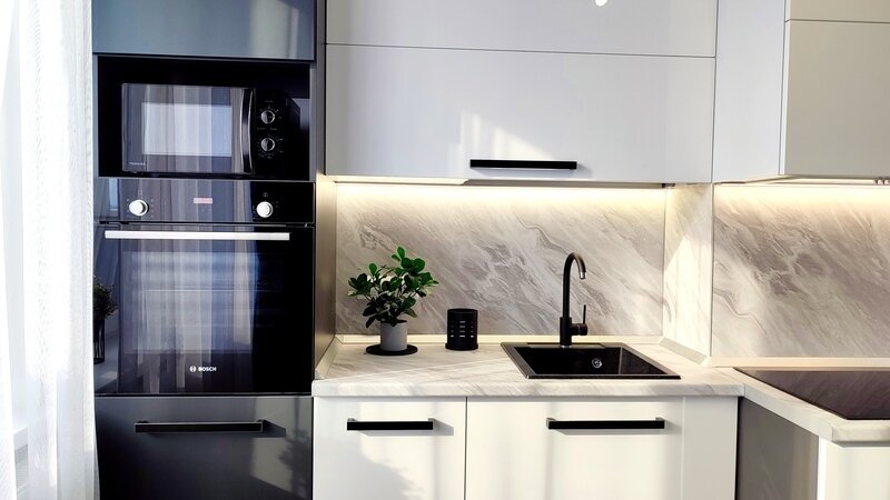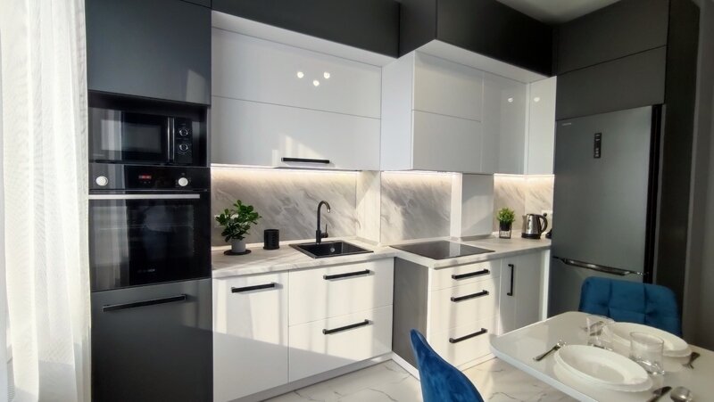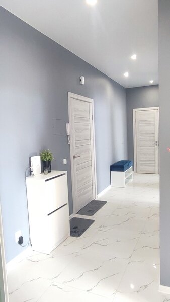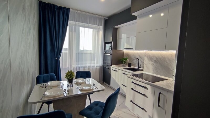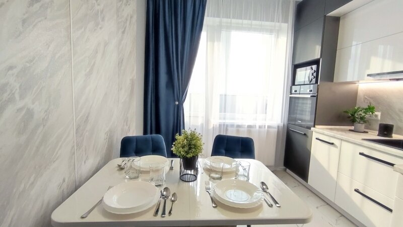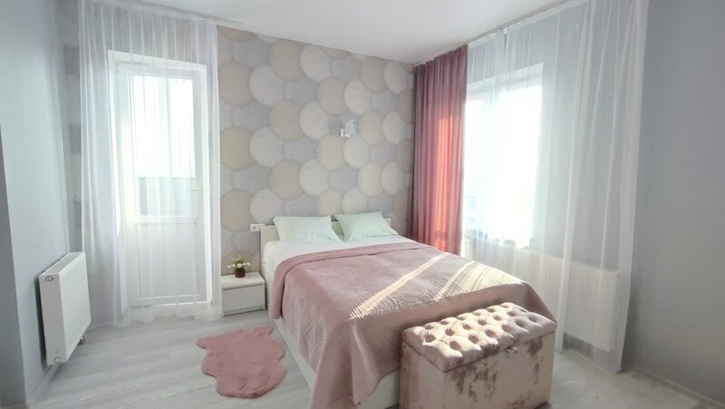 Квартира со светлым и современным интерьером обставлена комфортабельной мебелью и оснащена необходимыми удобствами.В их числе двуспальная кровать с ортопедическим матрасом, раскладной диван, гардеробная, собственная ванная комната, телевизор и Wi-Fi.