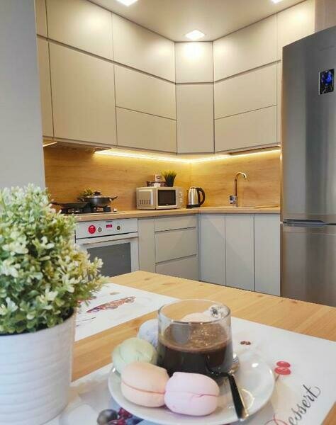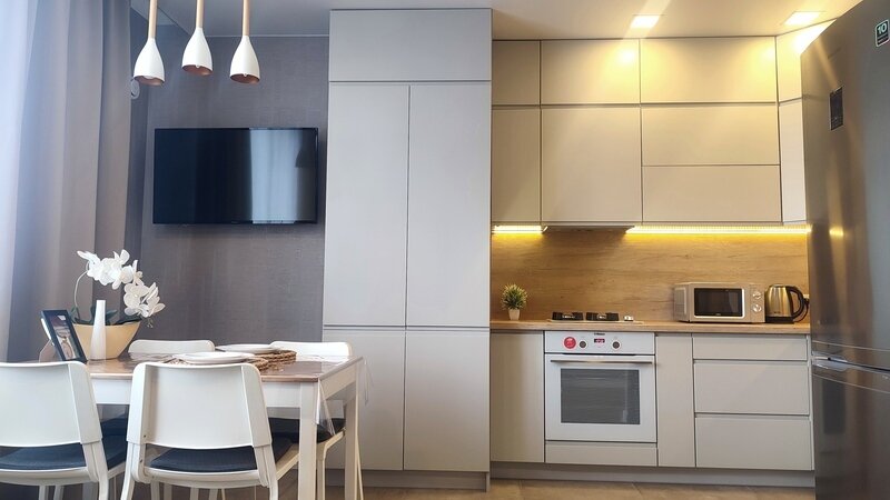 Кухня оборудована холодильником, плитой, микроволновкой, духовым шкафом, чайником, а также столовыми приборами и посудой.