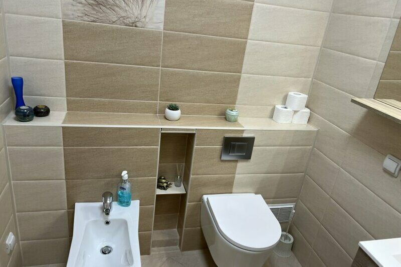 Очень просторная, светлая, теплая квартира, позволяет гостям разместится с комфортом. В квартире имеется гардеробная комната для хранения верхней одежды и багажа, два туалета, две спальных комнаты, большая кухня-гостиная (50 м. кв. ). Большая ванна, имеется биде. Спальная зона и зона общего пользования изолированы друг от друга.