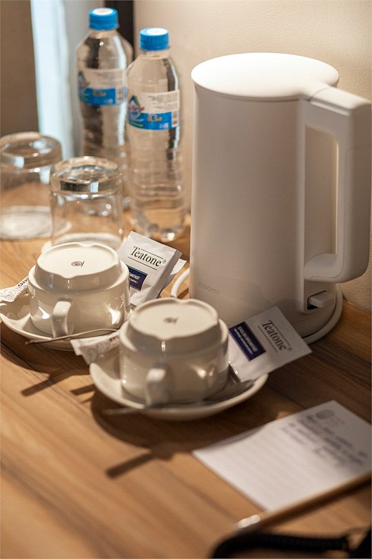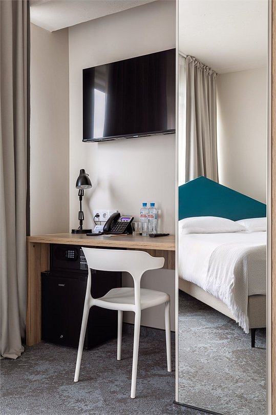 Wi-Fi, кондиционер, светильник, настольные лампы, фен, электронные замки, ванная комната, душевая кабина, банные полотенца, тапочки, гигиенические средства, косметические средства, две односпальные или большая двуспальная кровать, письменный стол, зеркало, звуконепроницаемые стены и окна, письменные принадлежности, сейф, чайник, унитаз, раковина, ковровое покрытие, отопление, душ, стул, туалетные средства, внутренний телефон, мини-холодильник, телевизор со Smart TV, номер для некурящих, уборка номера, вешалки-плечики, бутилированная вода, мыло, затемняющая штора, зеркало в полный рост, открытый шкафВ гостиничном номере