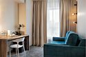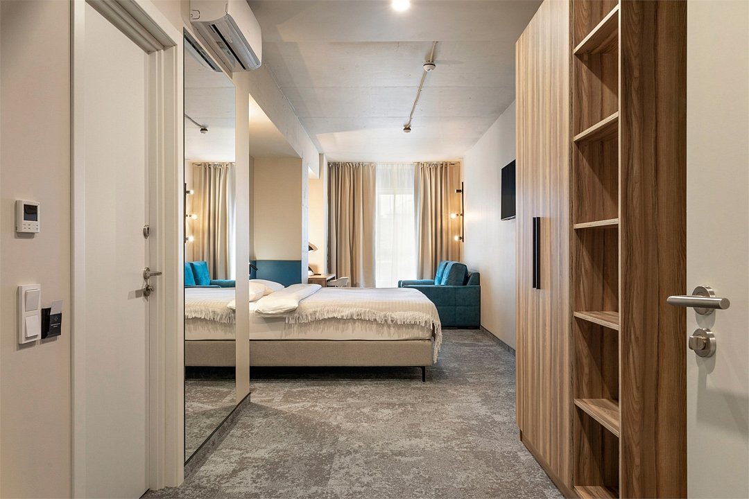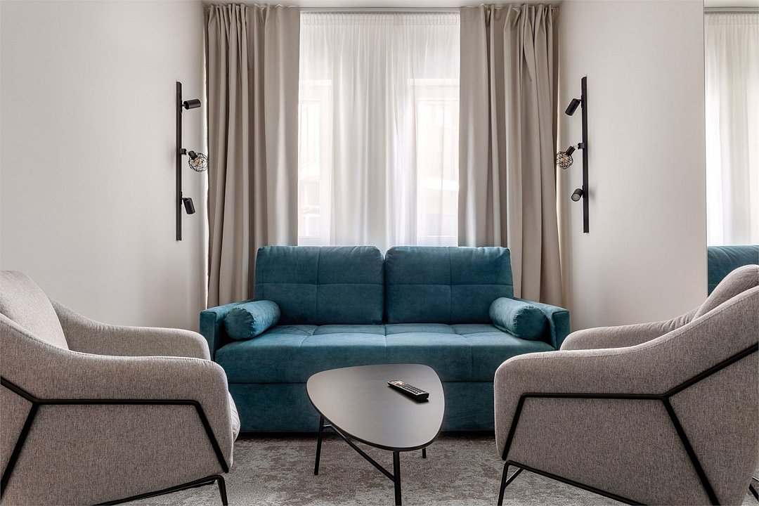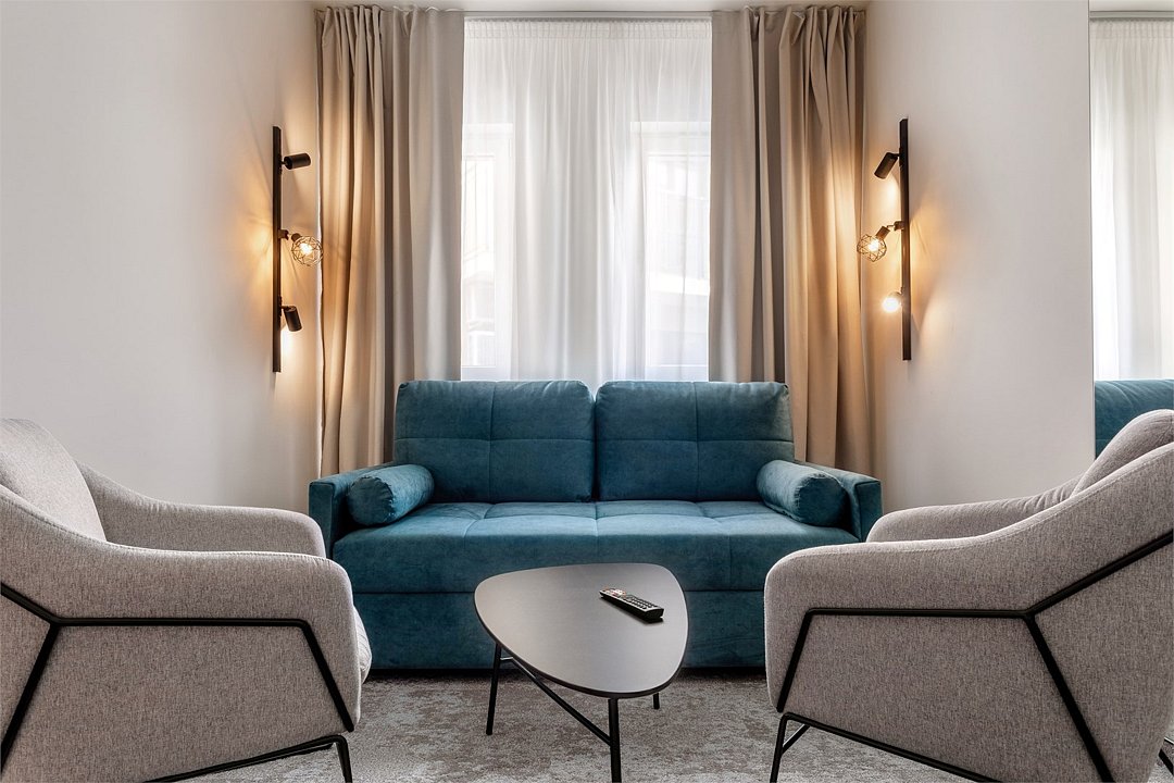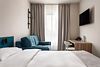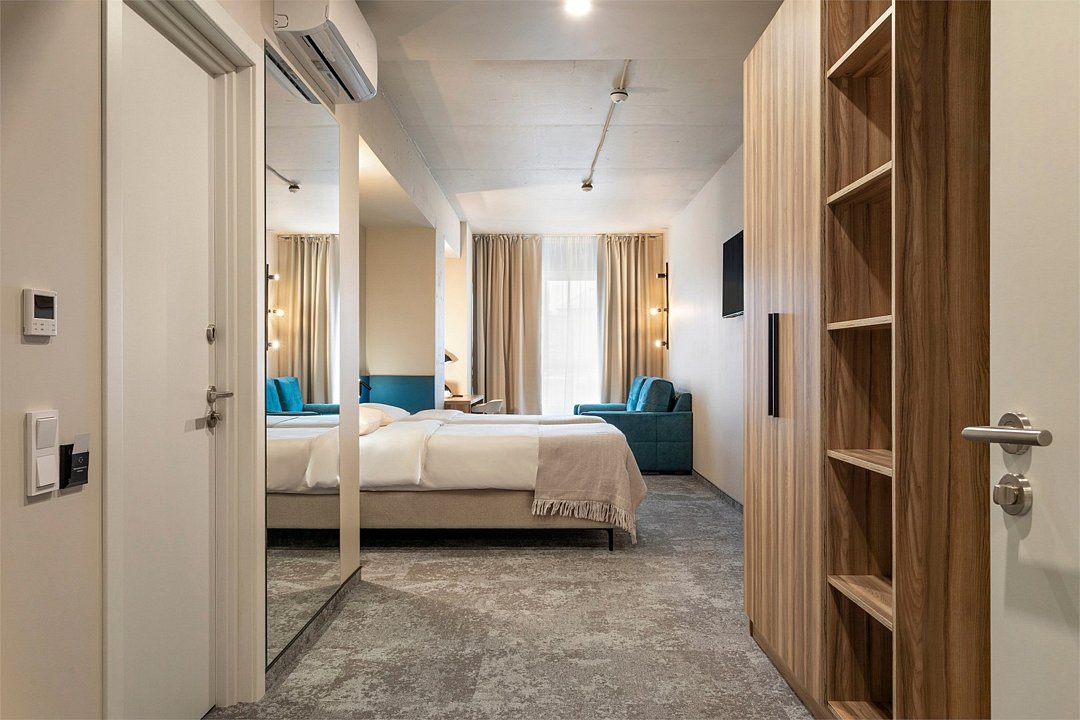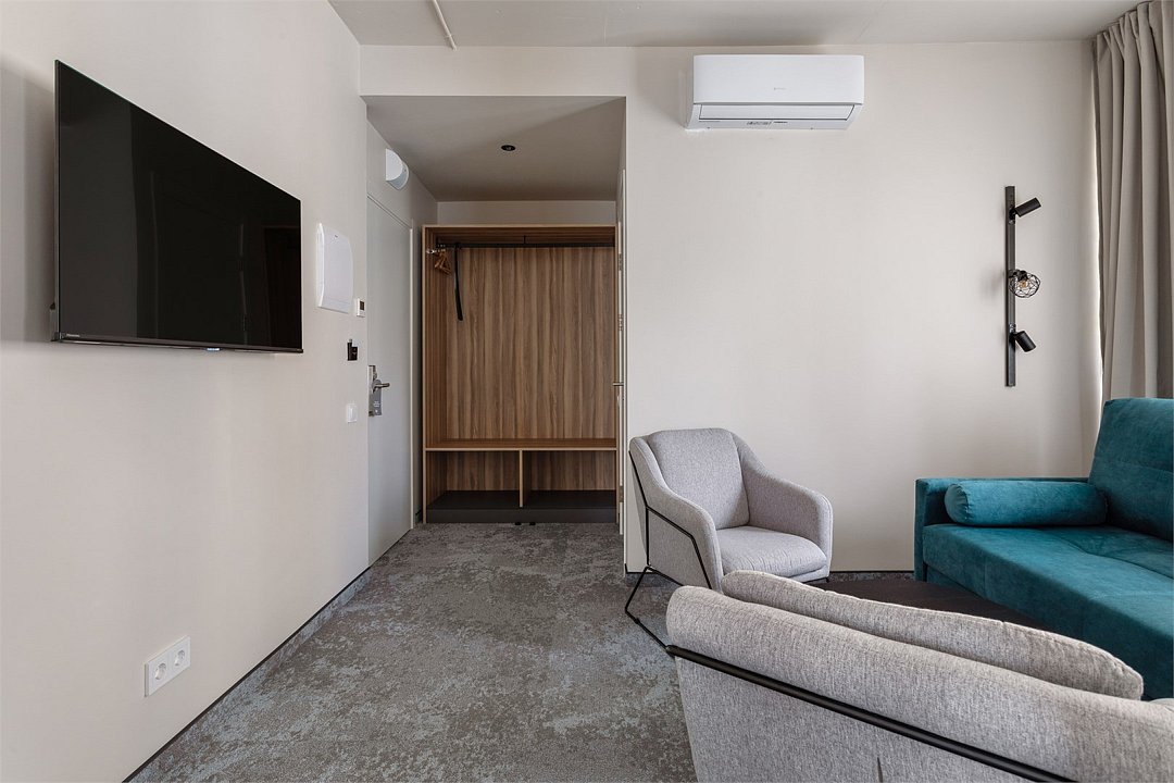 Wi-Fi, кондиционер, светильник, настольные лампы, фен, электронные замки, ванная комната, душевая кабина, санузел, банные принадлежности, банные полотенца, тапочки, гигиенические средства, косметические средства, две односпальные или большая двуспальная кровать, кресла, журнальный столик, письменный стол, звуконепроницаемые стены и окна, письменные принадлежности, сейф, чайник, унитаз, мягкая мебель, гостиная зона, ковровое покрытие, отопление, душ, вид во двор, туалетные средства, раскладной диван, внутренний телефон, мини-холодильник, телевизор со Smart TV, номер для некурящих, уборка номера, вешалки-плечики, бутилированная вода, мыло, затемняющая штора, зеркало в полный рост, открытый шкафВ гостиничном номере