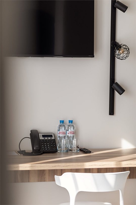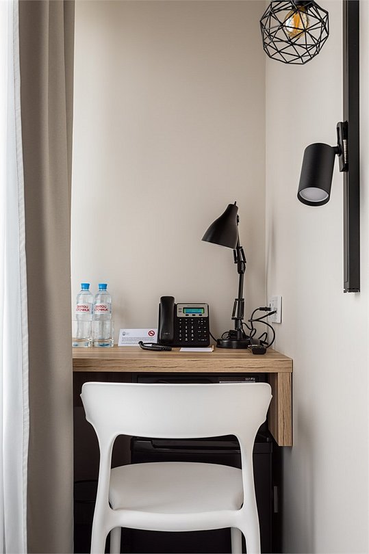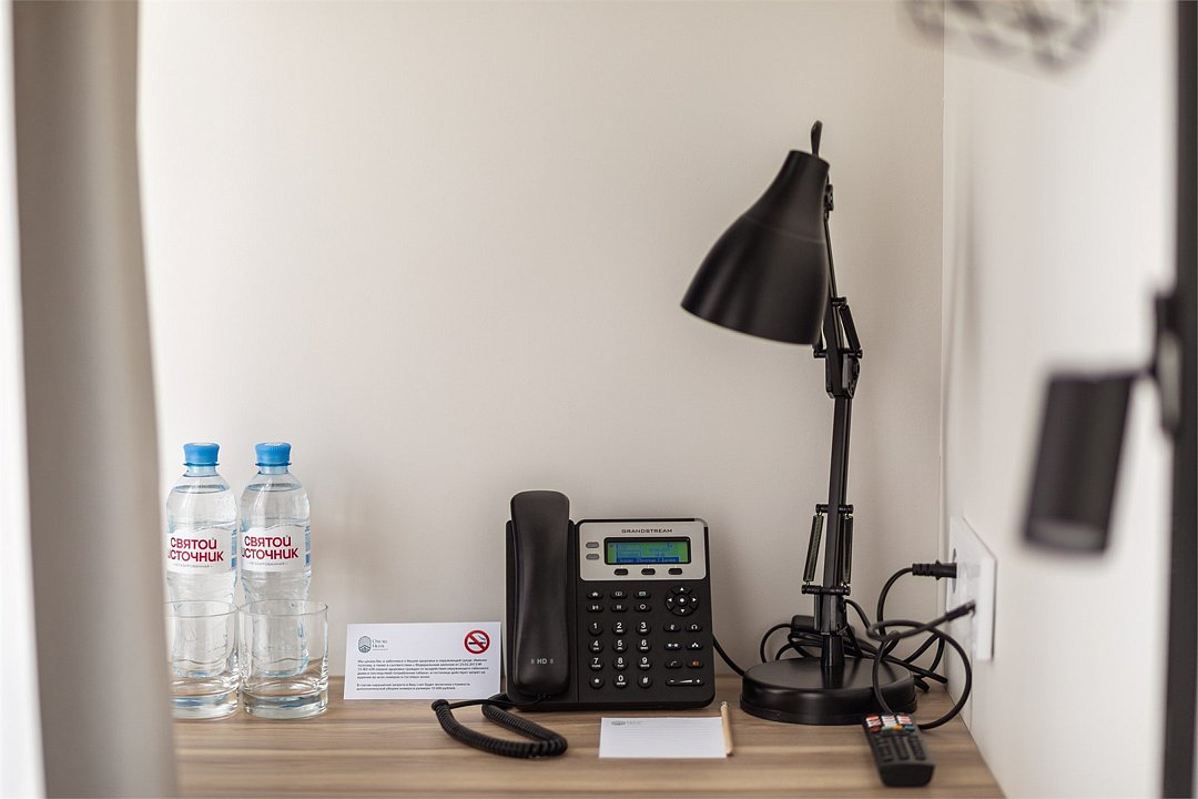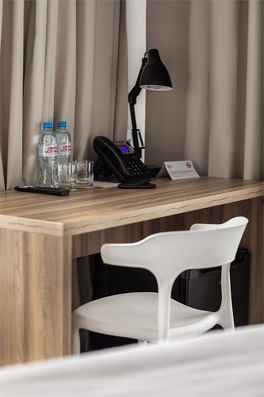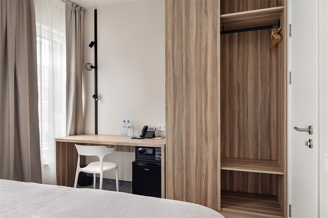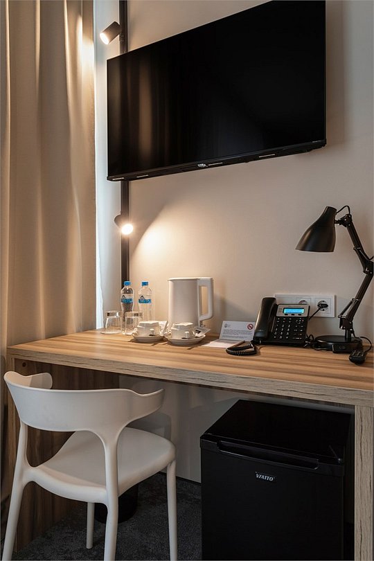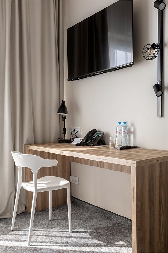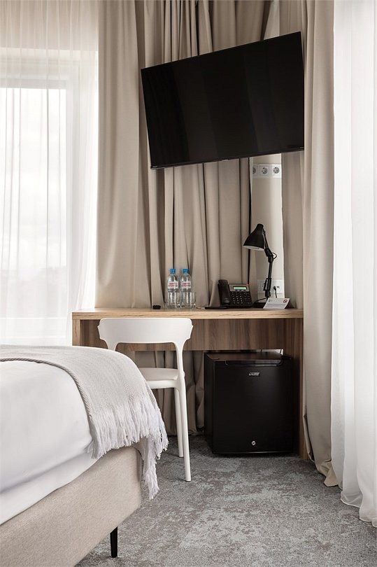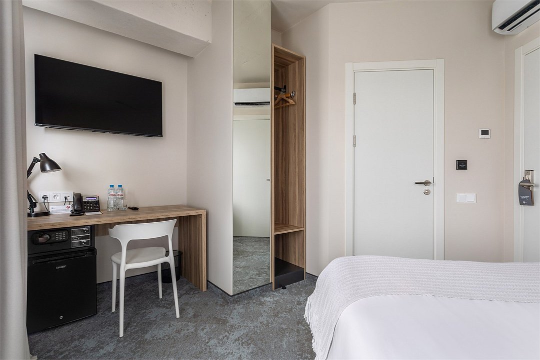 Wi-Fi, кондиционер, светильник, настольные лампы, фен, электронные замки, ванная комната, санузел, банные полотенца, тапочки, две односпальные или большая двуспальная кровать, письменный стол, зеркало, звуконепроницаемые стены и окна, письменные принадлежности, сейф, чайник, унитаз, раковина, ковровое покрытие, отопление, душ, стаканы, стул, туалетные средства, внутренний телефон, мини-холодильник, телевизор со Smart TV, номер для некурящих, уборка номера, вешалки-плечики, бутилированная вода, мыло, затемняющая штора, зеркало в полный рост, открытый шкафВ гостиничном номере