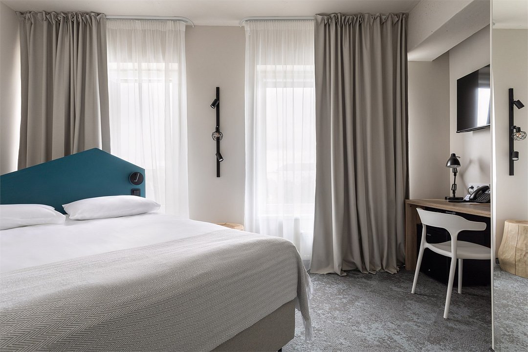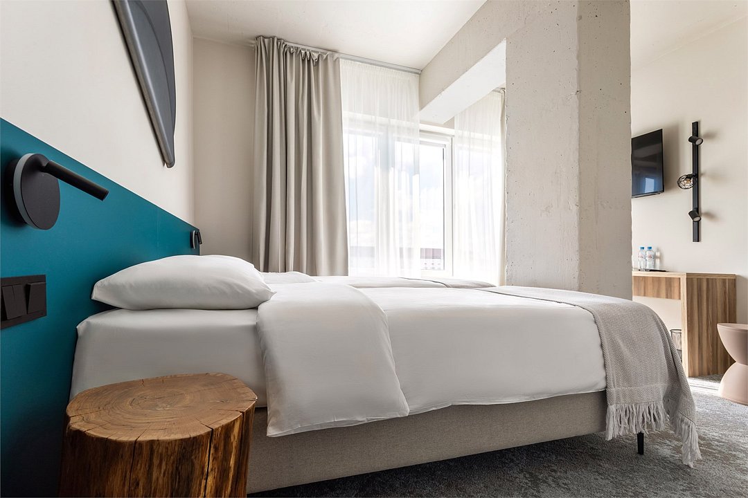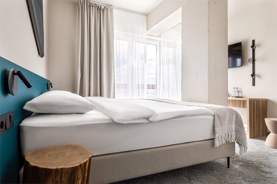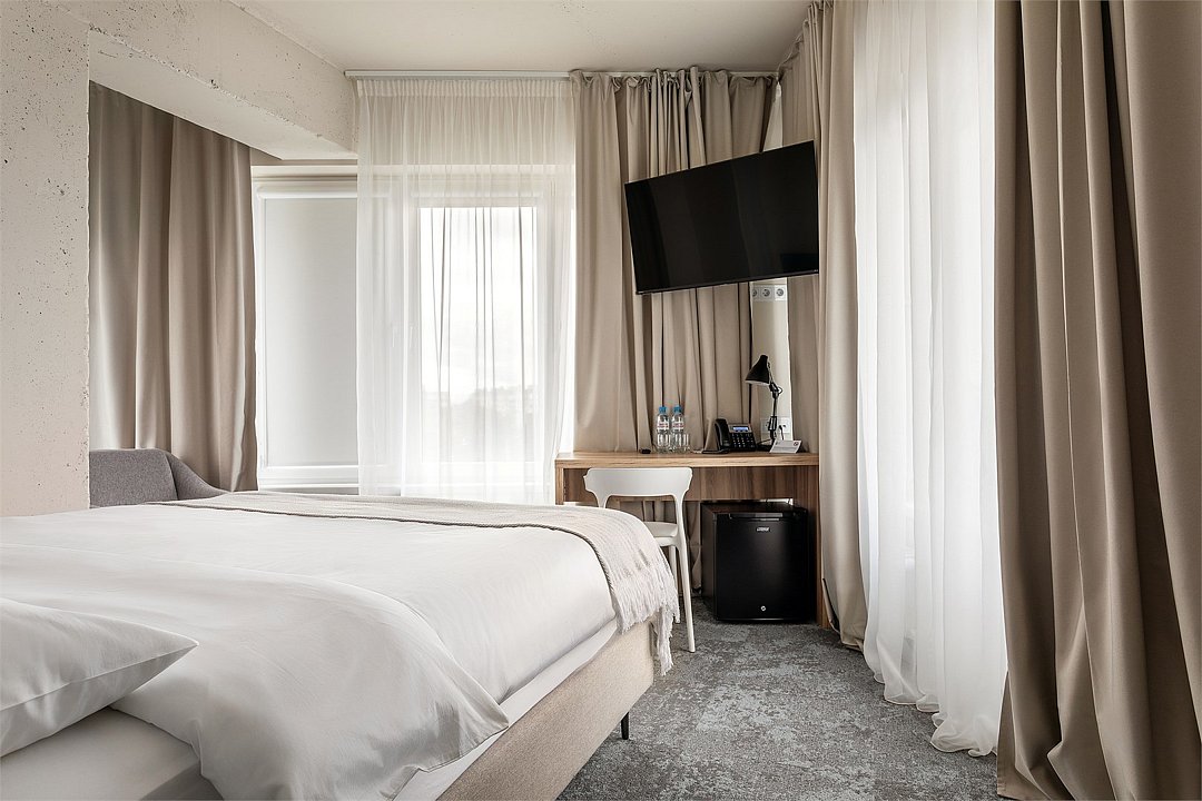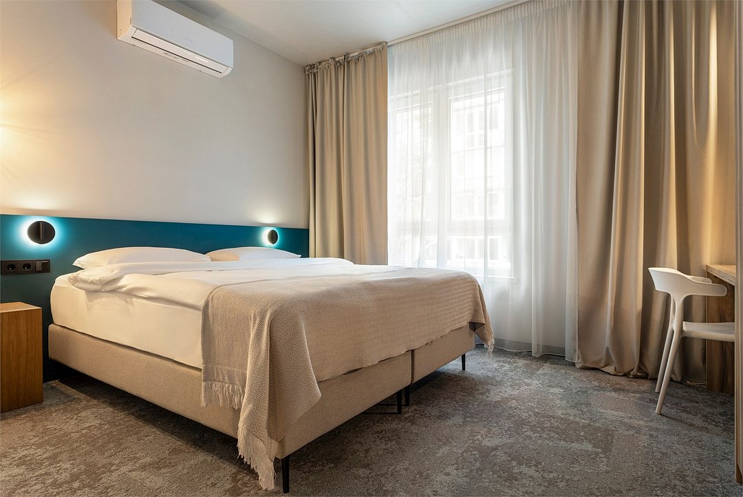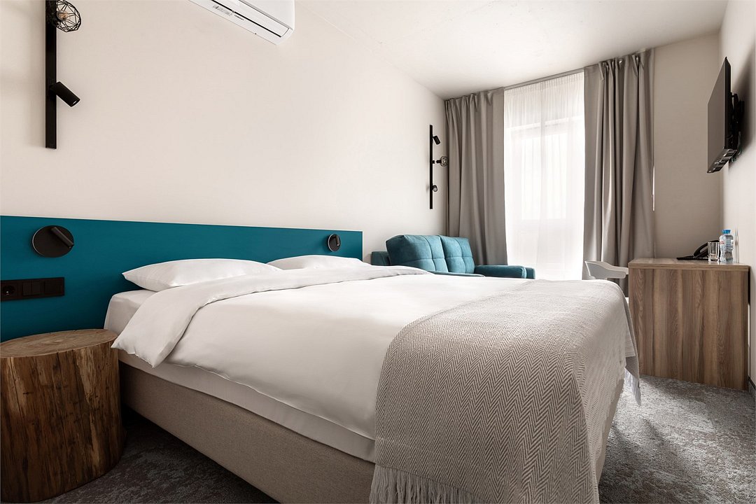 Двухместный номер Стандарт сочетает в себе современные дизайнерские решения, уют и комфорт. Интерьер выполнен в теплых светлых тонах и отражает в себе особенности края - дюны, море, леса. Окна номеров выходят в зеленый внутренний двор или на улицу 9 Апреля. В номере: • Двуспальная кровать Queen-Size 160x200 см с ортопедическим матрасом высокого качества; • Сейф для хранения ценных вещей; • Мини-холодильник; • Кондиционер для создания идеального микроклимата; • Телевизор с функцией смарт ТВ; • Стильная ванная комната с душевой кабиной; • Фен и набор косметических принадлежностей Natura Siberica (шампунь, гель для душа, мыло, также по запросу предоставляются зубной, бритвенный, косметический наборы); • Шторы blackout; • Чайная станция.Услуги и удобства