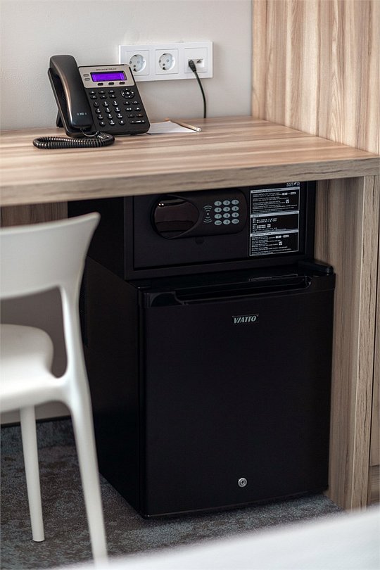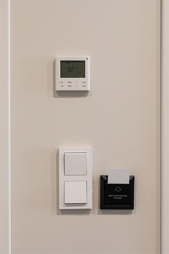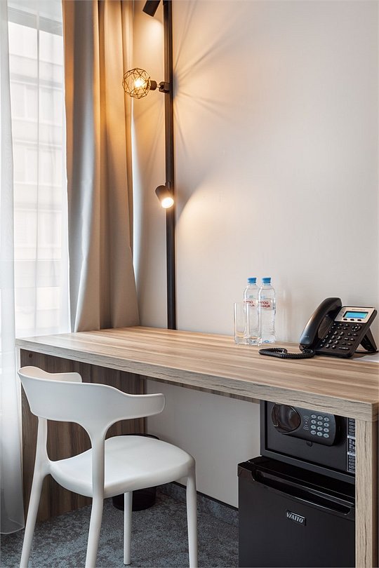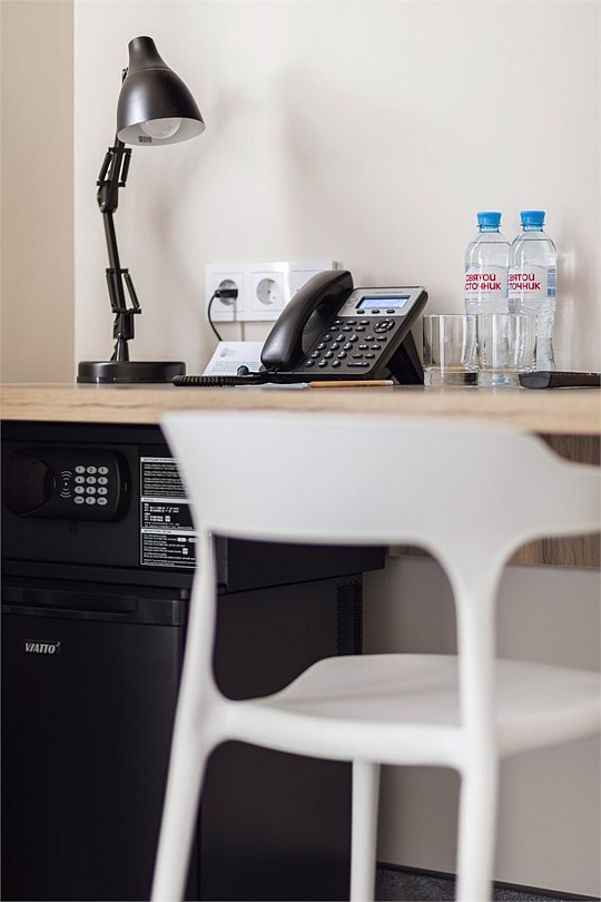 Wi-Fi, кондиционер, светильник, настольные лампы, фен, электронные замки, ванная комната, душевая кабина, санузел, банные полотенца, тапочки, гигиенические средства, косметические средства, две односпальные или большая двуспальная кровать, письменный стол, зеркало, звуконепроницаемые стены и окна, письменные принадлежности, сейф, чайник, унитаз, раковина, ковровое покрытие, отопление, душ, стаканы, стул, туалетные средства, диван-кровать, раскладной диван, внутренний телефон, мини-холодильник, телевизор со Smart TV, номер для некурящих, уборка номера, вешалки-плечики, бутилированная вода, мыло, затемняющая штора, зеркало в полный рост, открытый шкафВ гостиничном номере