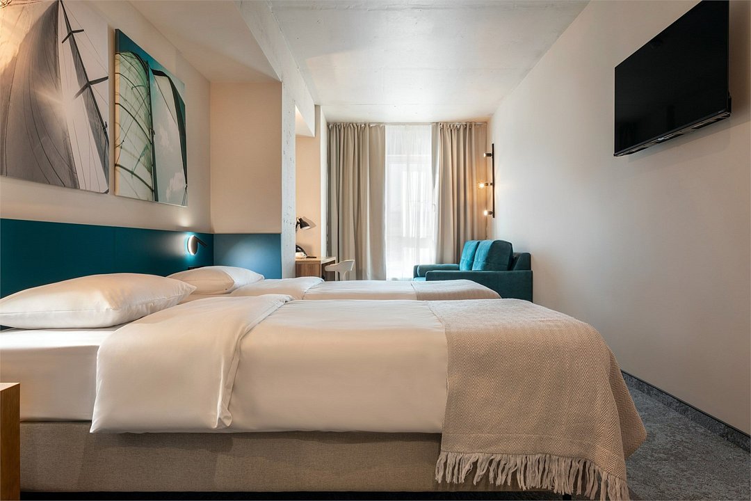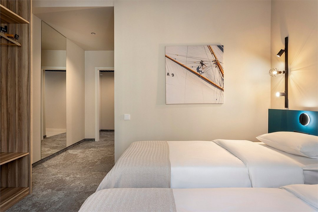 Просторный трехместный номер Семейный Супериор сочетает в себе современные дизайнерские решения, уют и комфорт. Интерьер выполнен в теплых светлых тонах и отражает в себе особенности края - дюны, море, леса. Окна номеров выходят в зеленый внутренний двор, что обеспечивает тишину и покой. В номере: • Двуспальная кровать King-Size 180x200 см с ортопедическим матрасом высокого качества или 2 односпальные кровати 90х200 см; • Раскладной диван в качестве дополнительного места; • Сейф для хранения ценных вещей; • Мини-холодильник; • Кондиционер для создания идеального микроклимата; • Телевизор с функцией смарт ТВ; • Стильная ванная комната с душевой кабиной; • Фен и набор косметических принадлежностей Natura Siberica (шампунь, гель для душа, мыло, также по запросу предоставляются зубной, бритвенный, косметический наборы); • Шторы blackout; • Чайная станция.Услуги и удобства