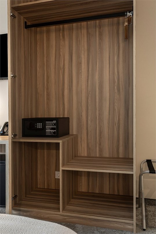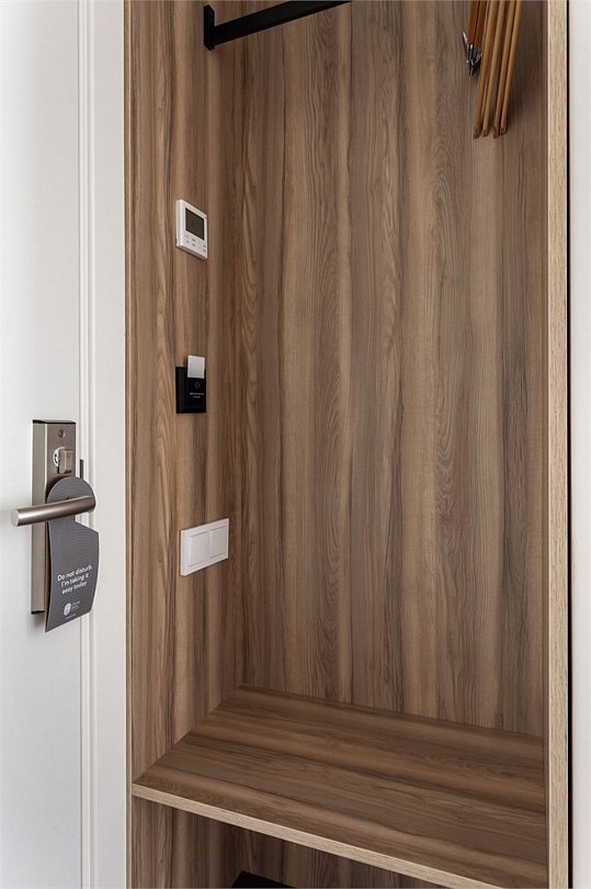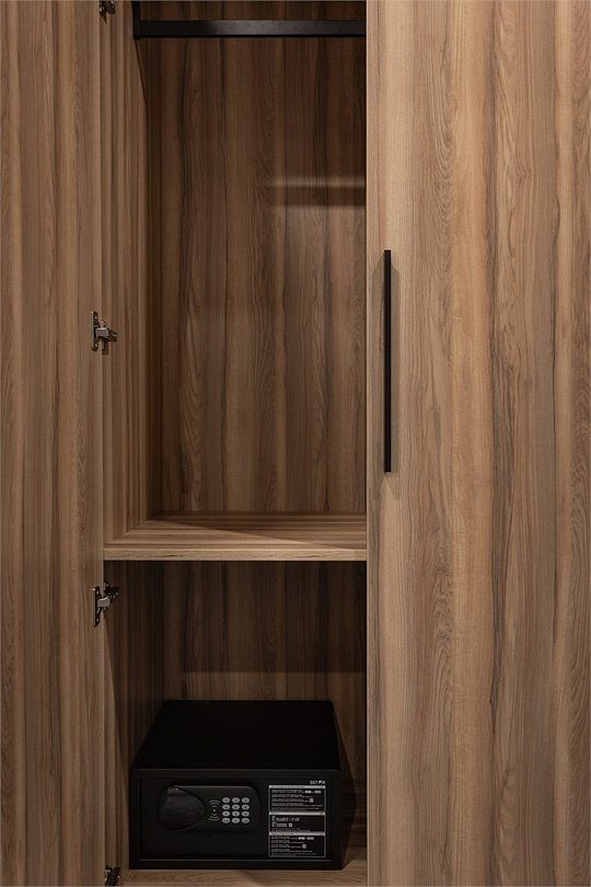 Wi-Fi, кондиционер, светильник, настольные лампы, фен, электронные замки, ванная комната, душевая кабина, санузел, банные полотенца, тапочки, гигиенические средства, косметические средства, кровать «Queen size», письменный стол, зеркало, звуконепроницаемые стены и окна, письменные принадлежности, сейф, чайник, унитаз, раковина, ковровое покрытие, отопление, душ, стул, туалетные средства, внутренний телефон, мини-холодильник, телевизор со Smart TV, номер для некурящих, уборка номера, вешалки-плечики, бутилированная вода, мыло, затемняющая штора, зеркало в полный рост, открытый шкафВ гостиничном номере