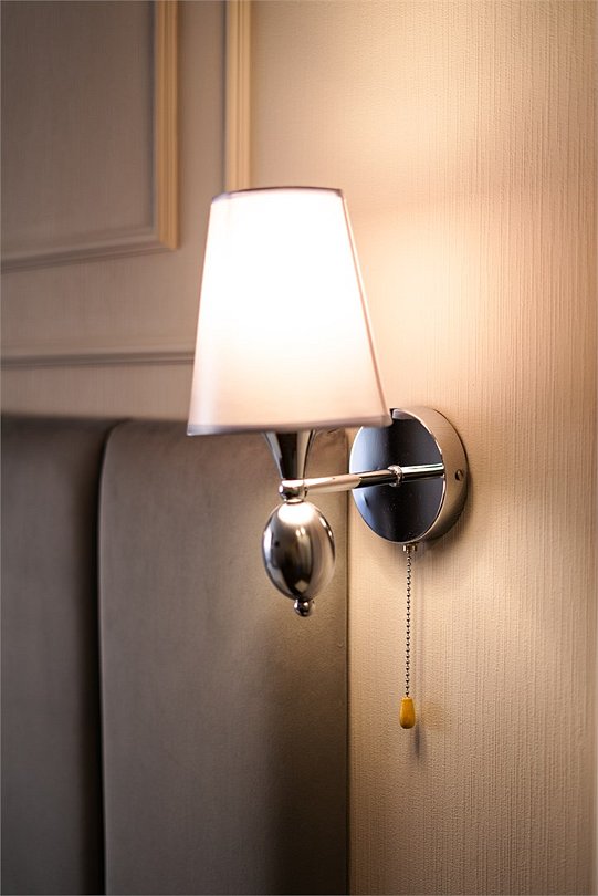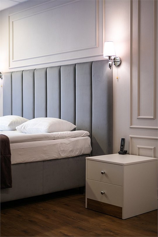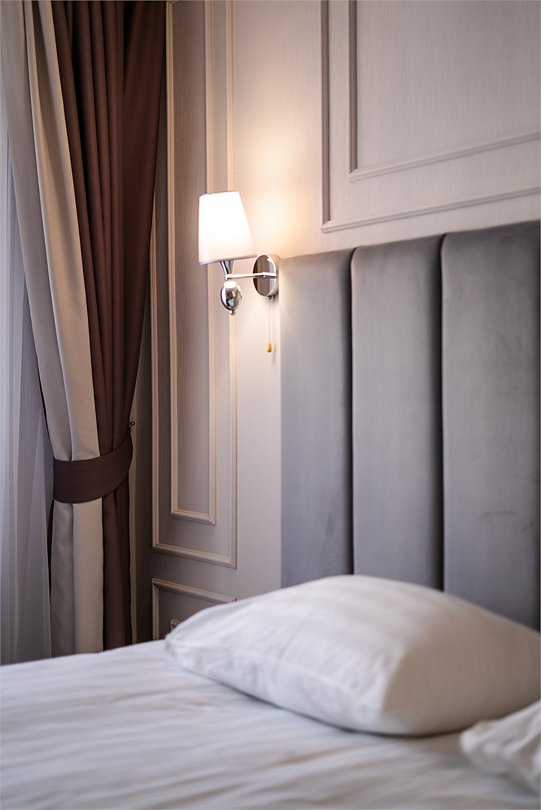 Wi-Fi, телефон, светильник, две односпальные или большая двуспальная кровать, багажная тумба, зеркало, мебельный гарнитур, кресло, стул, внутренний телефон, телевизор с плоским экраном, мини-холодильникВ гостиничном номере