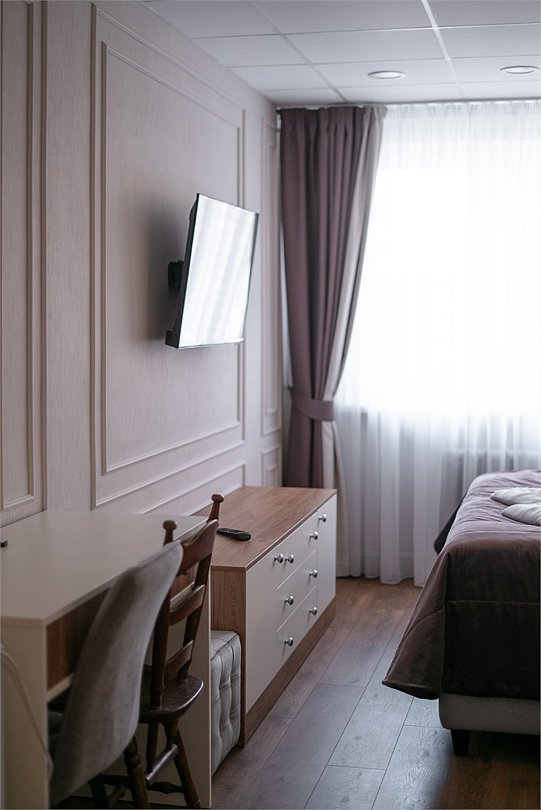 Wi-Fi, телефон, душевая кабина, санузел, две односпальные или большая двуспальная кровать, стулья, шкаф для одежды, письменный стол, душ, вид на город, стол, туалет, телевизор с плоским экраном, рабочий стол, вешалки-плечикиВ гостиничном номере