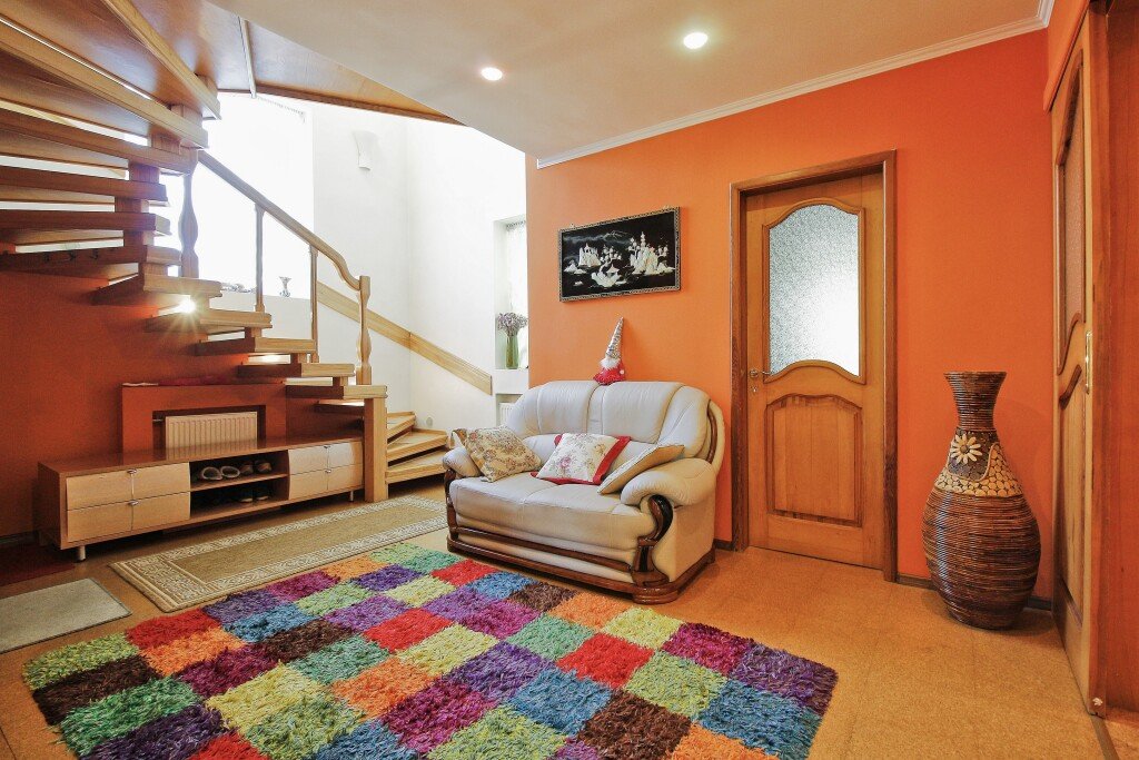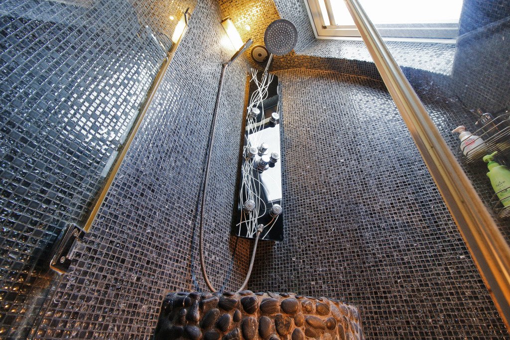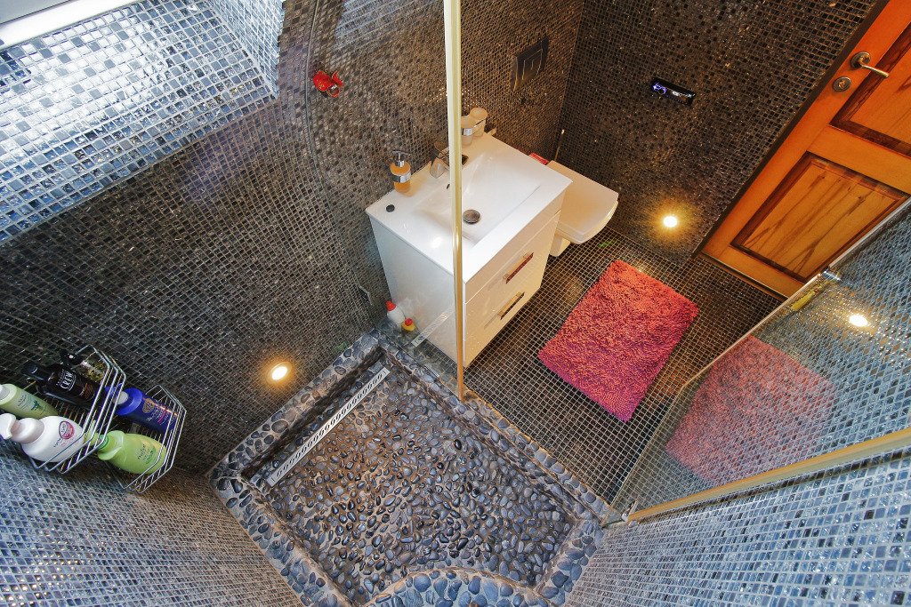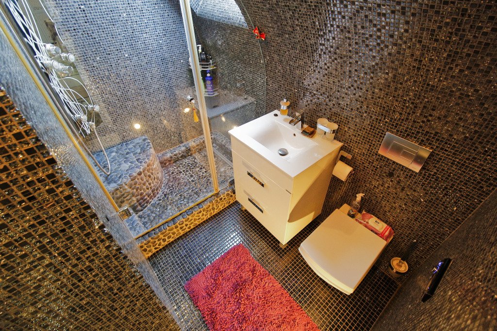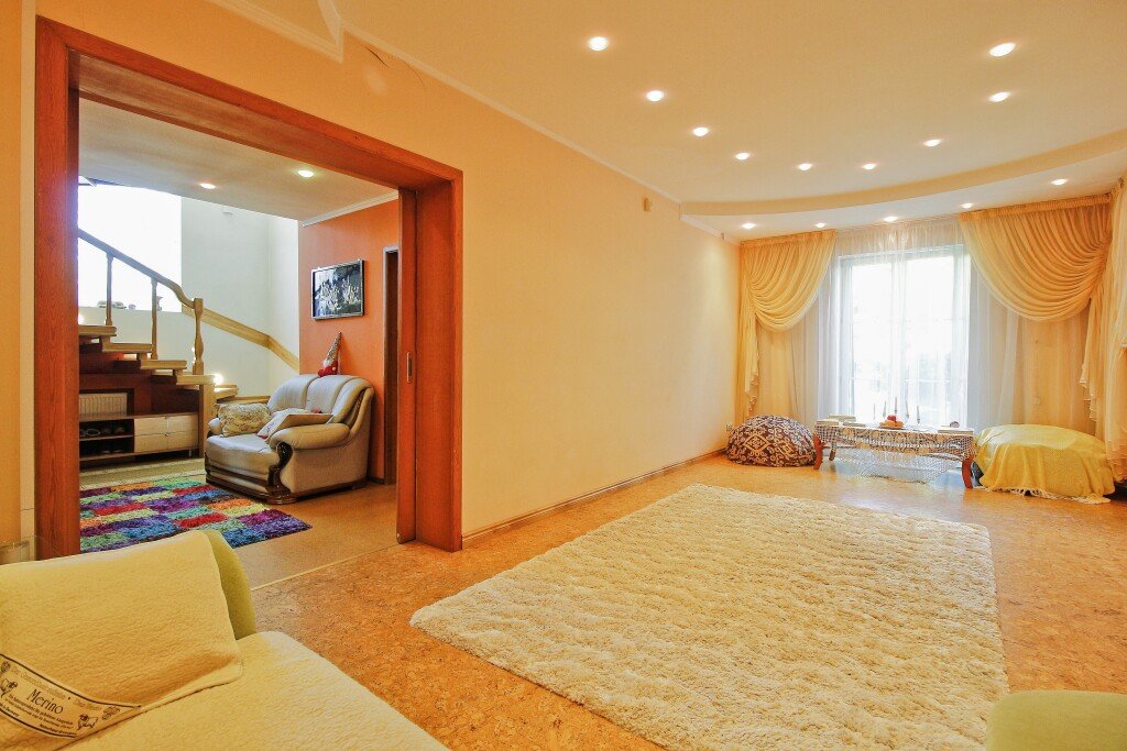На первом этаже расположена гостиная с диваном-кроватью и дополнительной ванной комнатой.