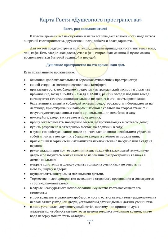 - Российским гражданам при заезде обязательно нужно иметь при себе оригинал одного из следующих документов: действующий паспорт РФ или заграничный паспорт. Правила проживания: — могут проживать дети только от 5 лет; — курение разрешено только на лоджии или в саду; — при использовании кухни уборка после себя обязательна, стоимость уборки не включена в проживание; — приём пищи и алкогольных напитков допускается только в кухонной зоне или на веранде; — сушить вещи разрешено только на сушилках; — необходимо соблюдать меры предосторожности на лестнице, при открывании витражных окон и использовании водоёма; — проведение торжественных мероприятий и вечеринок согласовывается отдельно; — посещение посторонних гостей не включено в стоимость проживания и согласуется дополнительно. В помещении установлены огнетушитель, датчики дыма и утечки газа.