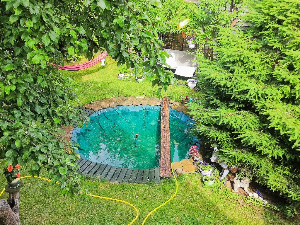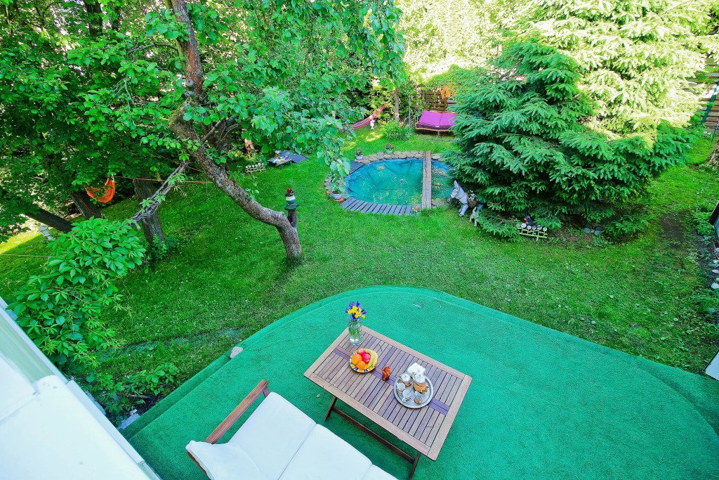 Придомовая территория благоустроена: есть садовые качели, гамаки, турник, барбекю, парковочные места.