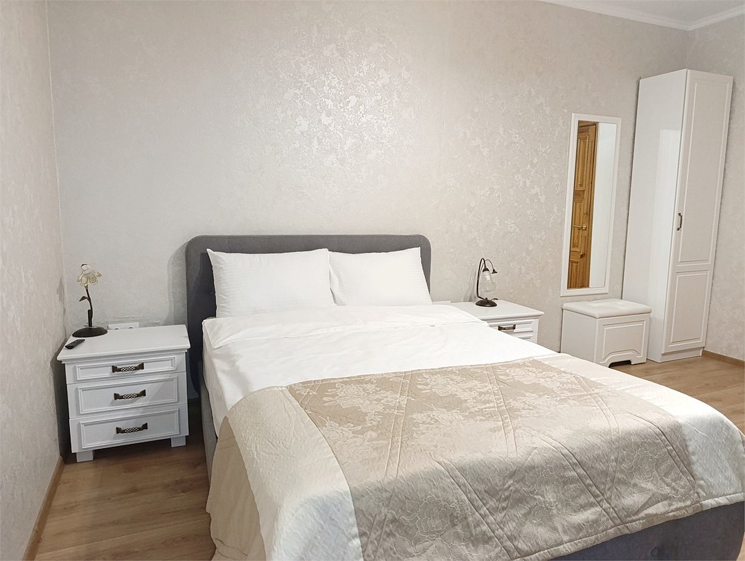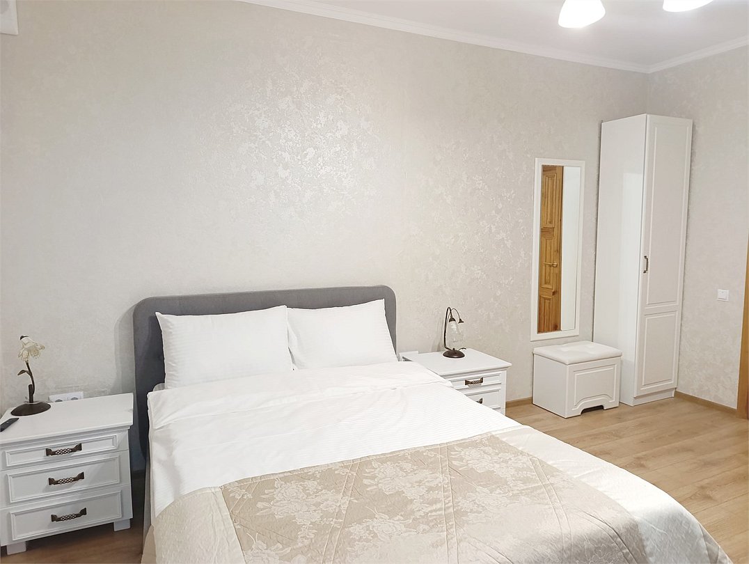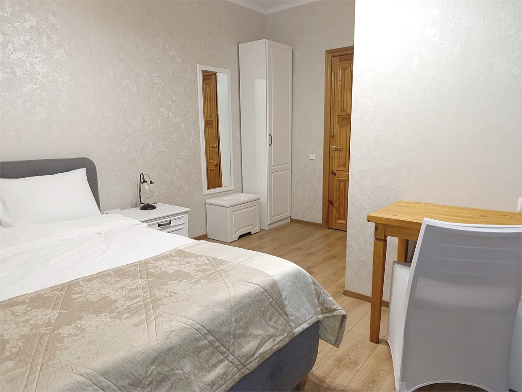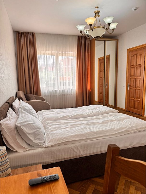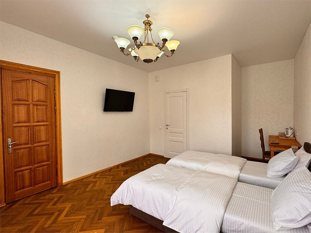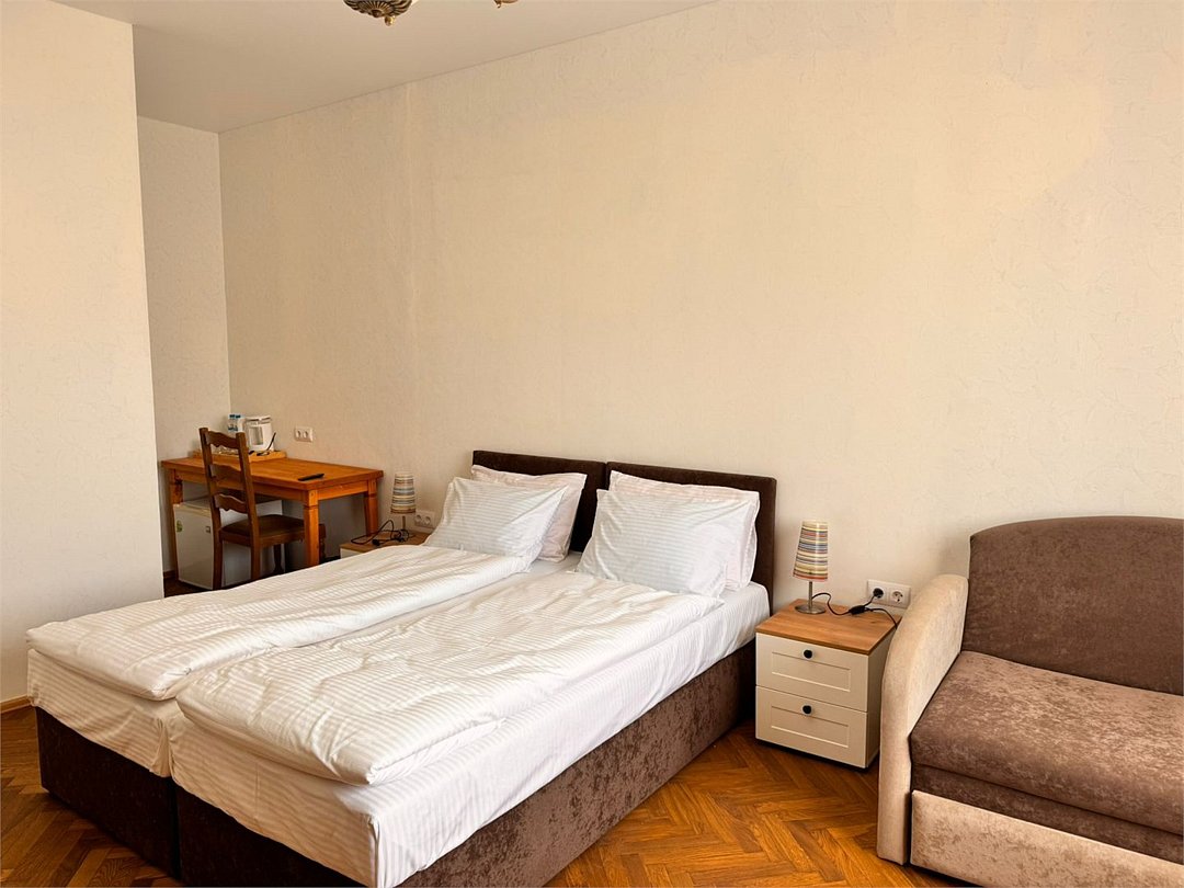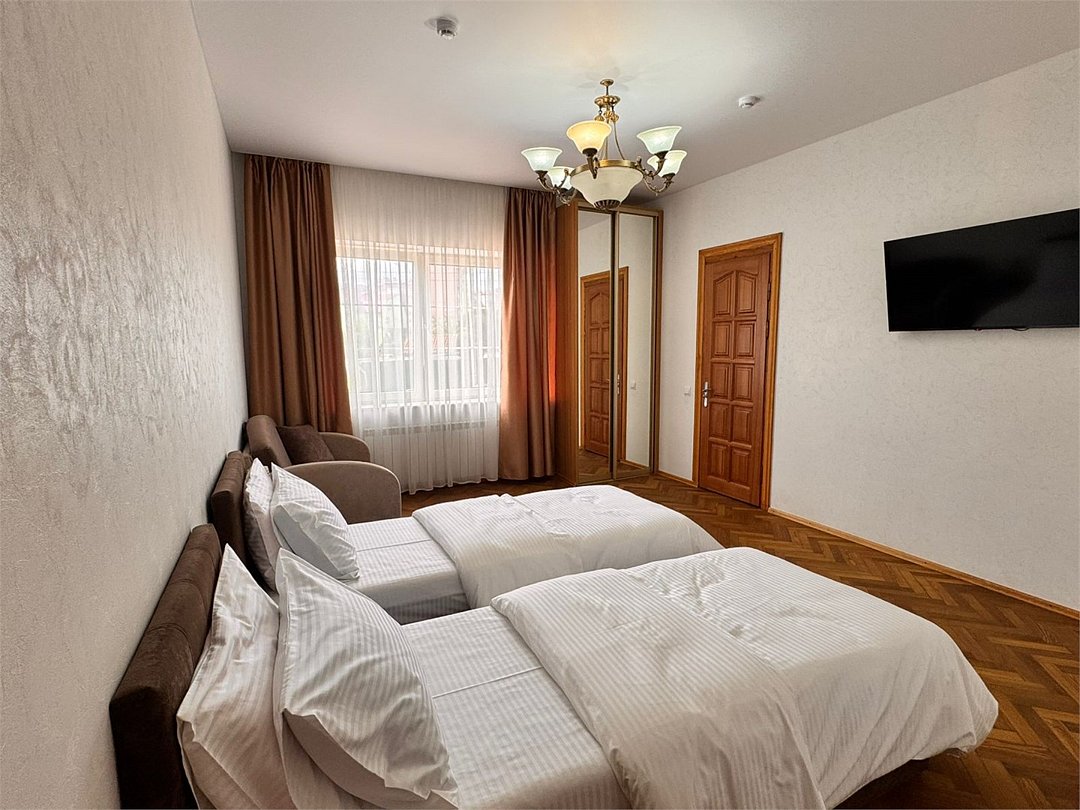 Номер представляет собой две большие комнаты: гостиную с удобным мягким диваном-кроватью, а также спальню с двуспальной кроватью и двумя прикроватными тумбами, большим зеркалом и туалетным столиком, в каждой комнате есть телевизор. Отдельная ванная комната оборудована душевой кабиной, средствами личной гигиены, тапочками для каждого гостя, косметическим набором, феном. В номере вы можете воспользоваться беспроводным интернетом, спутниковым телевидением, холодильником, чайником Окна номера выходят во двор. Комплиментарно при заезде предоставляется вода, кофе, чай.Или нужно забронировать сразу несколько номеров? Вы можете оставить письменную заявку и мы поможем составить бронирование на основе Ваших особых пожеланий.