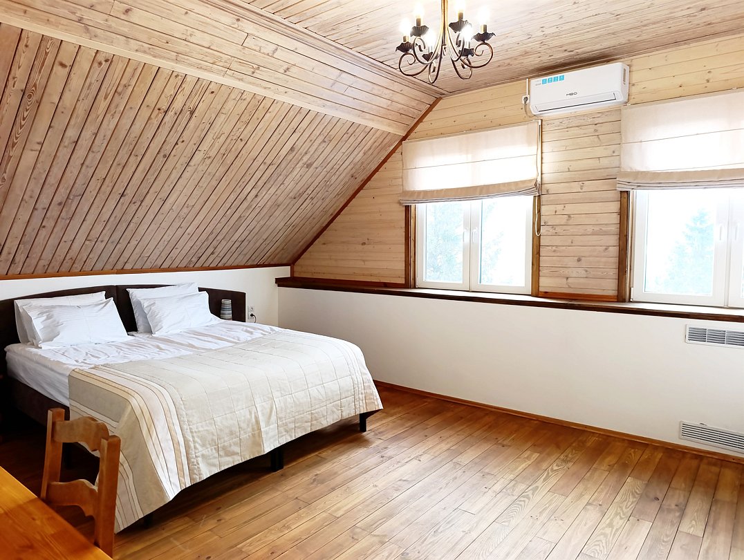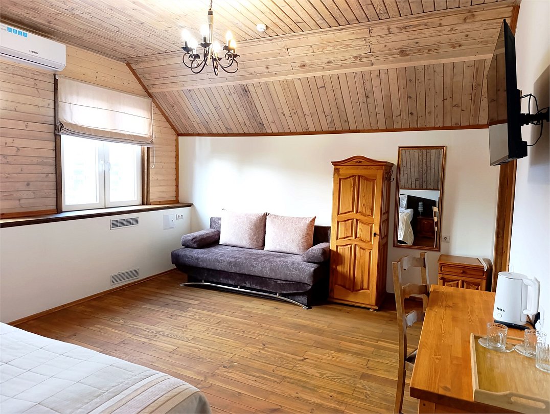 Большая с современным интерьером оборудована всем необходимым для комфортного проживания до трех человек. Двуспальная кровать с прикроватными тумбами, диван-кровать, шкаф-купе, зеркало и журнальный столик. Отдельная ванная комната оборудована душевой кабиной, средствами личной гигиены, тапочками для каждого гостя, косметическим набором, феном. В номере вы можете воспользоваться беспроводным интернетом, кабельным телевидением, холодильником, чайником. Номер предназначен для комфортного проживания одного, двух и трех гостей. Комплиментарно при заезде предоставляется вода, кофе, чай. Важная информация: Курение в номерах запрещено На территории есть беседка для курения Размещение с животными запрещеноУслуги и удобства
