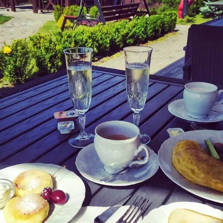 С 8.00 до 10.00 в общем зале или на уличной террасе подается горячий завтрак из двух блюд по предзаказу с вечера. Натуральный кофе и чай доступны гостям в любое время с 07.00 до 22.00.