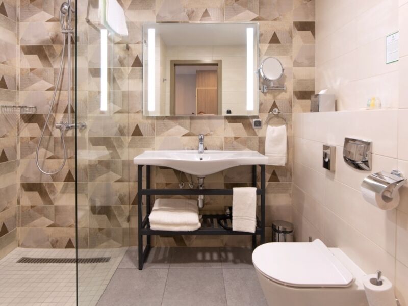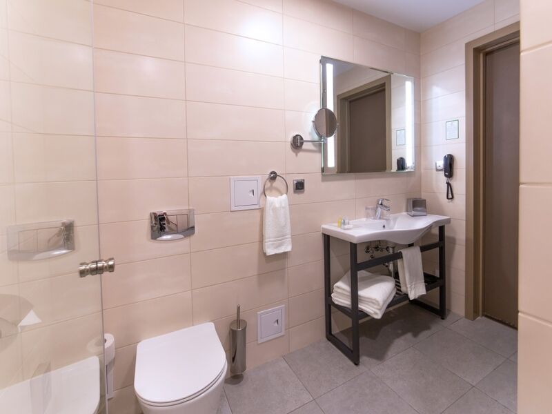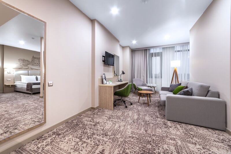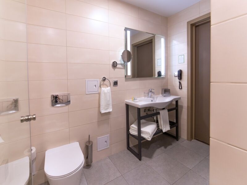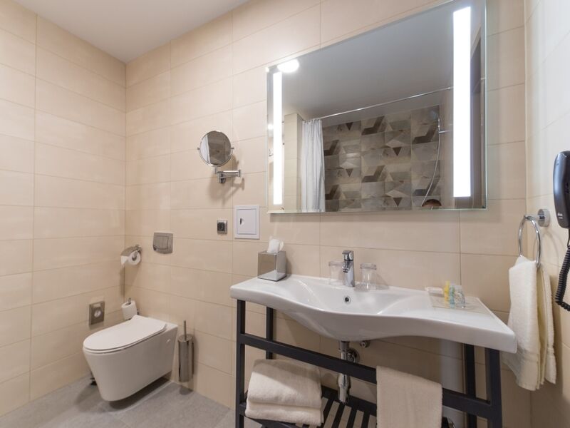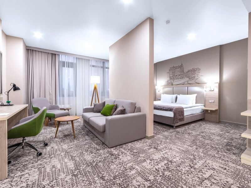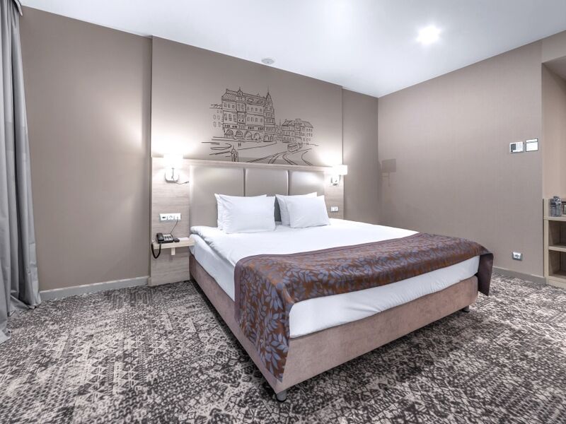 Номерной фонд, рассчитанный на единовременное размещение 250 человек, включает в себя просторные двухместные номера категории Представительский и Стандарт, оформленные в светлых оттенках. Номера оснащены качественной мебелью, современной техникой, в санузлах, оборудованных душевой кабиной, для постояльцев подготовлен набор косметических принадлежностей.