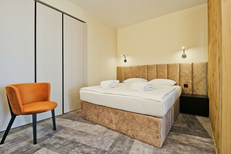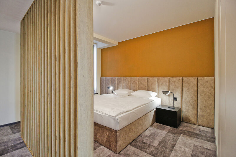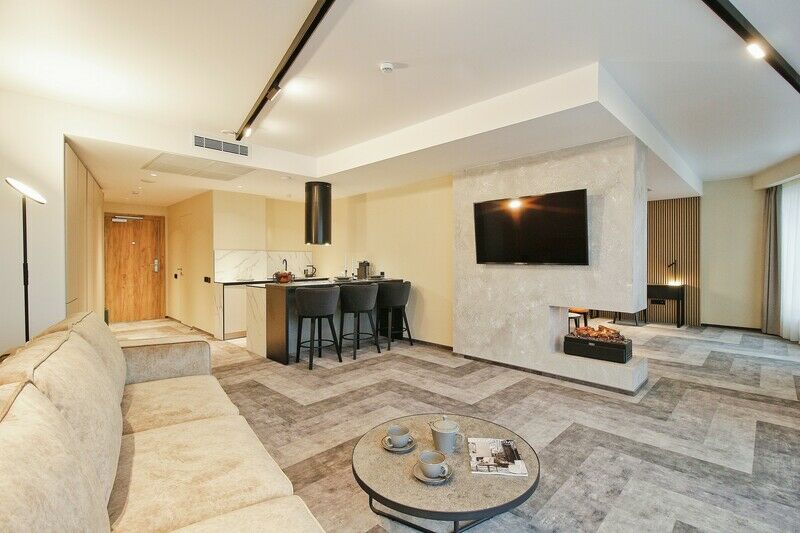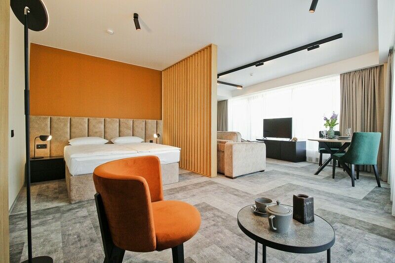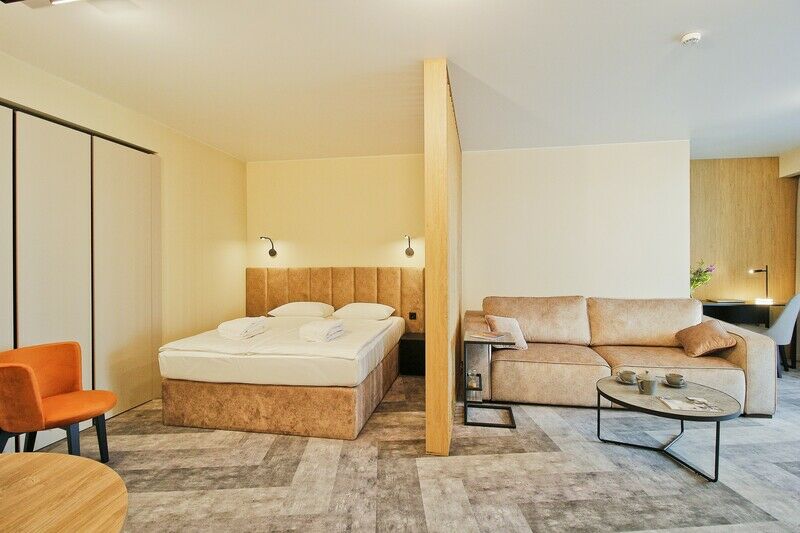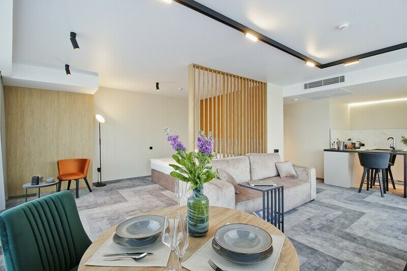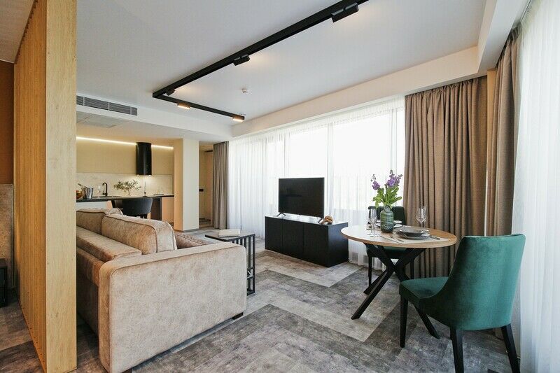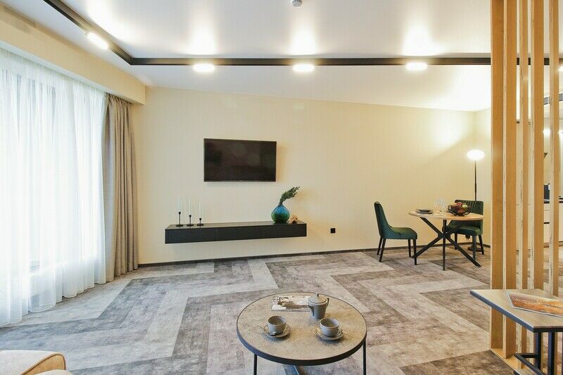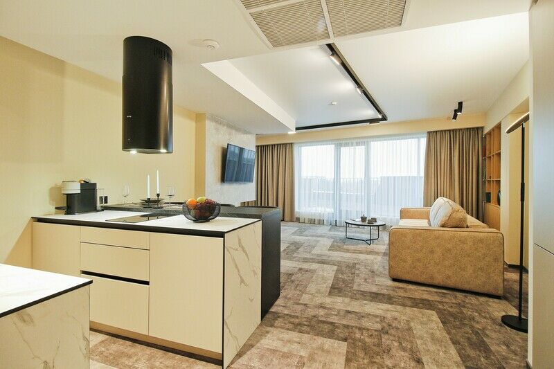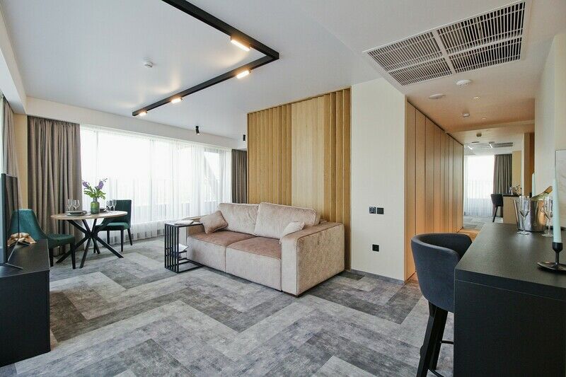 Гости, путешествующие самостоятельно, пары и семьи с детьми оценят комфортные номера, кровати с ортопедическими матрасами‚ помогающие расслабиться после длительного дня прогулок, а также полноценную кухонную зону, с полным набором посуды. Гости, путешествующие по работе, оценят беспроводной интернет на всей территории апартаментов и отдельное рабочее место. Все номера апарт-отеля раcположнены на 8 этаже с которого открывается потрясающий вид на город и реку.