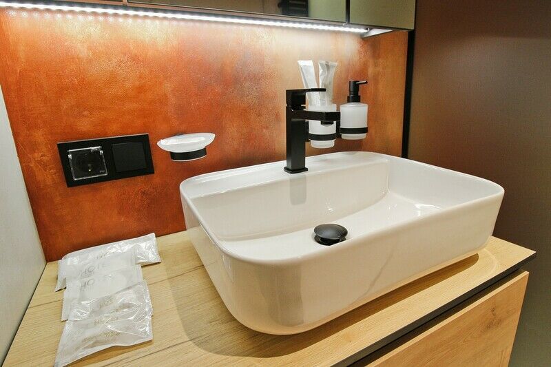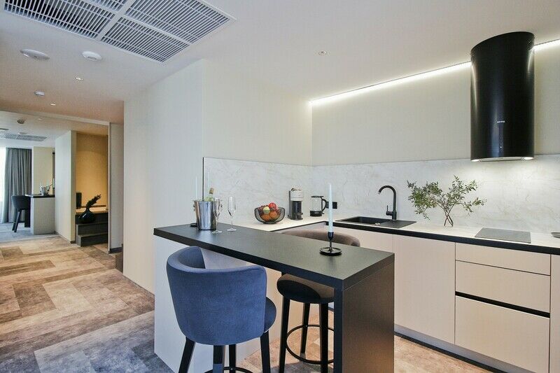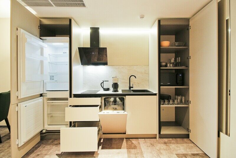 В номере имеется миникухня, оборудованная мини-варочной панелью, свч-печкой, посудомоечной машиной и кофемашиной, к которой прилагаются капсулы (если вы кофеман - попросите капсулы у горничной наперед в нужном количестве). Имеется посуда для готовки и сервировки, всевозможные бокалы и рюмки + мелочи от соли до штопора. Санузел также упакован по полной: фен, шампунь, гель для душа, разовые наборы для бритья и зубные щетки. Отсутствуют только женские прокладочки и разовые расчески.