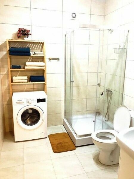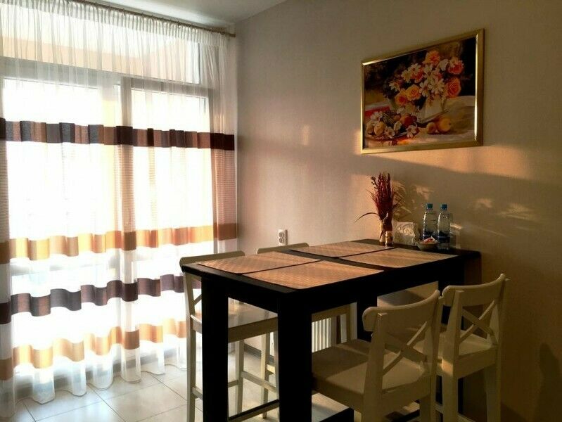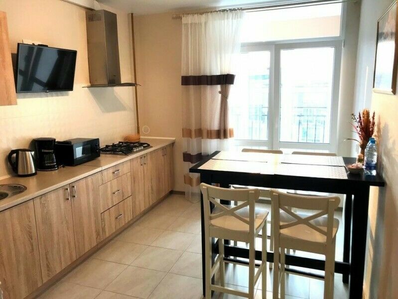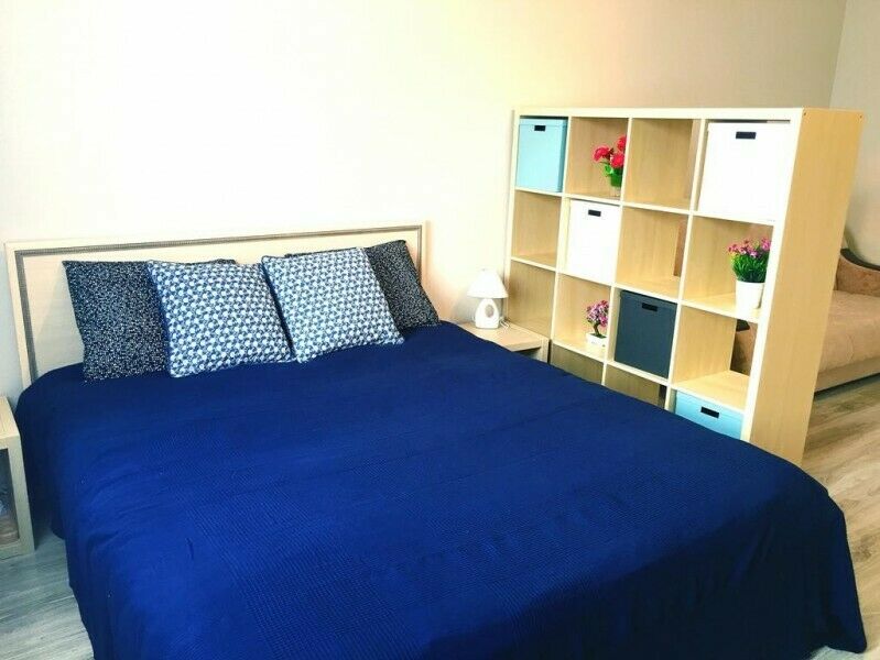 В апартаментах: двуспальная кровать, большой диван (раскладывается), гардеробная, книжный столик, тумба под ТВ, кухонные стол и стулья, встроенная кухня, прихожая.