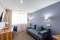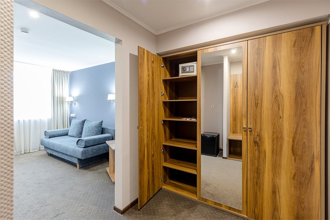 Двухкомнатный двухместный номер общей площадью 34 кв. м. с собственной ванной комнатой. В номере имеется спальня с двуспальной кроватью (возможен вариант двух односпальных кроватей), а также гостиная комната, где расположен диван и письменный стол.