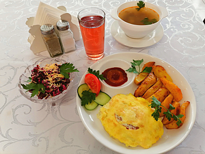 Если у Вас запланирован поздний выезд из гостиницы после закрытия кафе и Вы не успеваете поужинать, у Вас есть возможность заказать сухой ужин с собой. Для этого необходимо обратиться к официанту кафе накануне выезда.