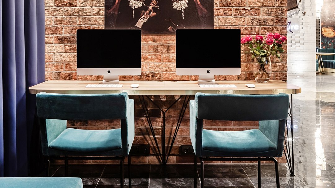 Переговорная комната площадью 25 м2, рассадка за общим столом на 12 персон.