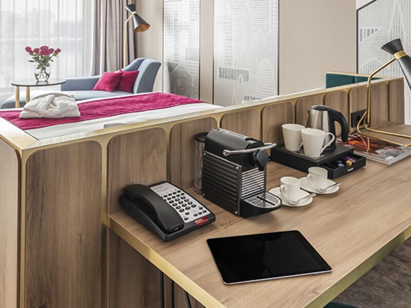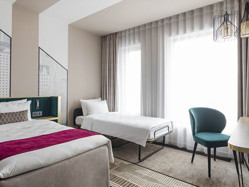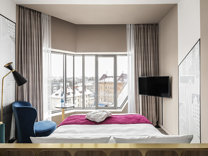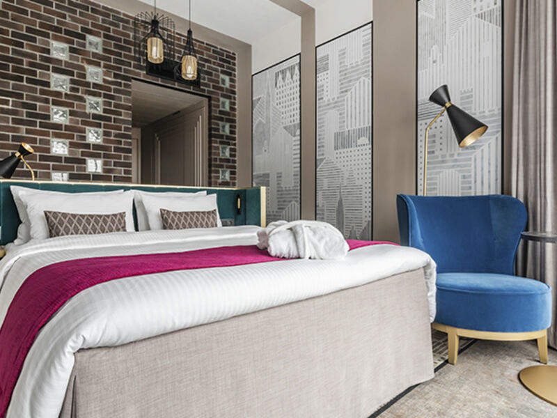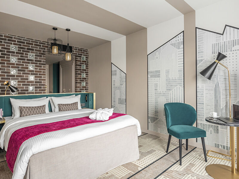 Современный и уютный номер с видом на центральную часть города располагает всем необходимым для комфортного отдыха: светлые и теплые цвета с яркими акцентами, удобные кровать и кресло, эргономичное рабочее место с Wi-Fi, сейф и тропический душ.