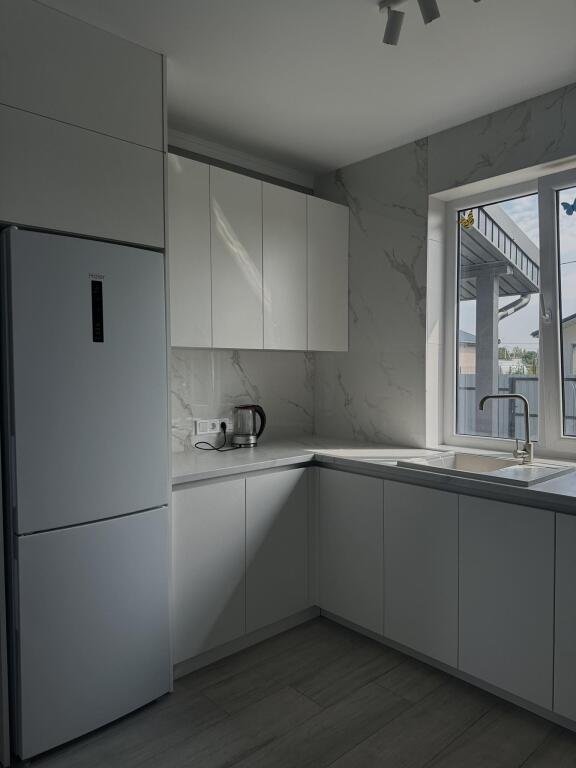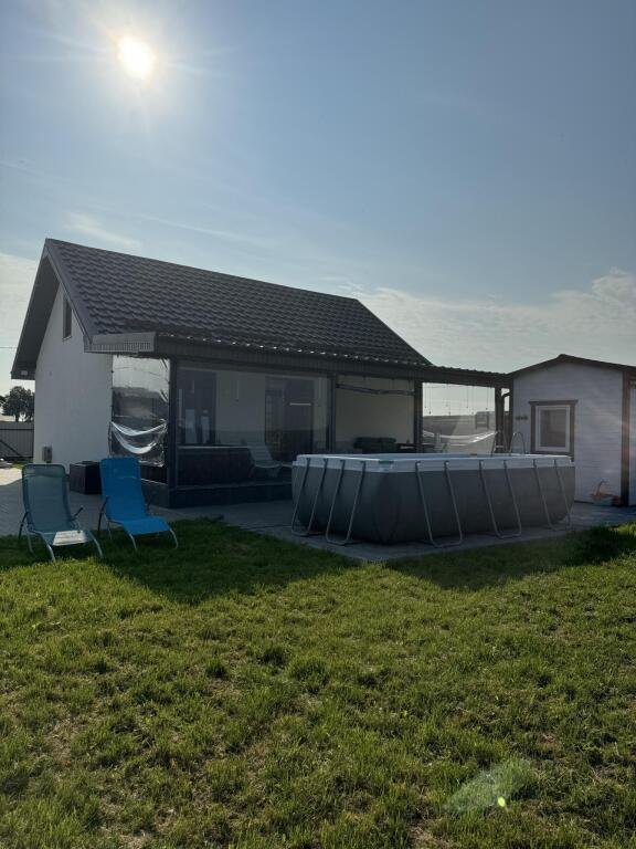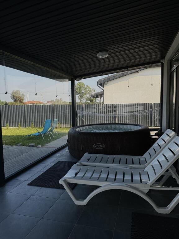 Возможно проживание 4 человек. В частном доме имеется: закрытая терраса, купель с аэромассажем и хромотерапией, баня с душевой и горячей водой, крытая мангальная зона с печью, мангалом, шампурами и казаном, качели.
