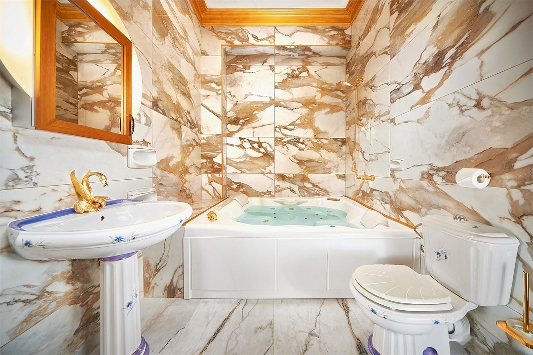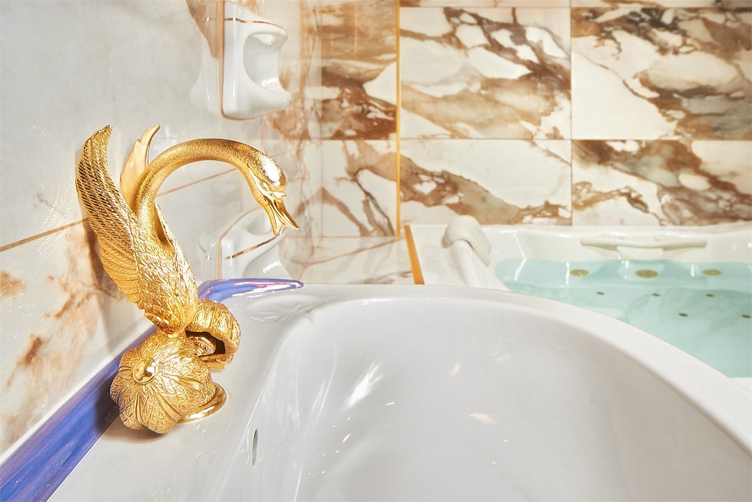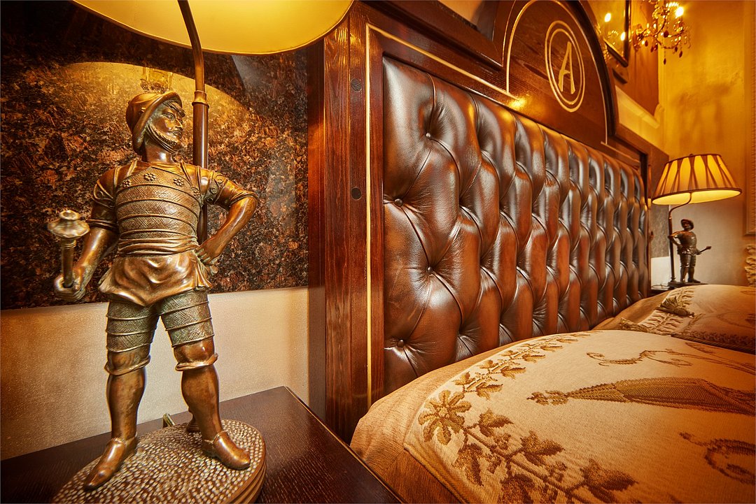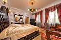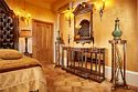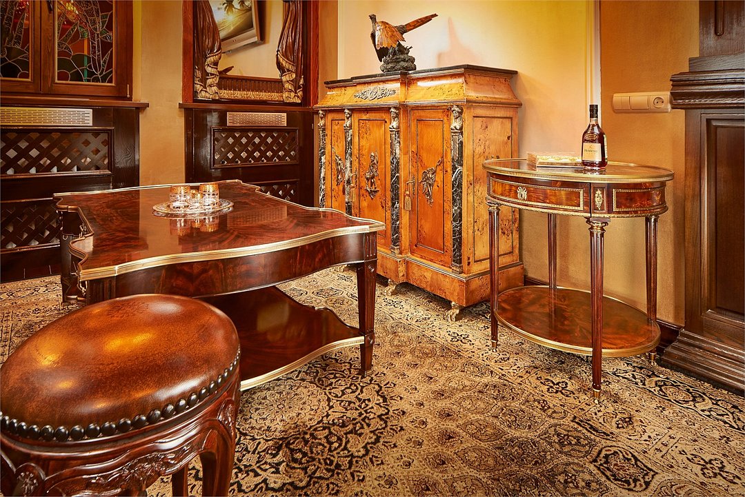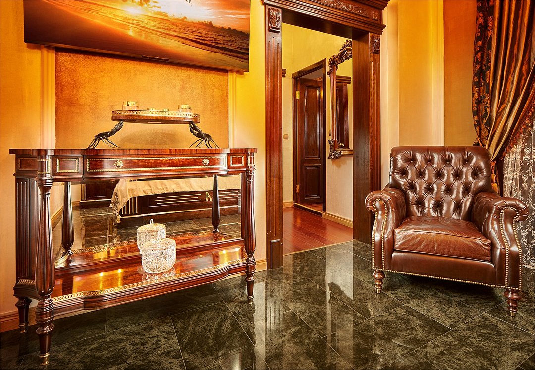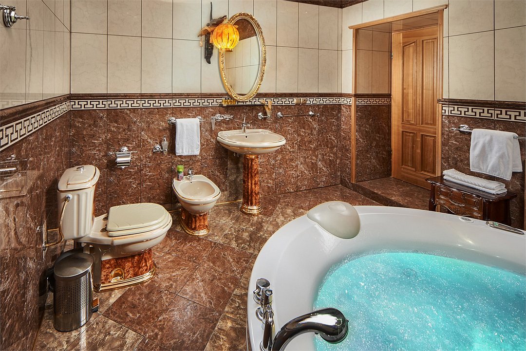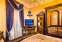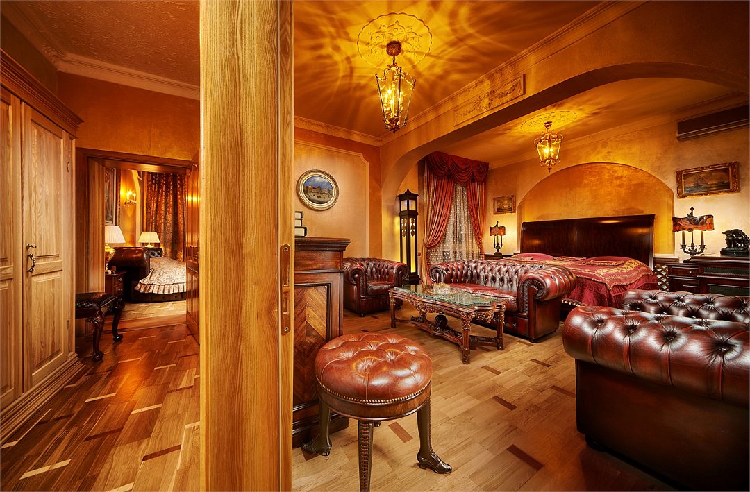 Двухуровневые апартаменты королевский люкс с гидромассажной ванной. общей площадью 60 квадратных метров, вилла рассчитана на двух человек. номер состоит: из каминного зала, спальни, и ванной комнаты. Роскошный интерьер создаёт ту степень фешенебельности, которую могут позволить себе аристократы. В ванной комнате установлена джакузи итальянской фирмы GLASS, объемом 400 литров - неотъемлемое условие для комфорта высокого уровня. Королевские апартаменты оборудованы, дорогой мебелью и декорирован предметами интерьера с ручной резьбой: бук, красное дерево, карельская береза, дуб. Авторские витражи, мозаики, люстры фирмы Swarovski придают интерьеру завершенность и уникальность. Бар в холодильнике платный.Услуги и удобства
