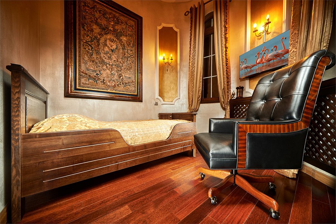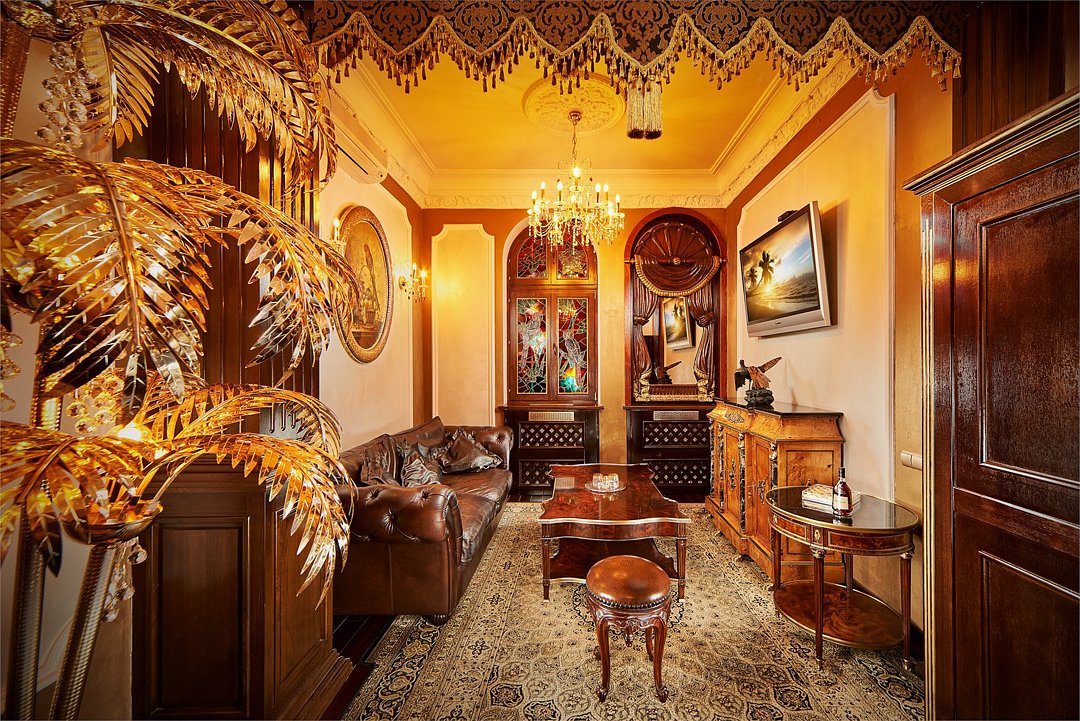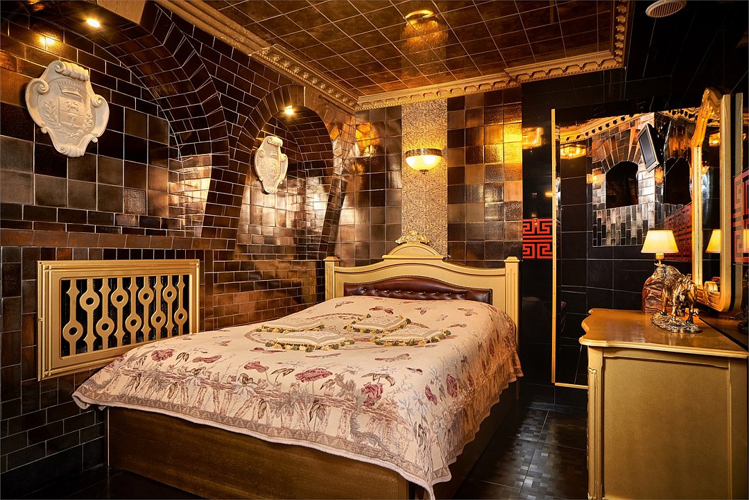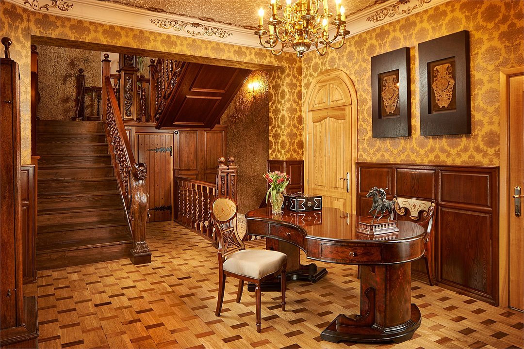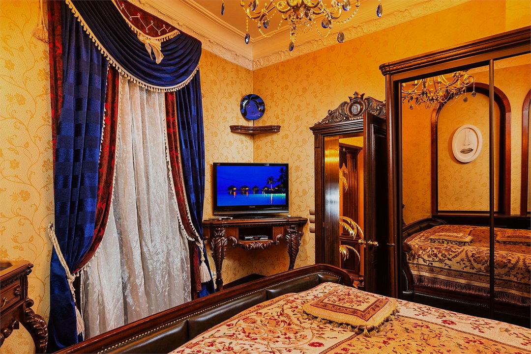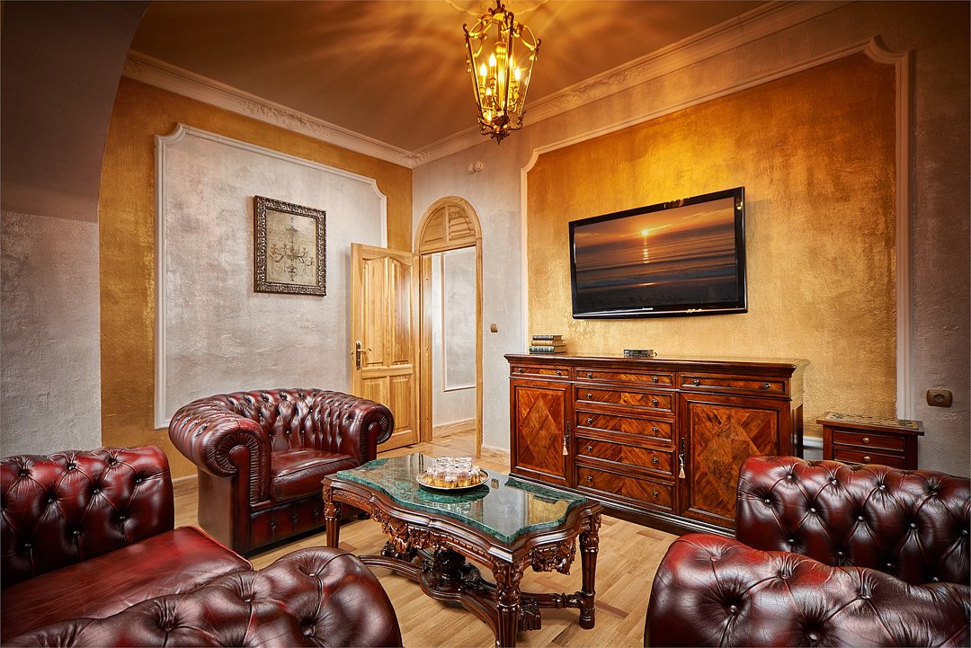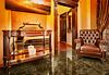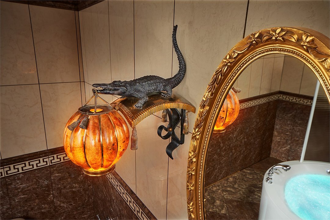 Двухуровневые апартаменты королевский люкс с гидромассажной ванной. общей площадью 60 квадратных метров, вилла рассчитана на двух человек. номер состоит: из каминного зала, спальни, и ванной комнаты. Роскошный интерьер создаёт ту степень фешенебельности, которую могут позволить себе аристократы. В ванной комнате установлена джакузи итальянской фирмы GLASS, объемом 400 литров - неотъемлемое условие для комфорта высокого уровня. Королевские апартаменты оборудованы, дорогой мебелью и декорирован предметами интерьера с ручной резьбой: бук, красное дерево, карельская береза, дуб. Авторские витражи, мозаики, люстры фирмы Swarovski придают интерьеру завершенность и уникальность. Бар в холодильнике платный.Услуги и удобства