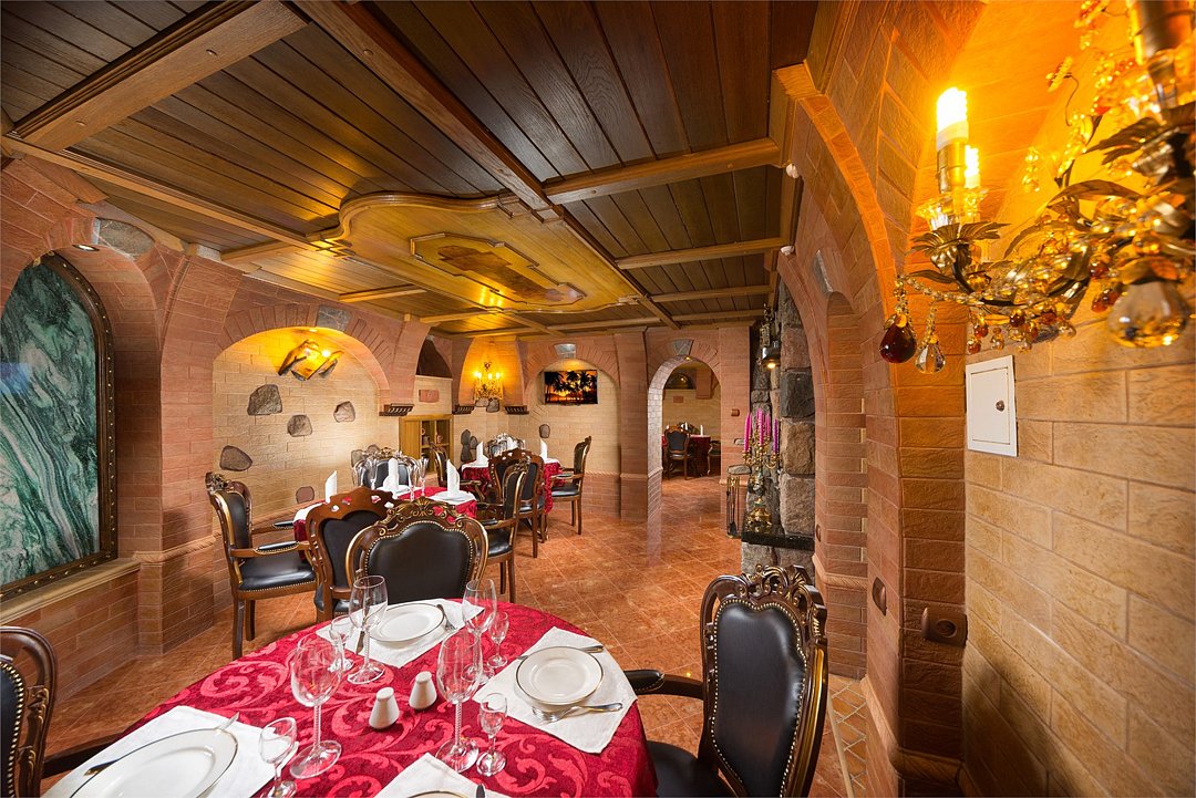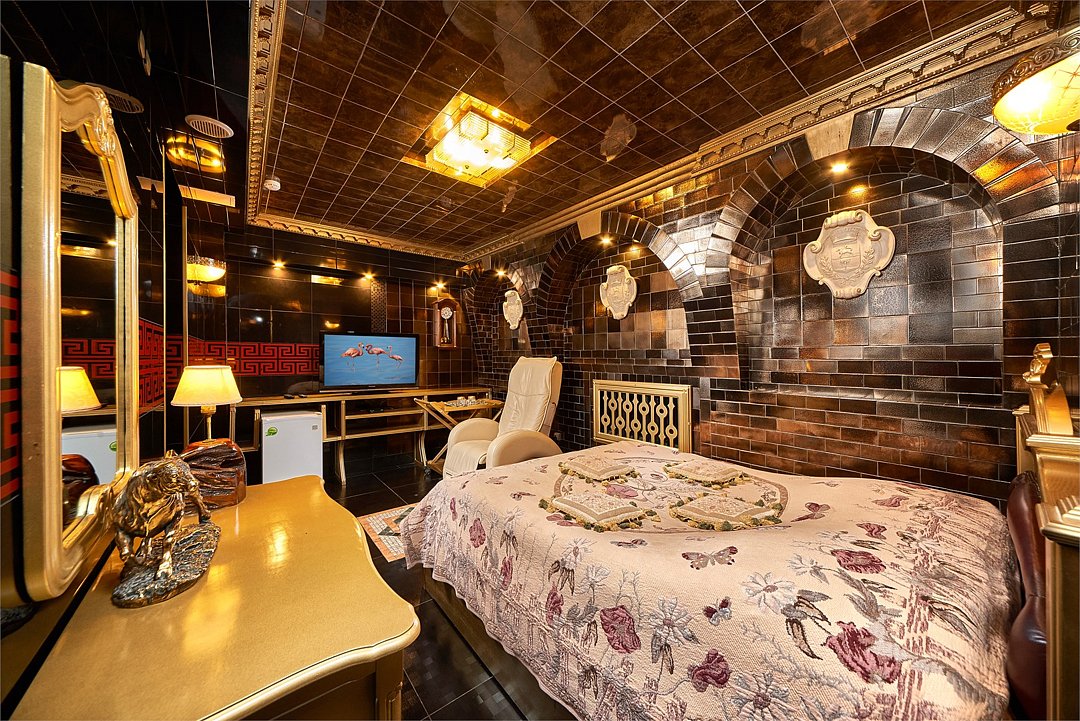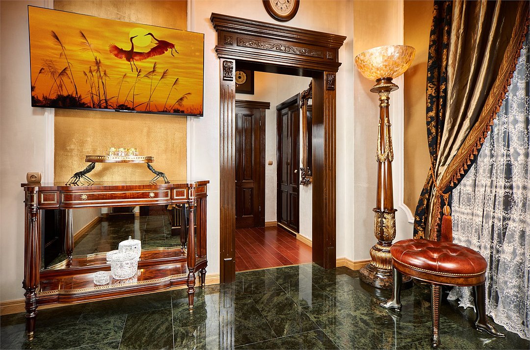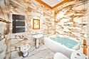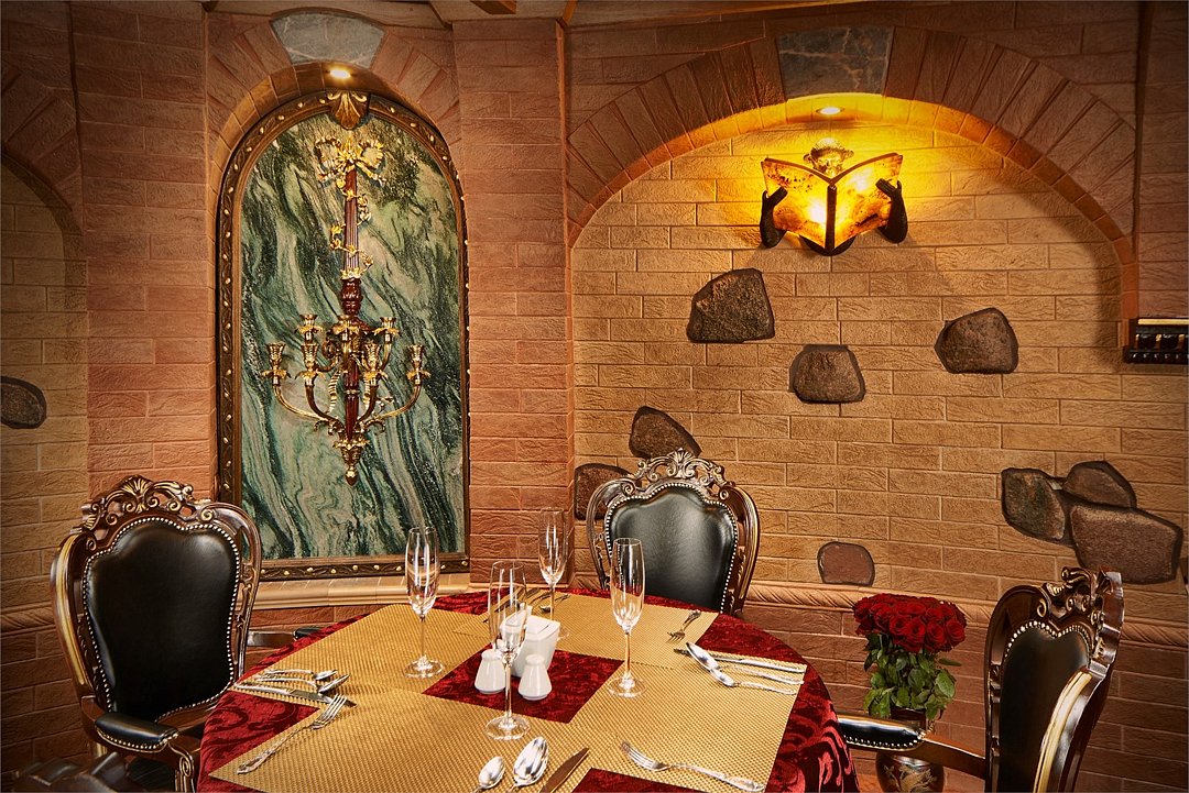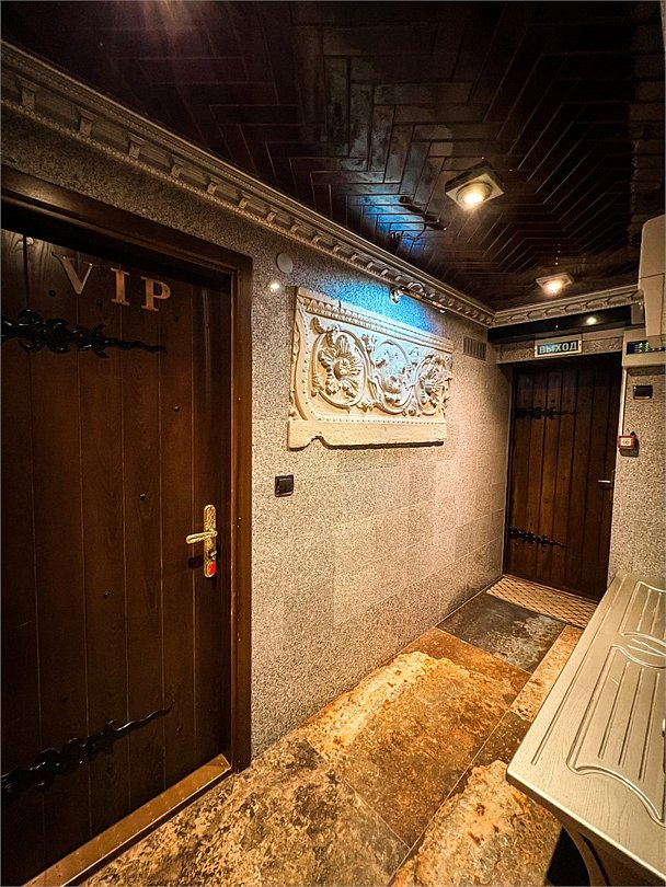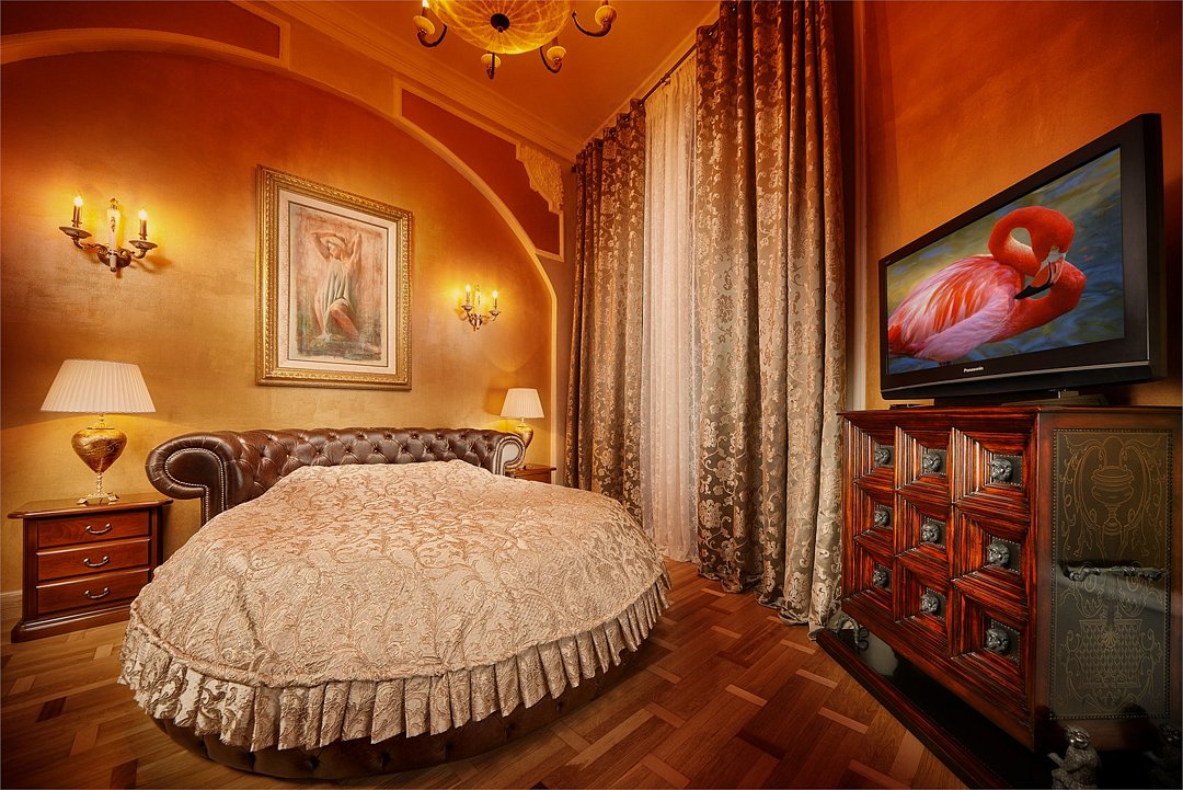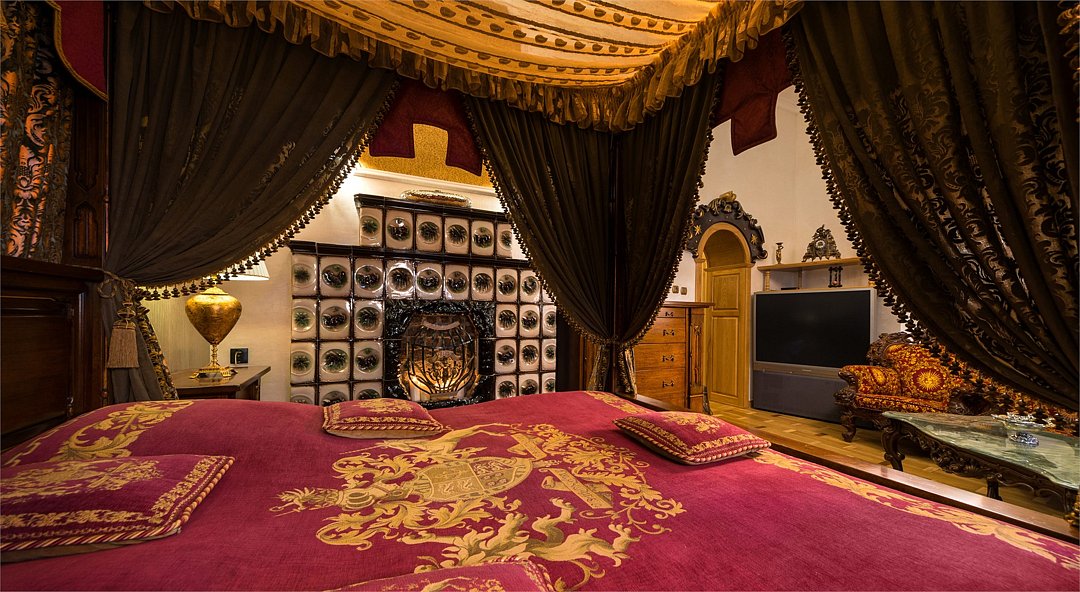 Двухуровневые апартаменты королевский люкс с гидромассажной ванной. общей площадью 60 квадратных метров, вилла рассчитана на двух человек. номер состоит: из каминного зала, спальни, и ванной комнаты. Роскошный интерьер создаёт ту степень фешенебельности, которую могут позволить себе аристократы. В ванной комнате установлена джакузи итальянской фирмы GLASS, объемом 400 литров - неотъемлемое условие для комфорта высокого уровня. Королевские апартаменты оборудованы, дорогой мебелью и декорирован предметами интерьера с ручной резьбой: бук, красное дерево, карельская береза, дуб. Авторские витражи, мозаики, люстры фирмы Swarovski придают интерьеру завершенность и уникальность. Бар в холодильнике платный.Услуги и удобства