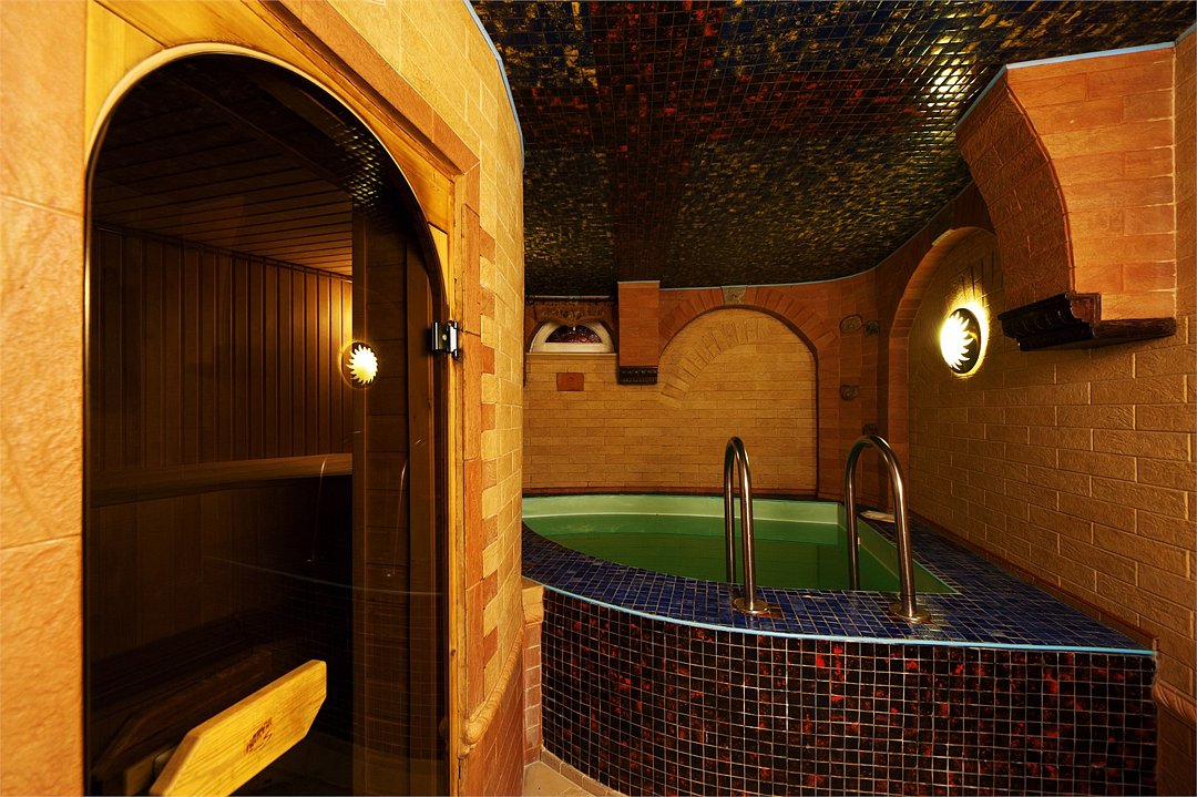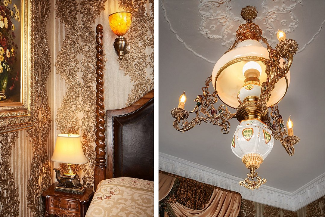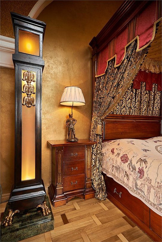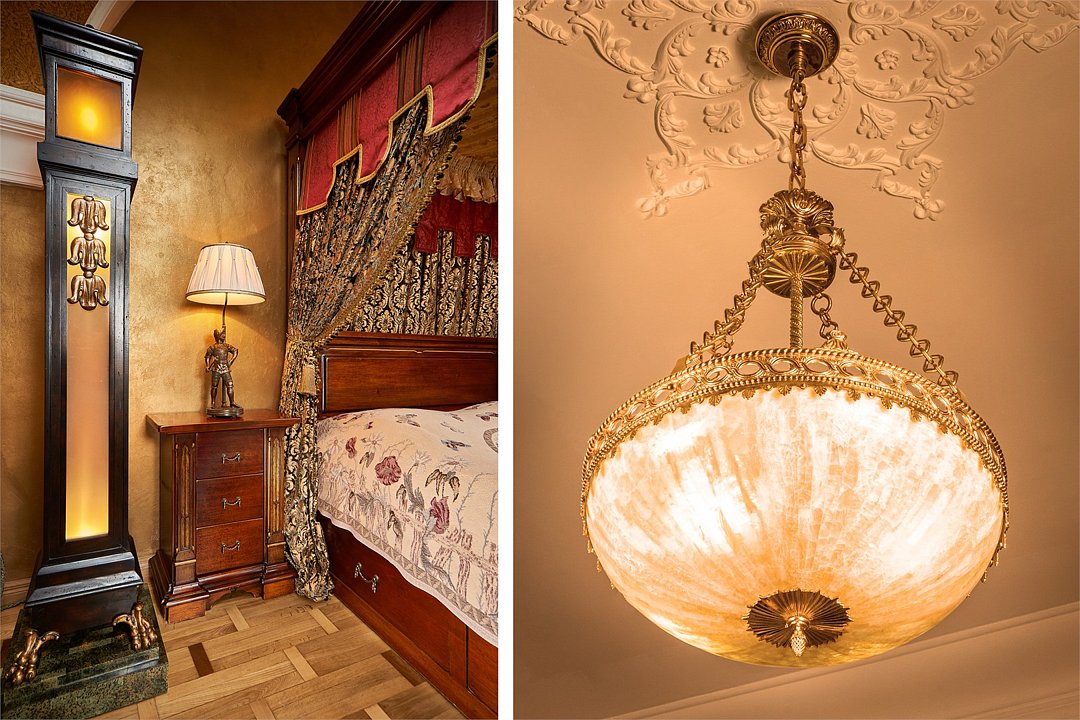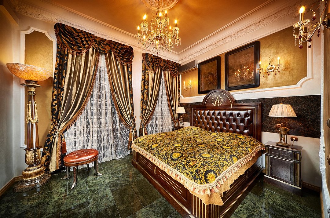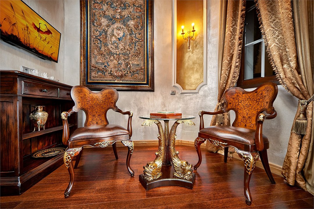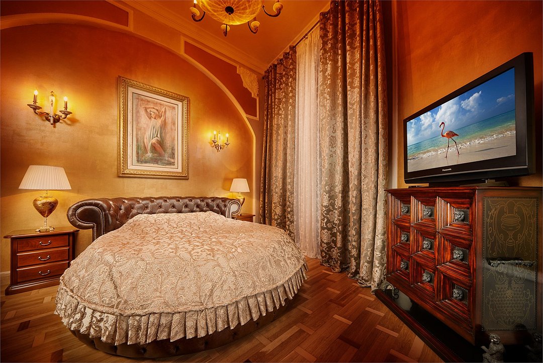 Двухуровневые апартаменты королевский люкс с гидромассажной ванной. общей площадью 60 квадратных метров, вилла рассчитана на двух человек. номер состоит: из каминного зала, спальни, и ванной комнаты. Роскошный интерьер создаёт ту степень фешенебельности, которую могут позволить себе аристократы. В ванной комнате установлена джакузи итальянской фирмы GLASS, объемом 400 литров - неотъемлемое условие для комфорта высокого уровня. Королевские апартаменты оборудованы, дорогой мебелью и декорирован предметами интерьера с ручной резьбой: бук, красное дерево, карельская береза, дуб. Авторские витражи, мозаики, люстры фирмы Swarovski придают интерьеру завершенность и уникальность. Бар в холодильнике платный.Услуги и удобства
