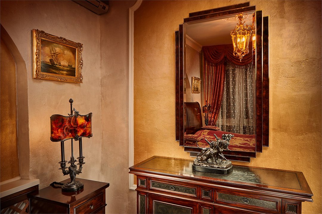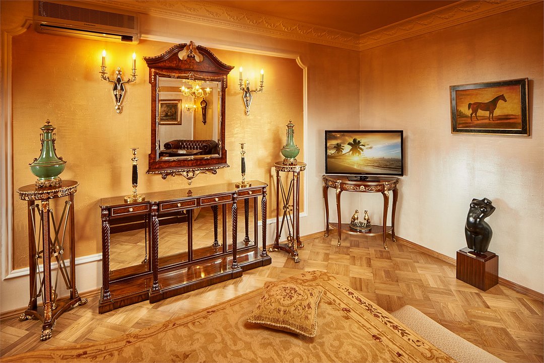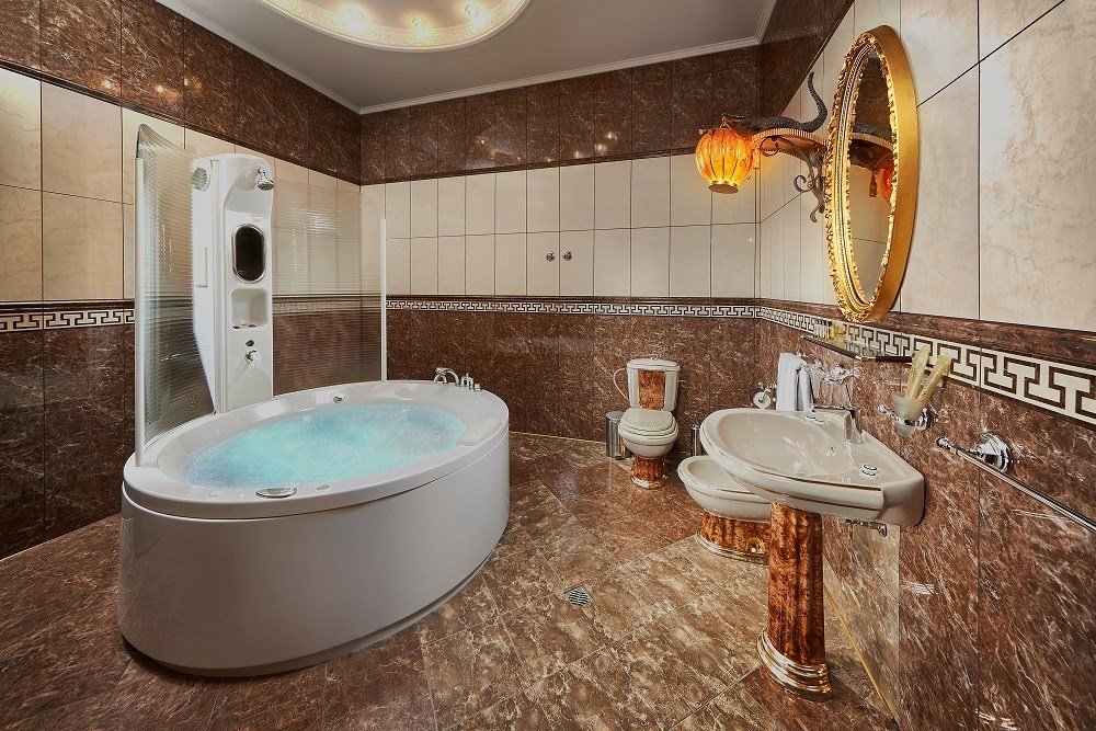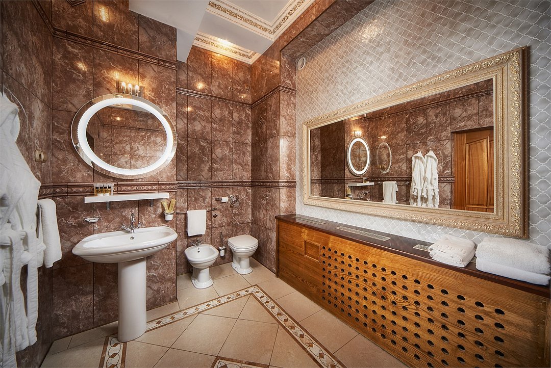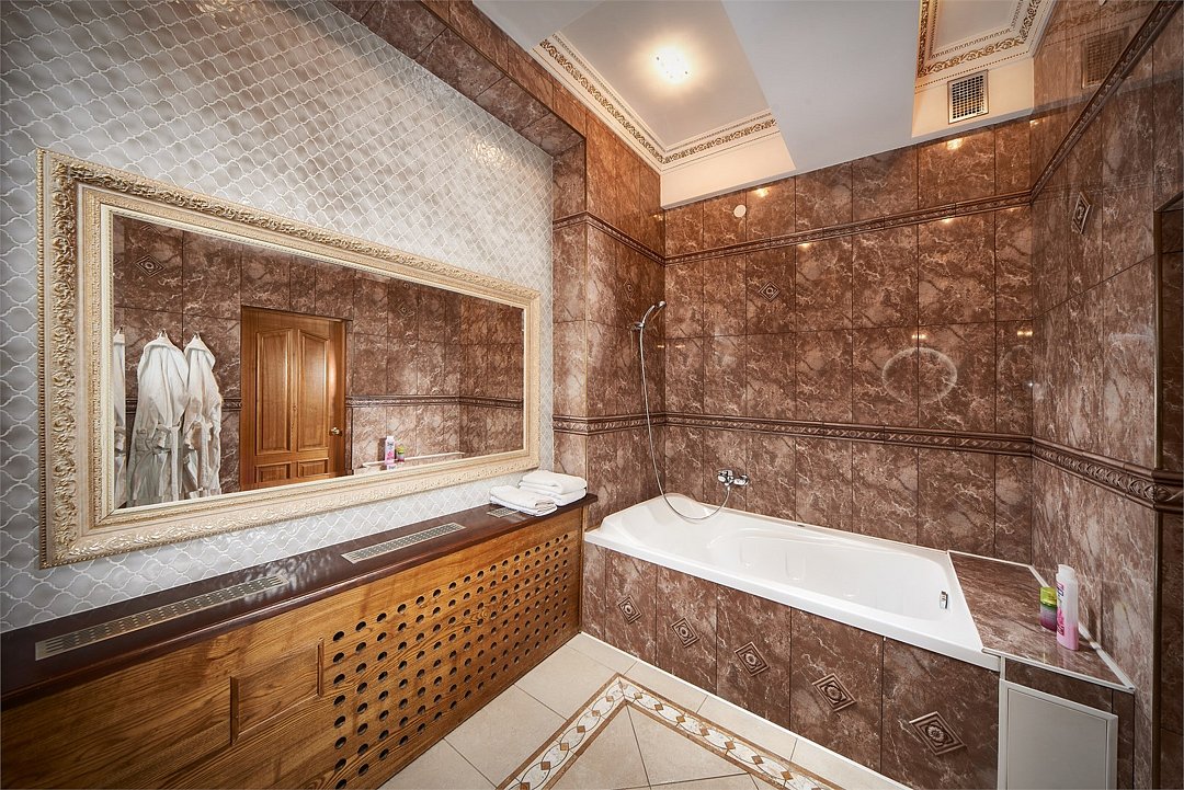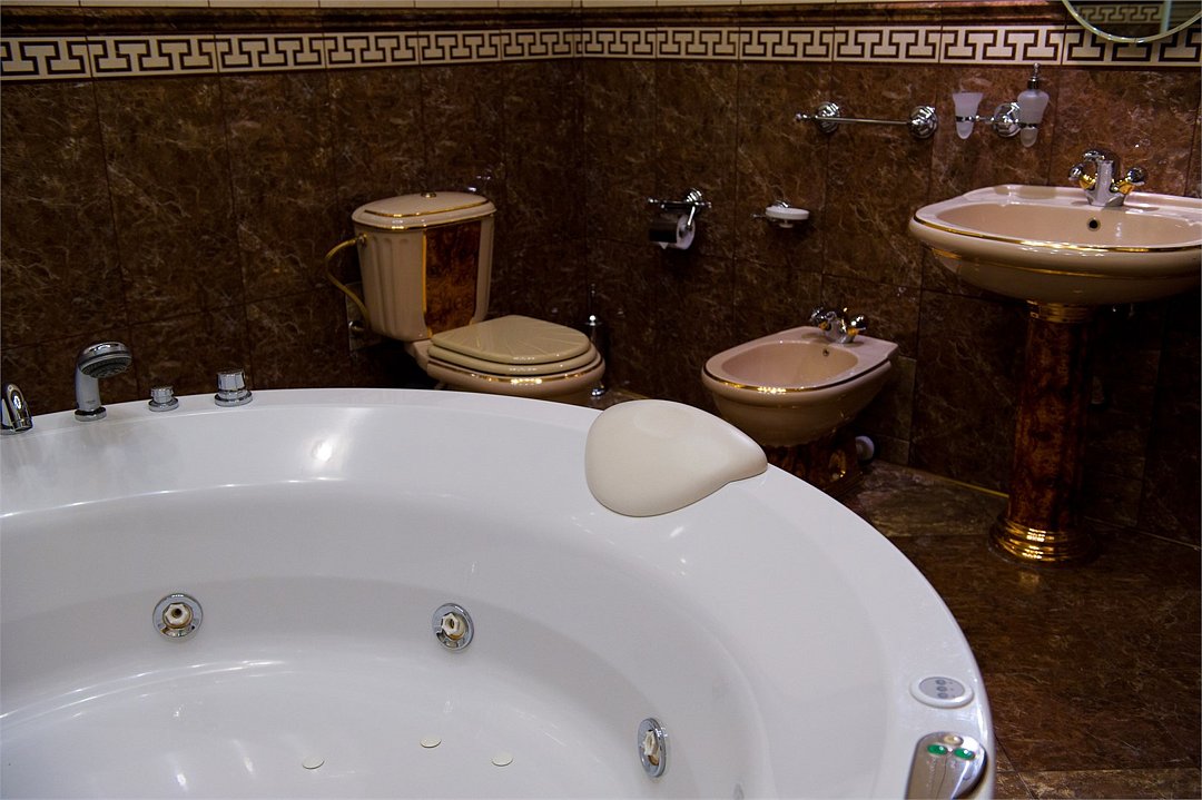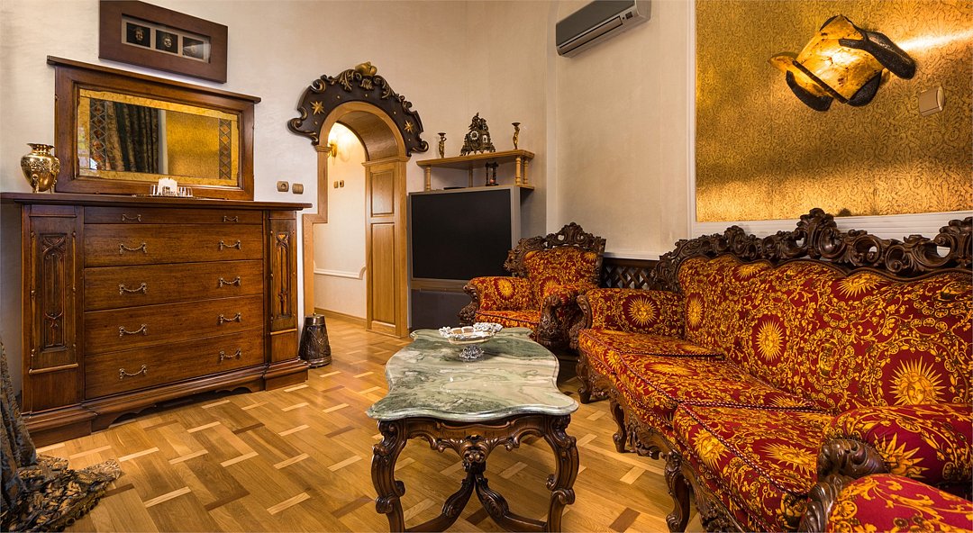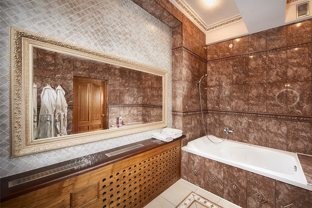 Апартаменты общей площадью 60 м2 " класса DeLux поразит Вас не только классическими интерьерами с итальянской и английской мебелью, но и роскошной ванной комнатой с элитной итальянской сантехникой "Ceramica Ala (Modellazione)". При этом королевой ванной комнаты, да и всего номера, является, конечно, джакузи итальянкой фирмы "Аlbatross" объёмом 400 литров. Расслабленный отдых после водного массажа вам обеспечит итальянский спальный гарнитур " с кроватью размера "king-size", а утром антикварные часы XIX века снова вернут вас в обстановку комфорта и роскоши. Не откажите себе в удовольствии окунуться в атмосферу наслаждения! Бар в холодильнике платный.Услуги и удобства