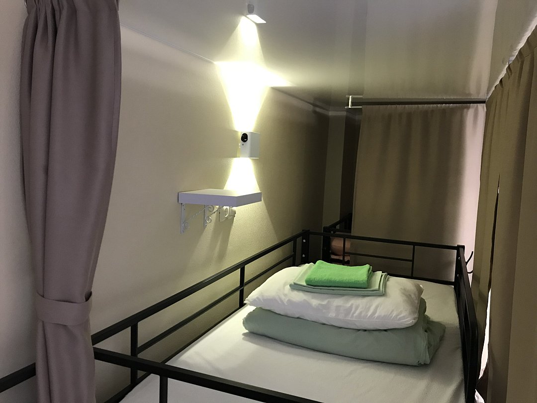 Верхние спальные места оборудованы полноценными боковыми лестницами, все кровати оборудованы постельными принадлежностями, полотенцем, индивидуальным освещением, полочками, шторками, розетками. Также есть все необходимое, газовая плита, электрический чайник, холодильник, стиральная машина, микроволновка, гладильная доска, утюг, индивидуальный закрывающийся шкафчик. В каждой комнате есть письменный стол, зеркало, фен, стулья. Ванная комната оборудована феном, установлены диспансеры с мылом для рук, гелем для тела. Также есть скоростной интернет Wi-Fi. Парковка во дворе.