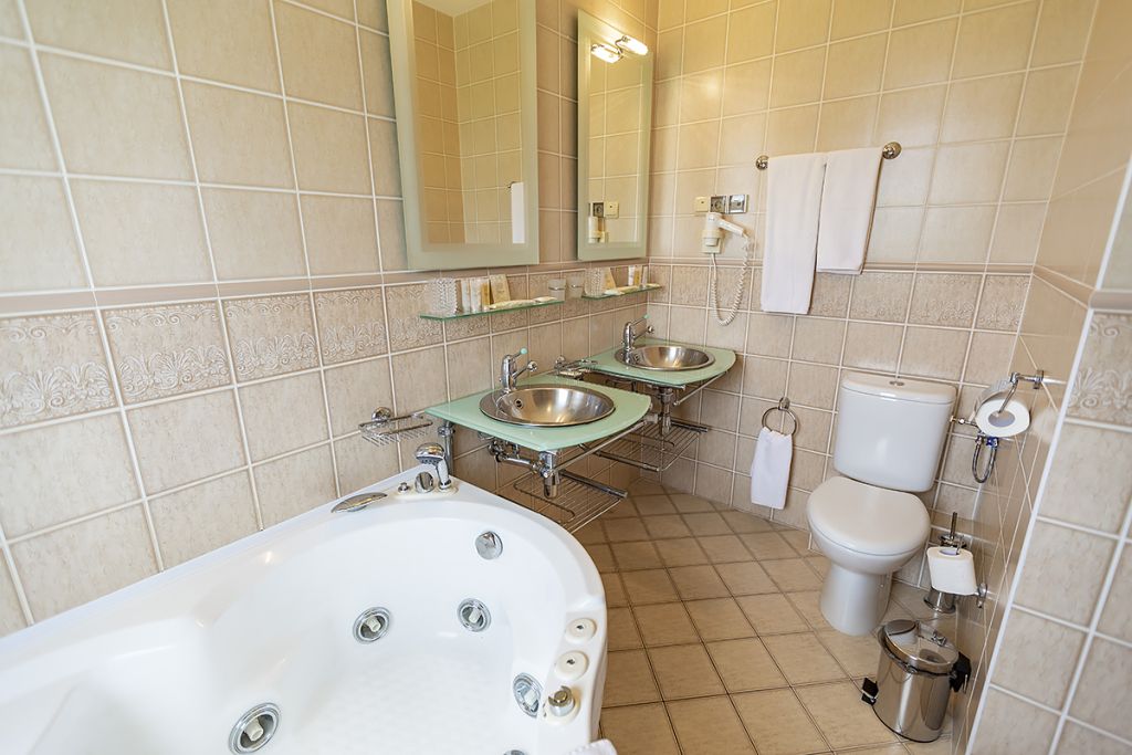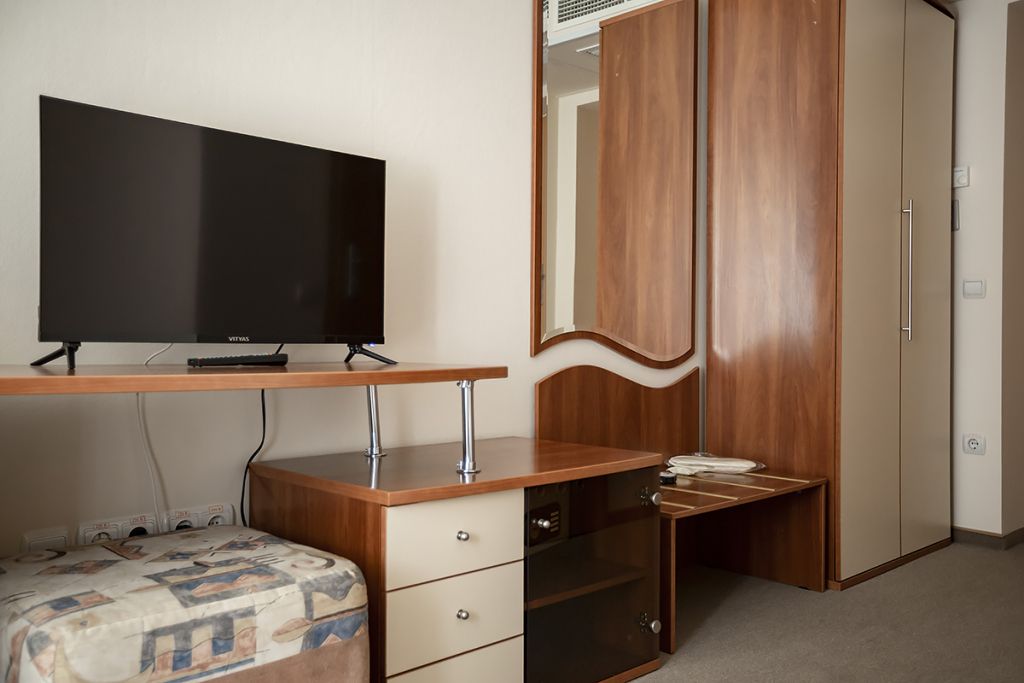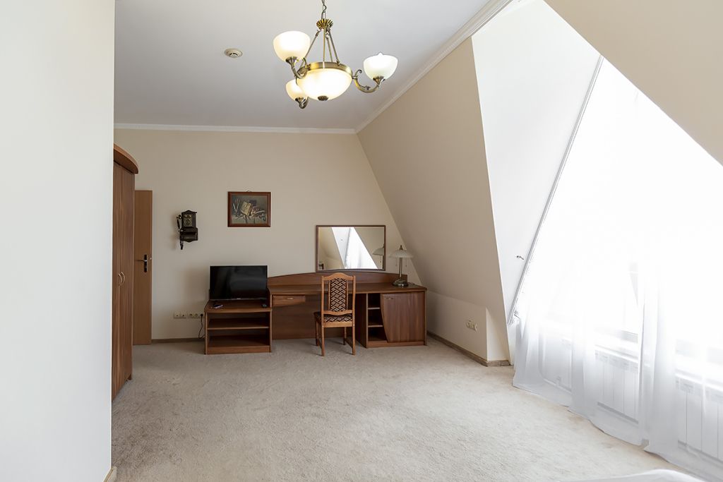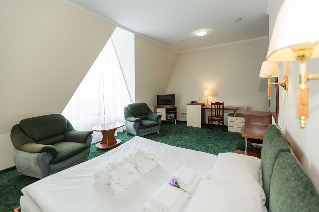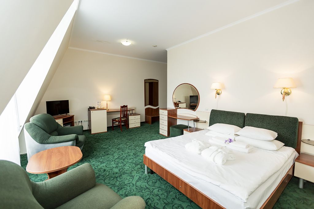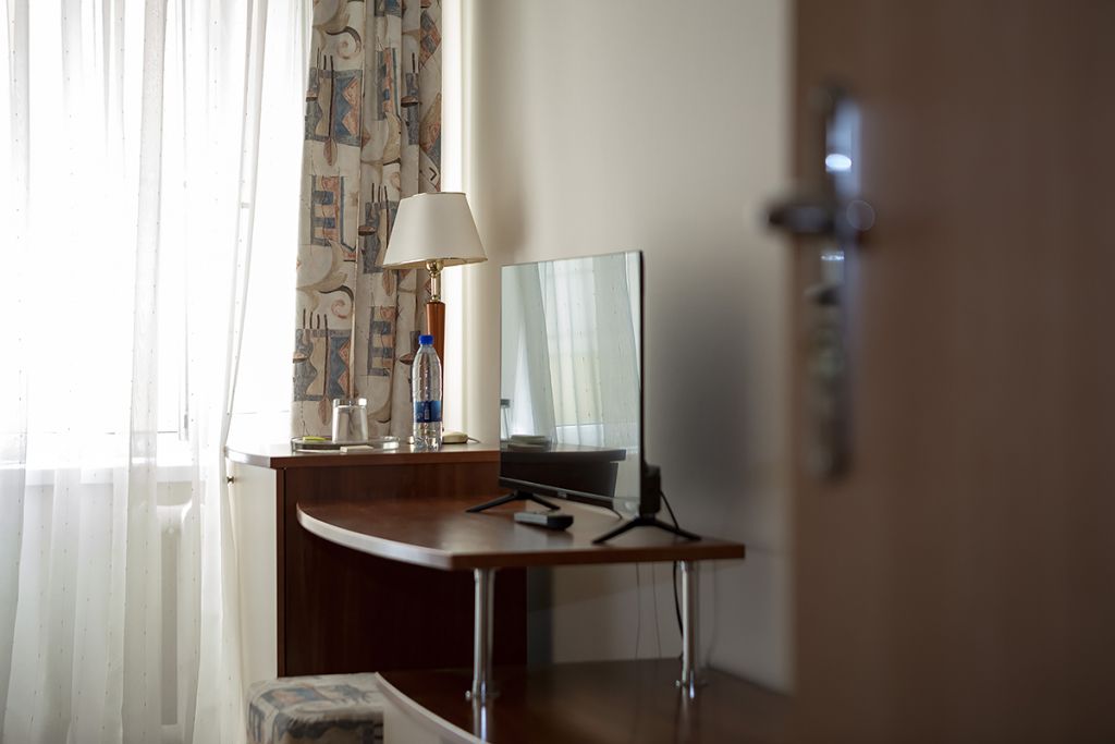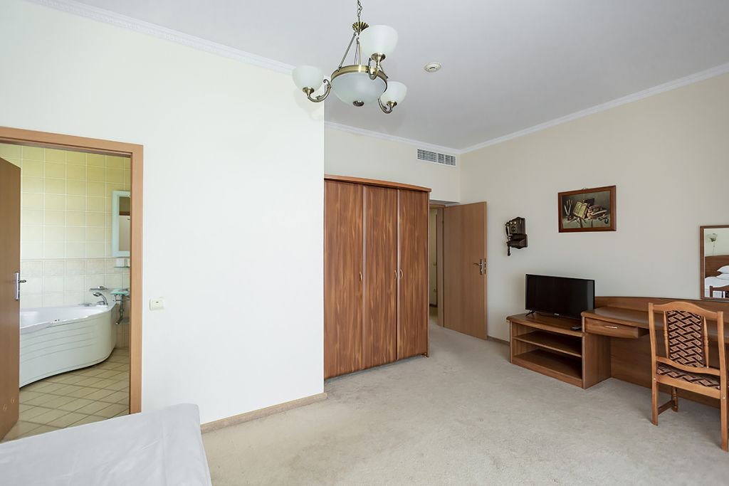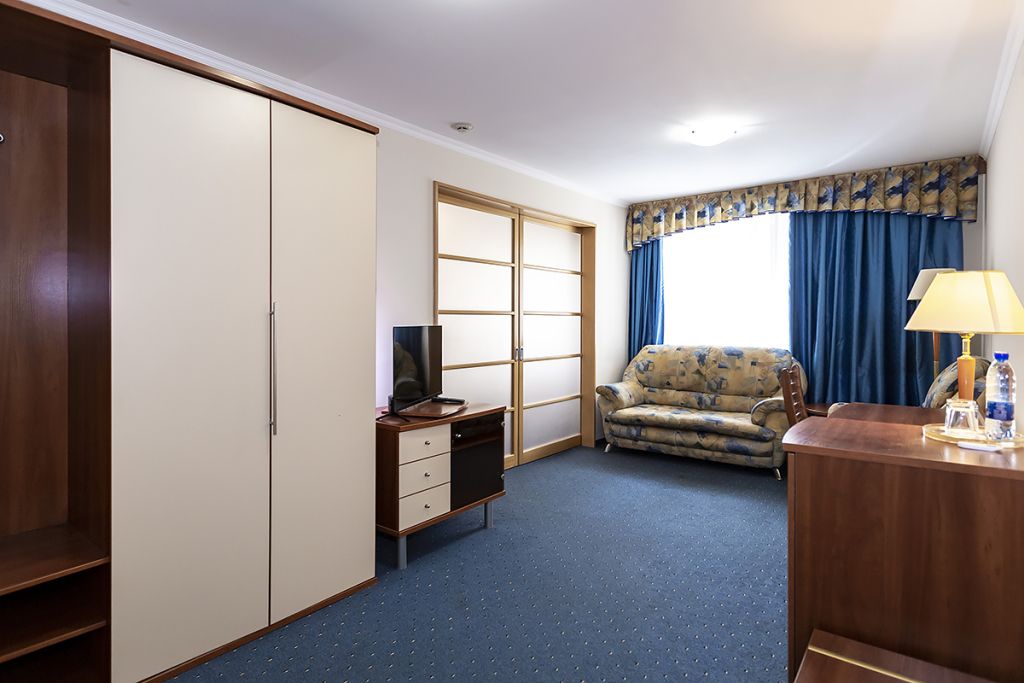 В номере: двуспальная кровать 145*200 см, ТВ, холодильник, сейф, одно кресло, рабочий стол, журнальный стол, настольная лампа, зеркало, кондиционер, система радиотрансляции, телефон.