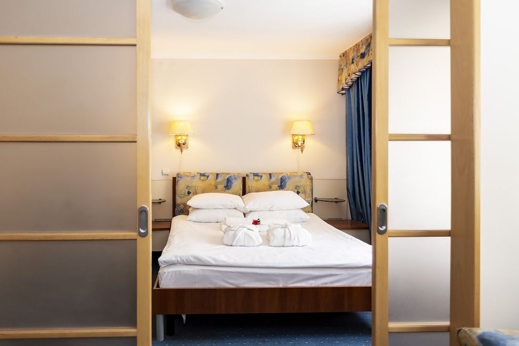 Номер с 2 раздельными комнатами, но трансформируется в двухкомнатный за счет передвижных перегородок.