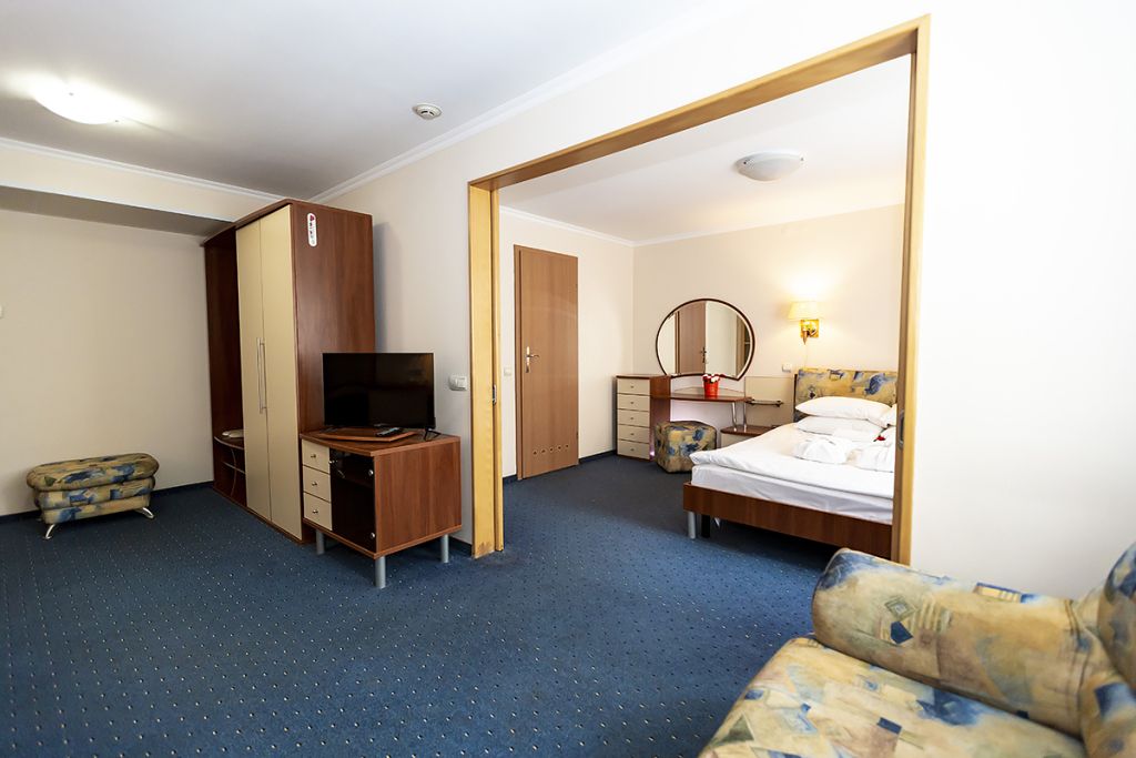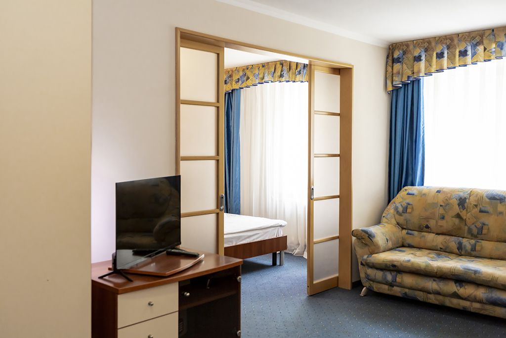 Двухкомнатные уютные номера, рассчитанные на проживание двух- четырех человек. В спальне располагается двуспальная кровать, в гостиной – раскладывающийся диван. Имеется возможность для дополнительного размещения взрослого или ребенка.